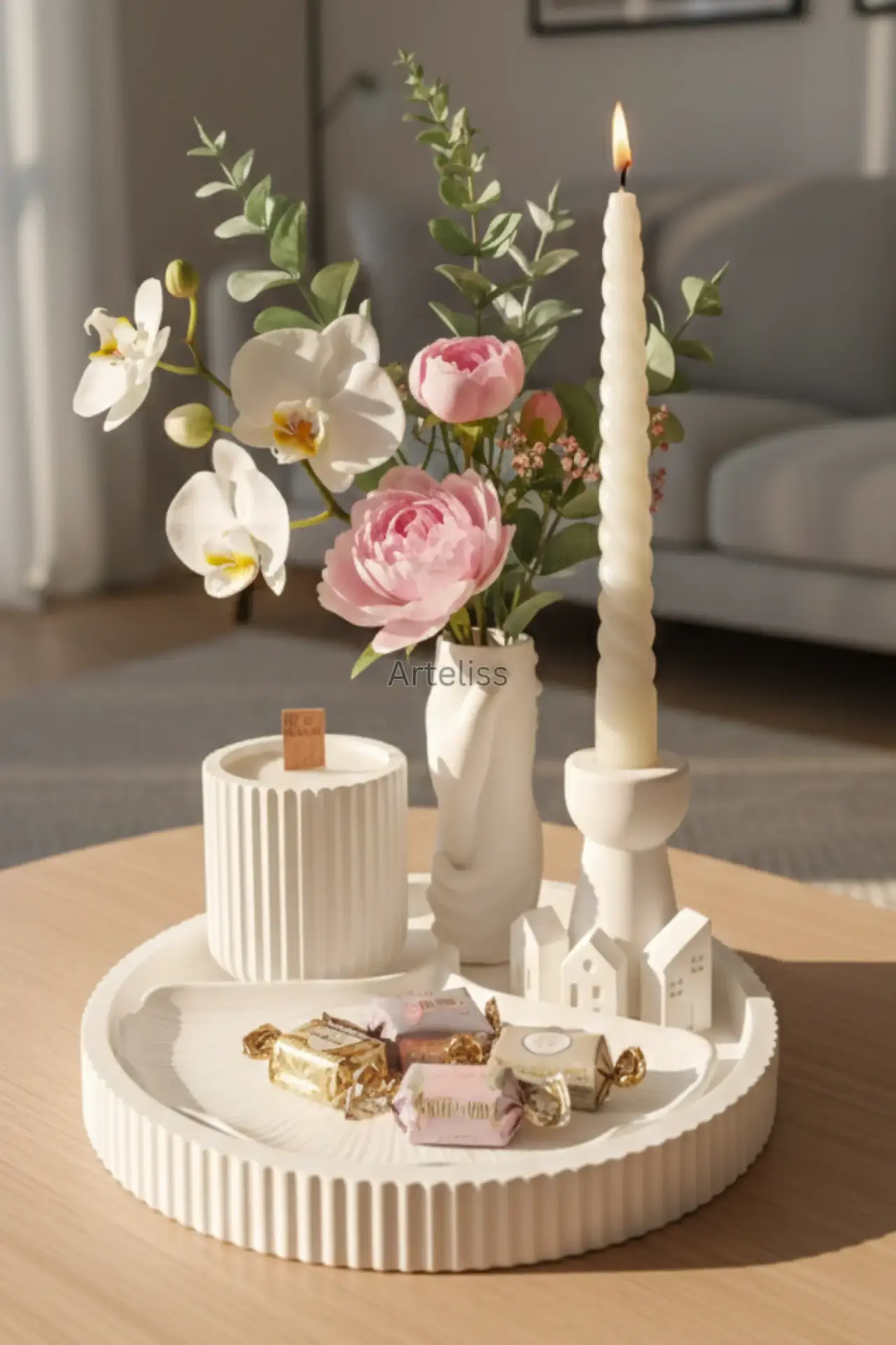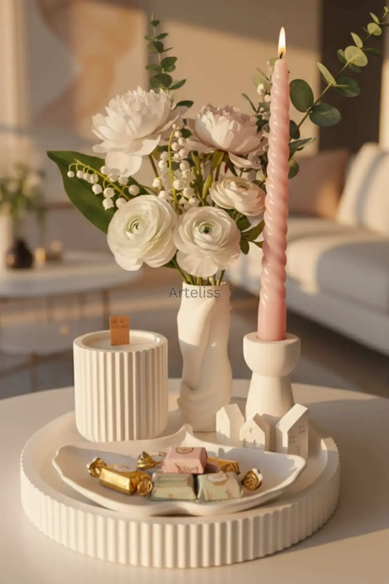 Modern Ev Dekorasyon Seti Bakım Önerisi: Ürününüzün formunu koruması için suyla direkt yıkamayınız. Nemli veya kuru bir bezle tozunu almanız yeterlidir. (Görsellerdeki çiçekler ve şekerler temsilidir.)