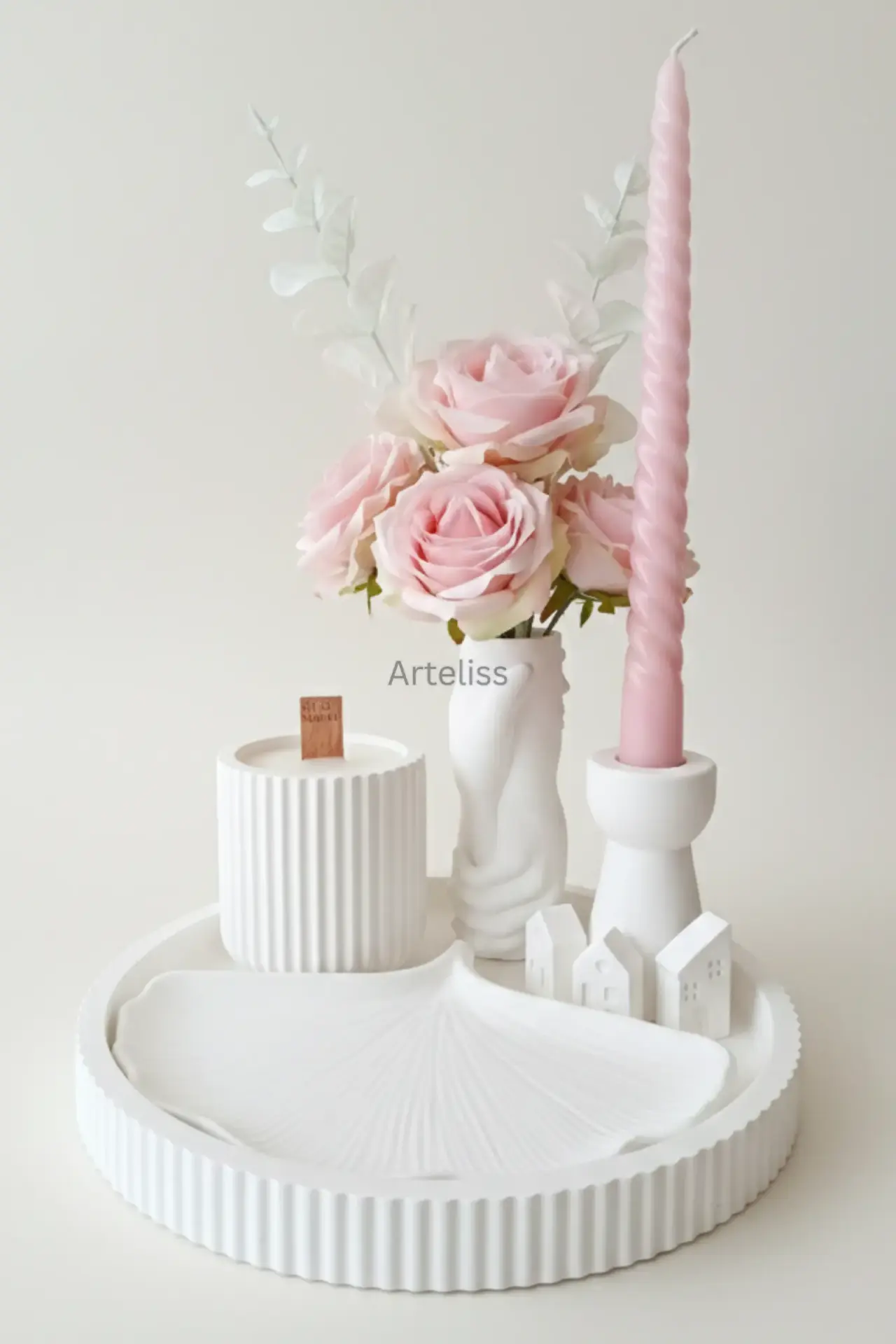 Arteliss® Amber Glow Modern Ev Dekorasyon Seti ile evinizde sıcak bir ışıltı yaratın. Organik amber aromalı ahşap fitilli doğal soya mum, sarılan el mini vazo, minimal şamdan, ginkgo tabak şekerlik ve 3 minyatür ev içeren bu modern ev dekorasyon seti, ahşap fitilli mumun yanarken çıkardığı hafif çıtırtı sesiyle şömine huzurunu evinize taşır.
