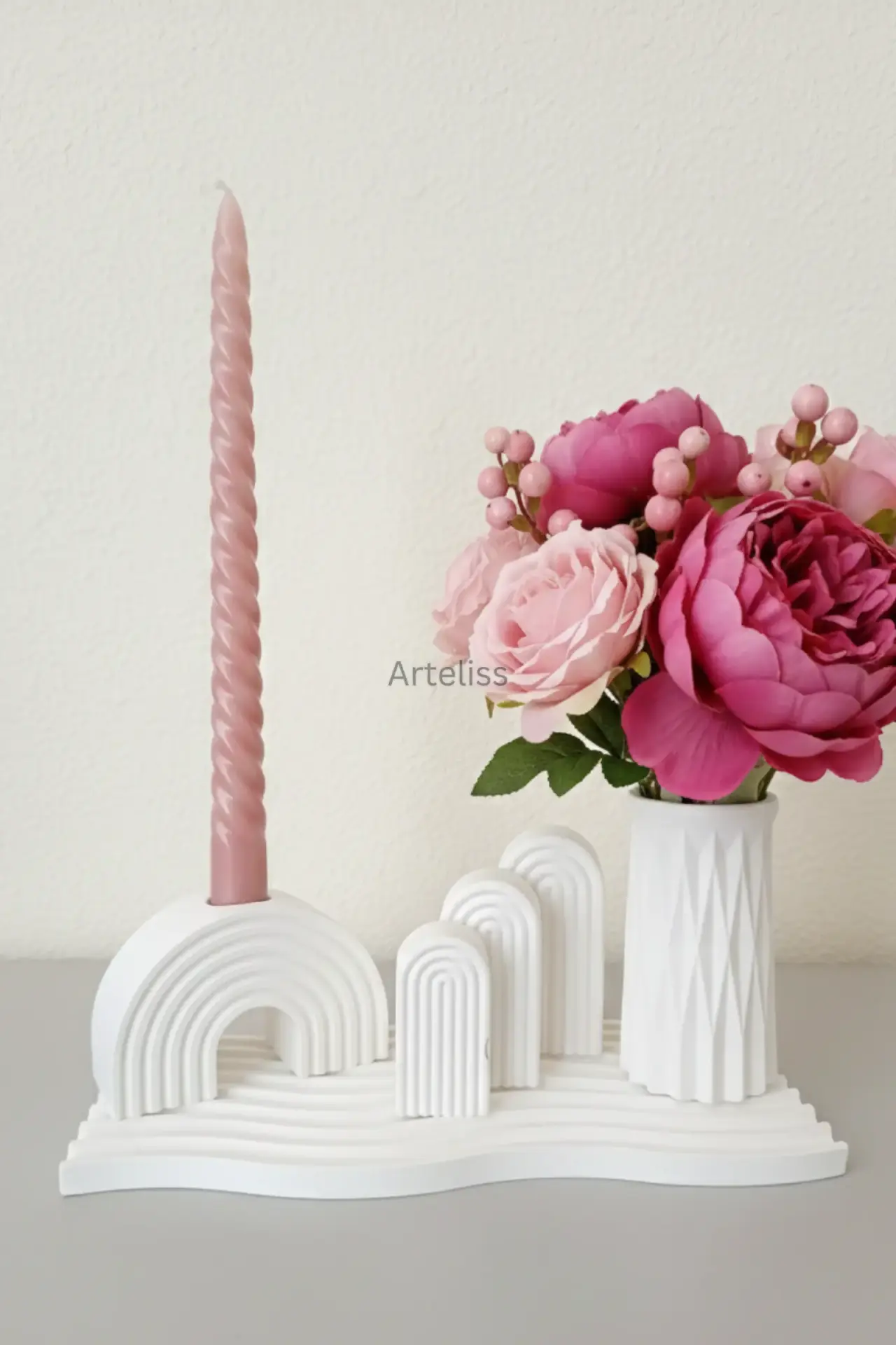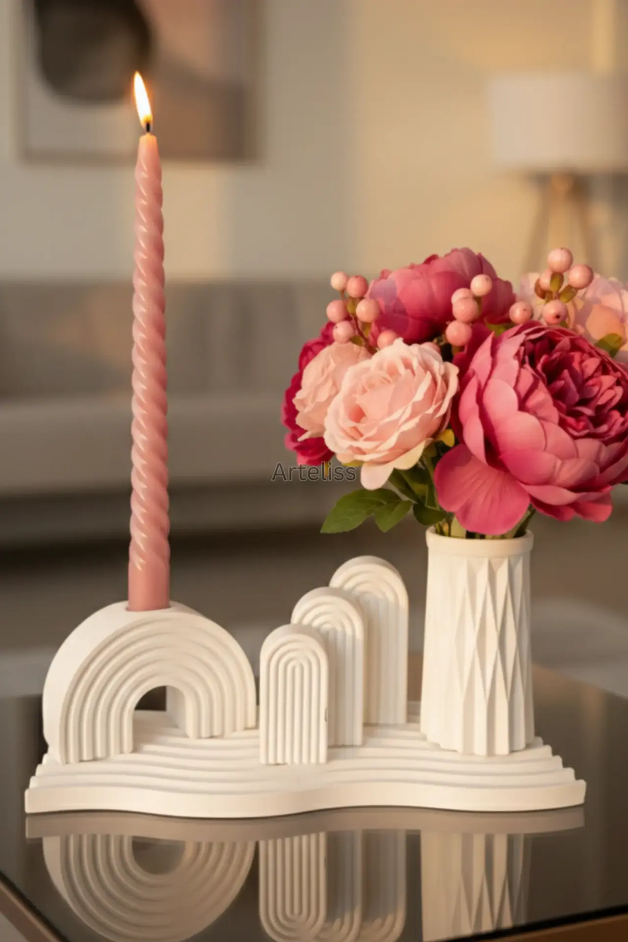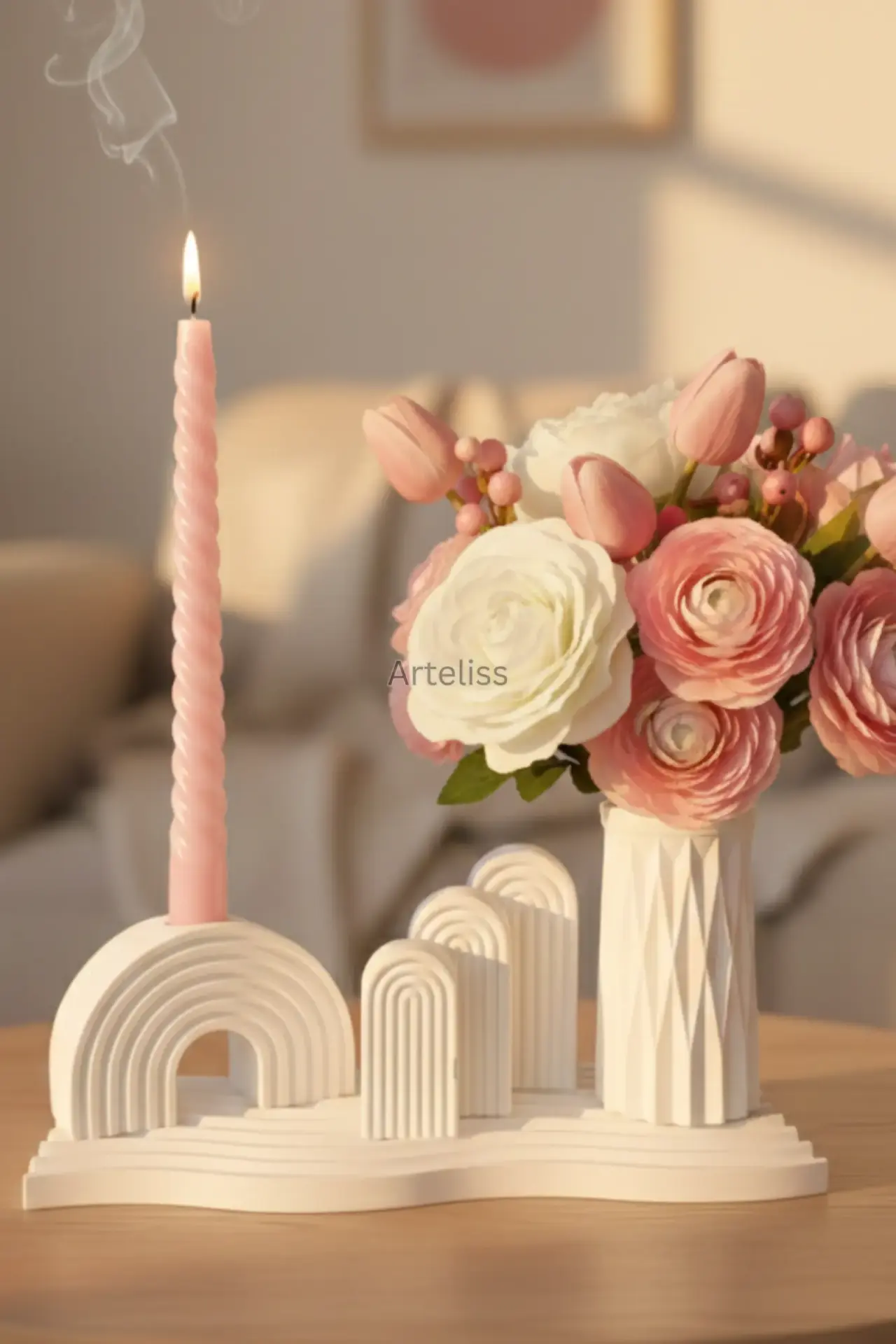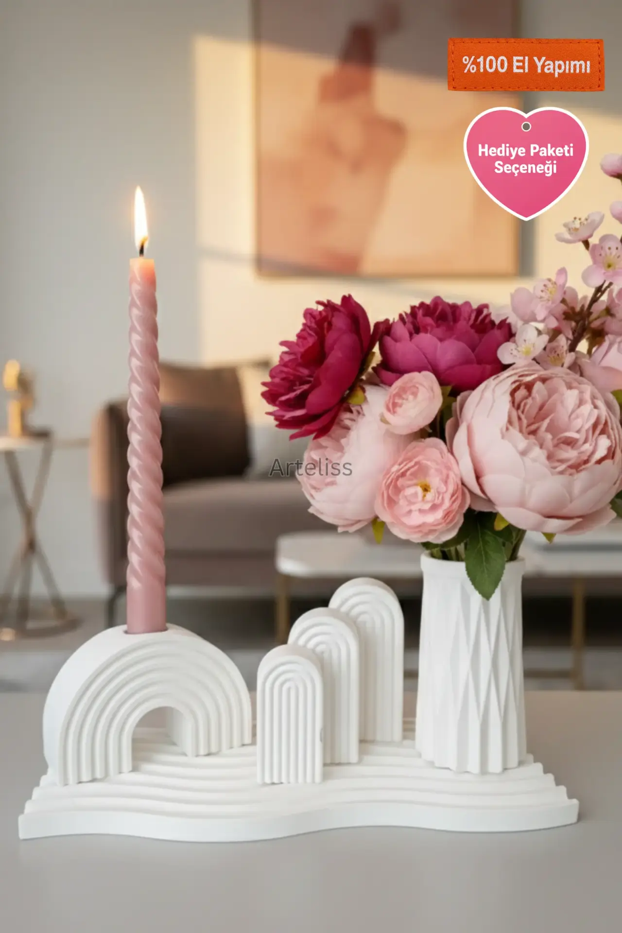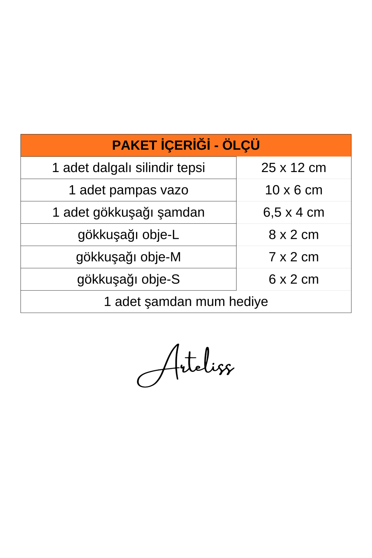 Arteliss® Arch Harmony Gökkuşağı Dekor set; farklı boyutlardaki üçlü kemer objesini ve keskin hatlı prizmatik vazoyu dalgalı bir sunum tepsisi üzerinde bir araya getirir. Modern mimariyi andıran katmanlı bir yapı sunan bu gökkuşağı dekor seti, dresuar ve orta sehpalar üzerinde sanatsal bir derinlik yaratmak için tasarlanmıştır.