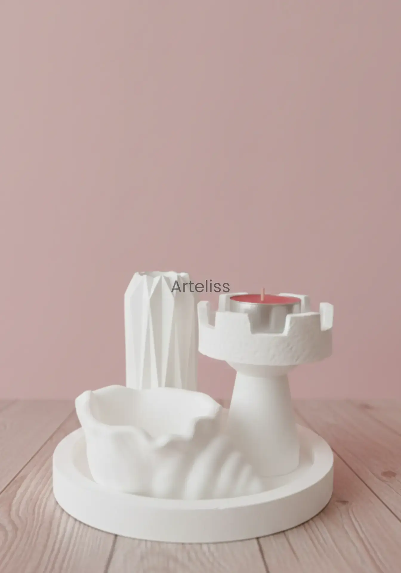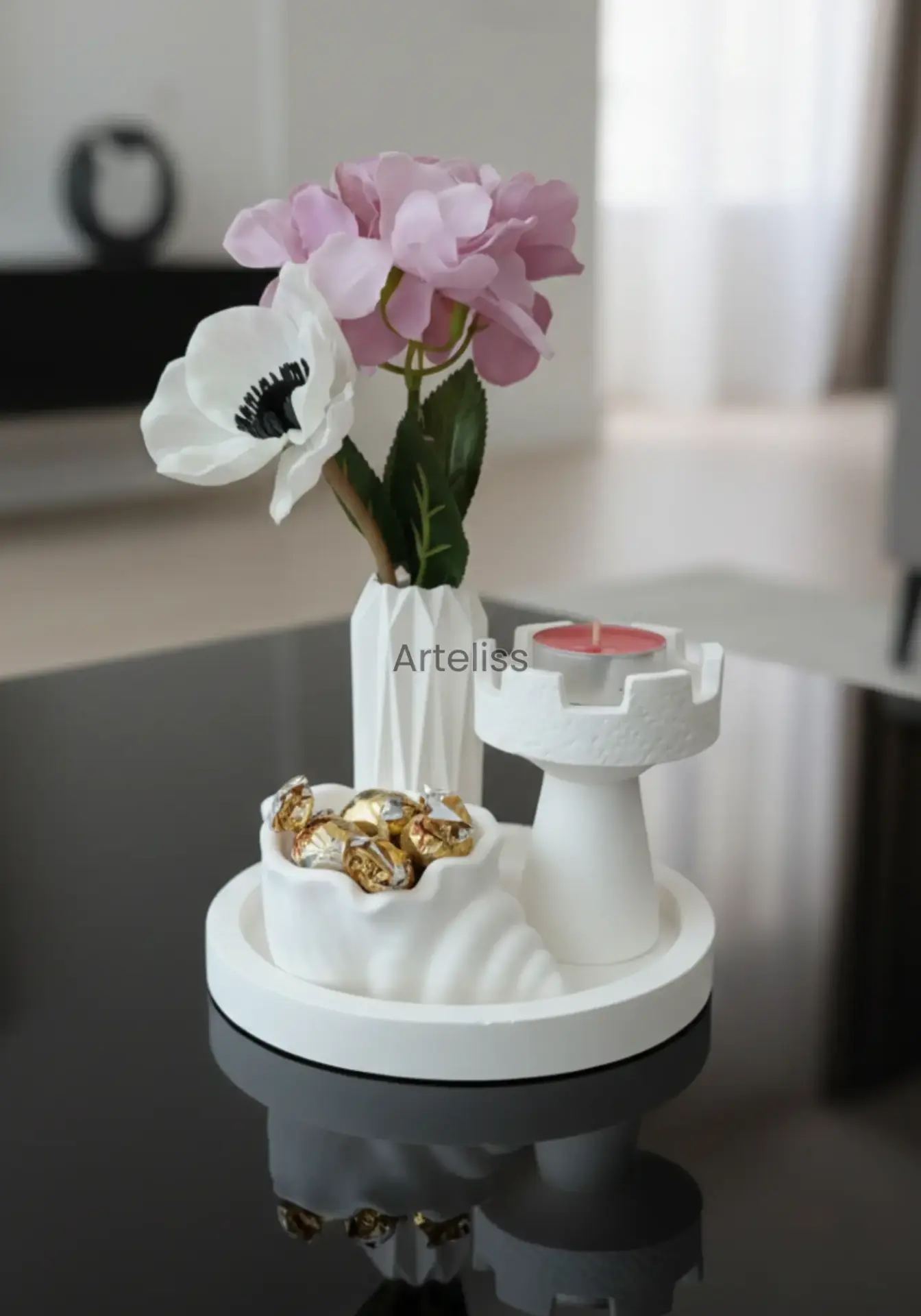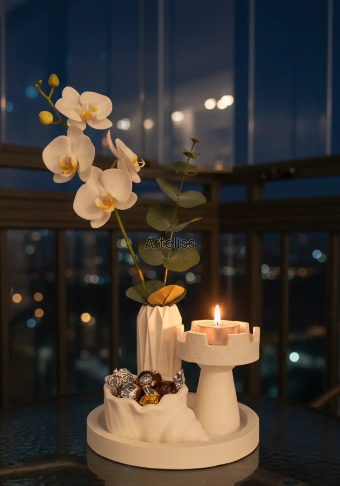 Arteliss® Art Deco Modern Ev Dekorasyon Seti; kule formundaki özgün mumluğu, keskin hatlı geometrik vazosu ve fonksiyonel deniz kabuğu objesiyle yaşam alanlarınızda dikkat çekici bir stil oluşturur. Mimari detayları ve minimalist beyaz dokusuyla öne çıkan bu modern ev dekorasyon seti, orta sehpa, dresuar veya TV ünitesi üzerinde sofistike bir atmosfer yaratır.