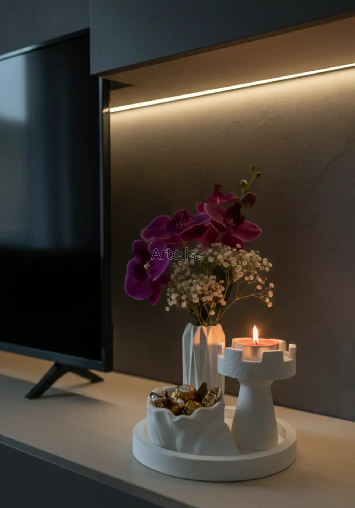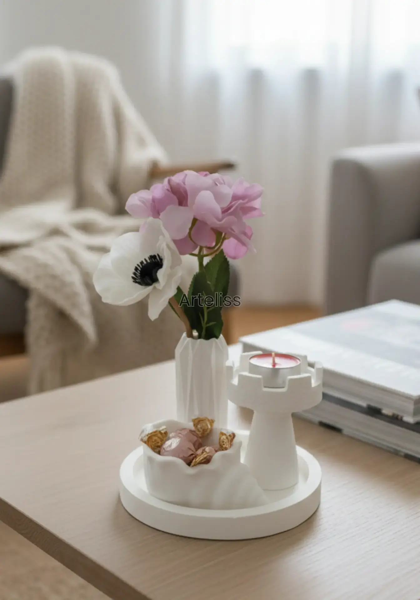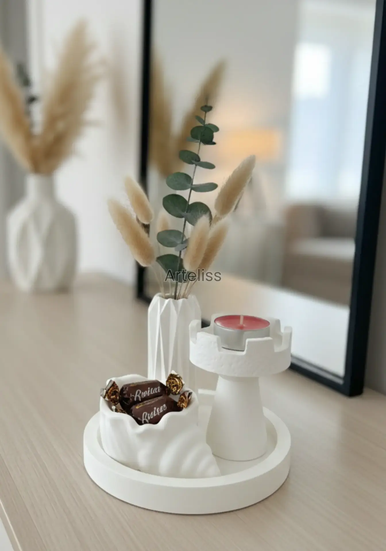 Arteliss® Art Deco Modern Ev Dekorasyon Seti; kule formundaki özgün mumluğu, keskin hatlı geometrik vazosu ve fonksiyonel deniz kabuğu objesiyle yaşam alanlarınızda dikkat çekici bir stil oluşturur. Mimari detayları ve minimalist beyaz dokusuyla öne çıkan bu modern ev dekorasyon seti, orta sehpa, dresuar veya TV ünitesi üzerinde sofistike bir atmosfer yaratır.