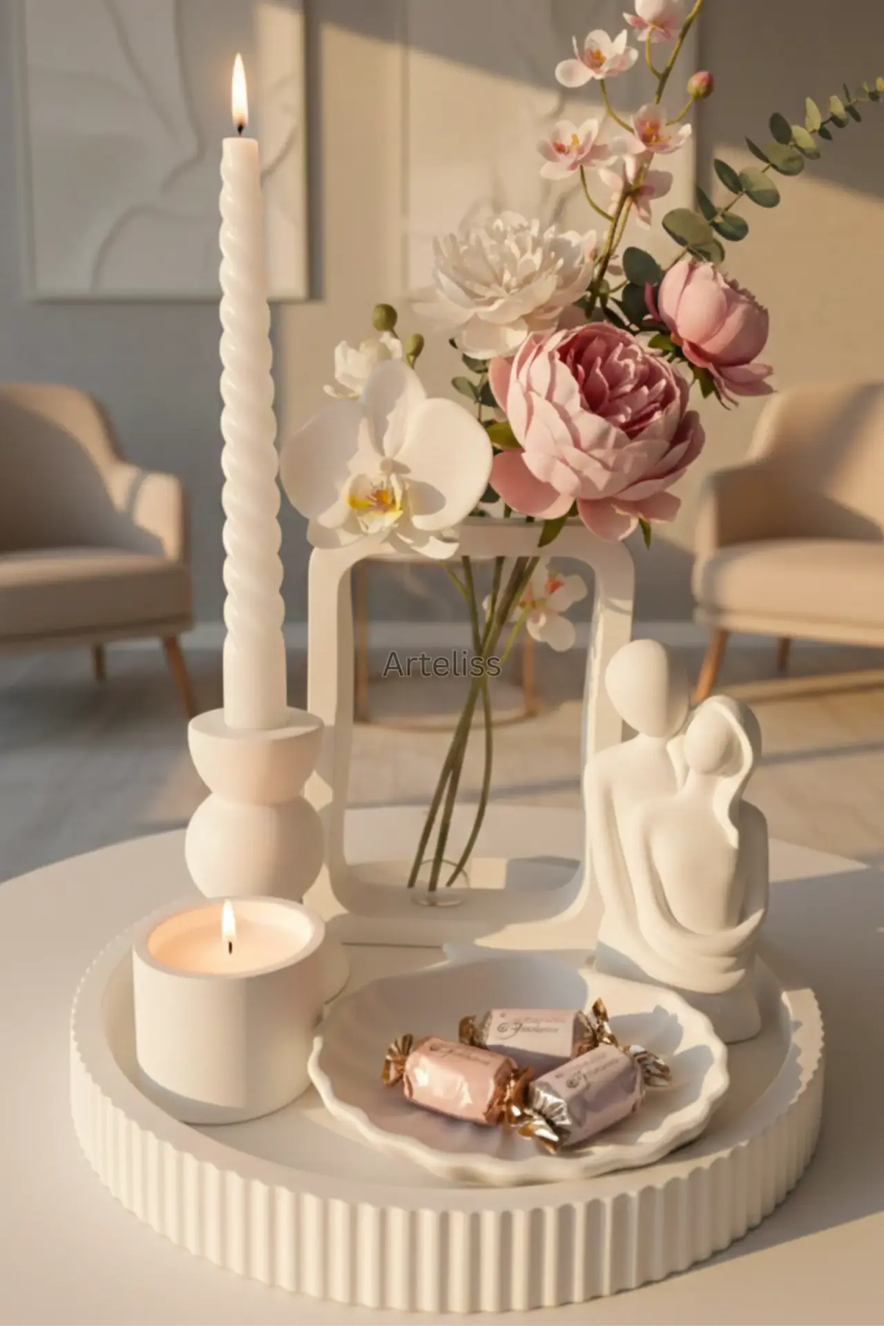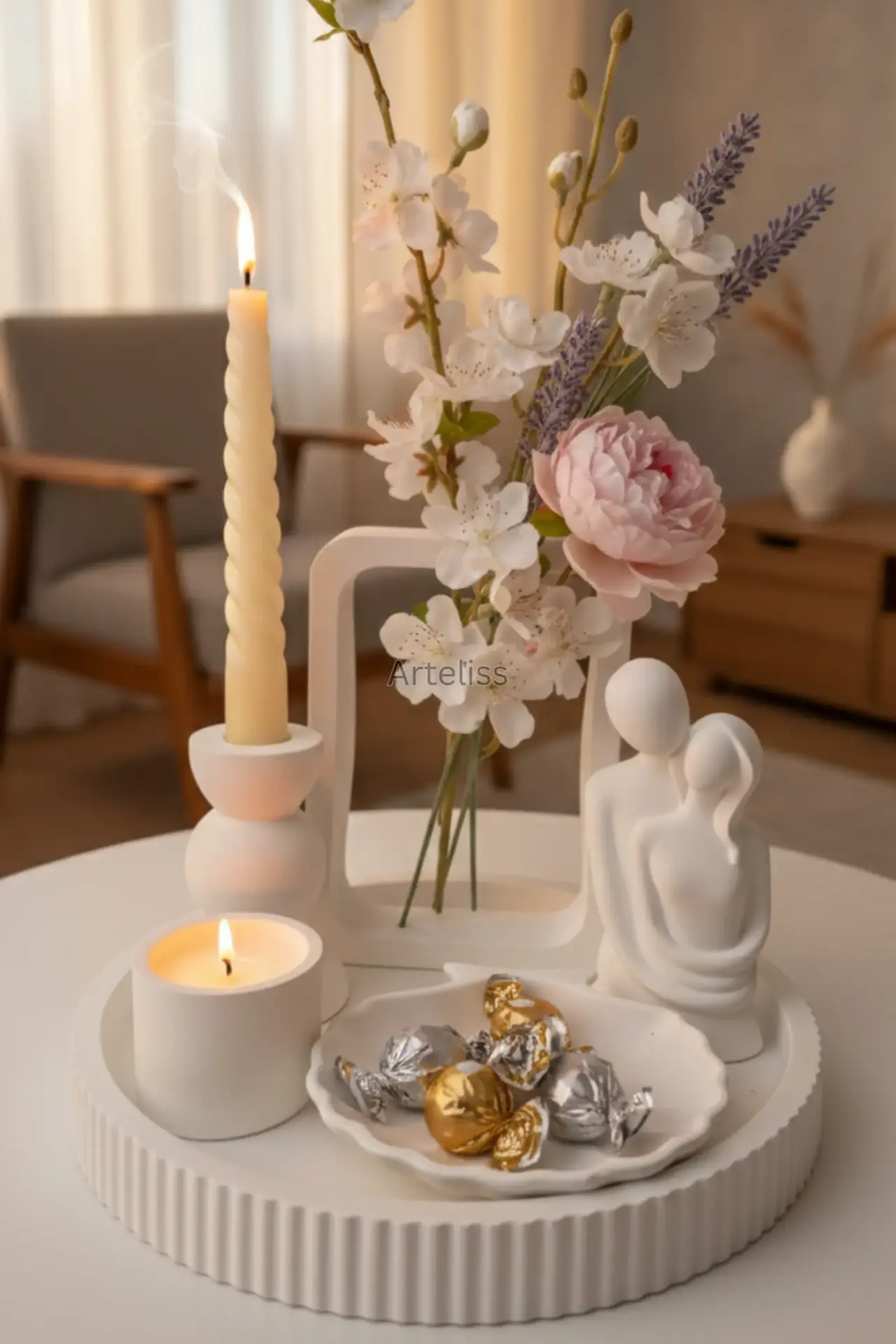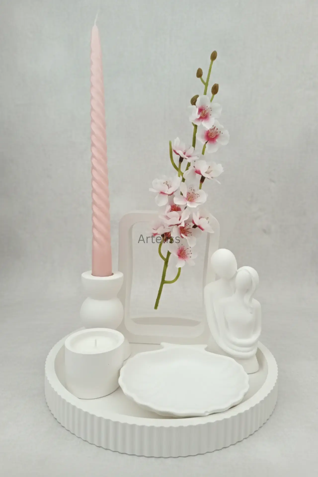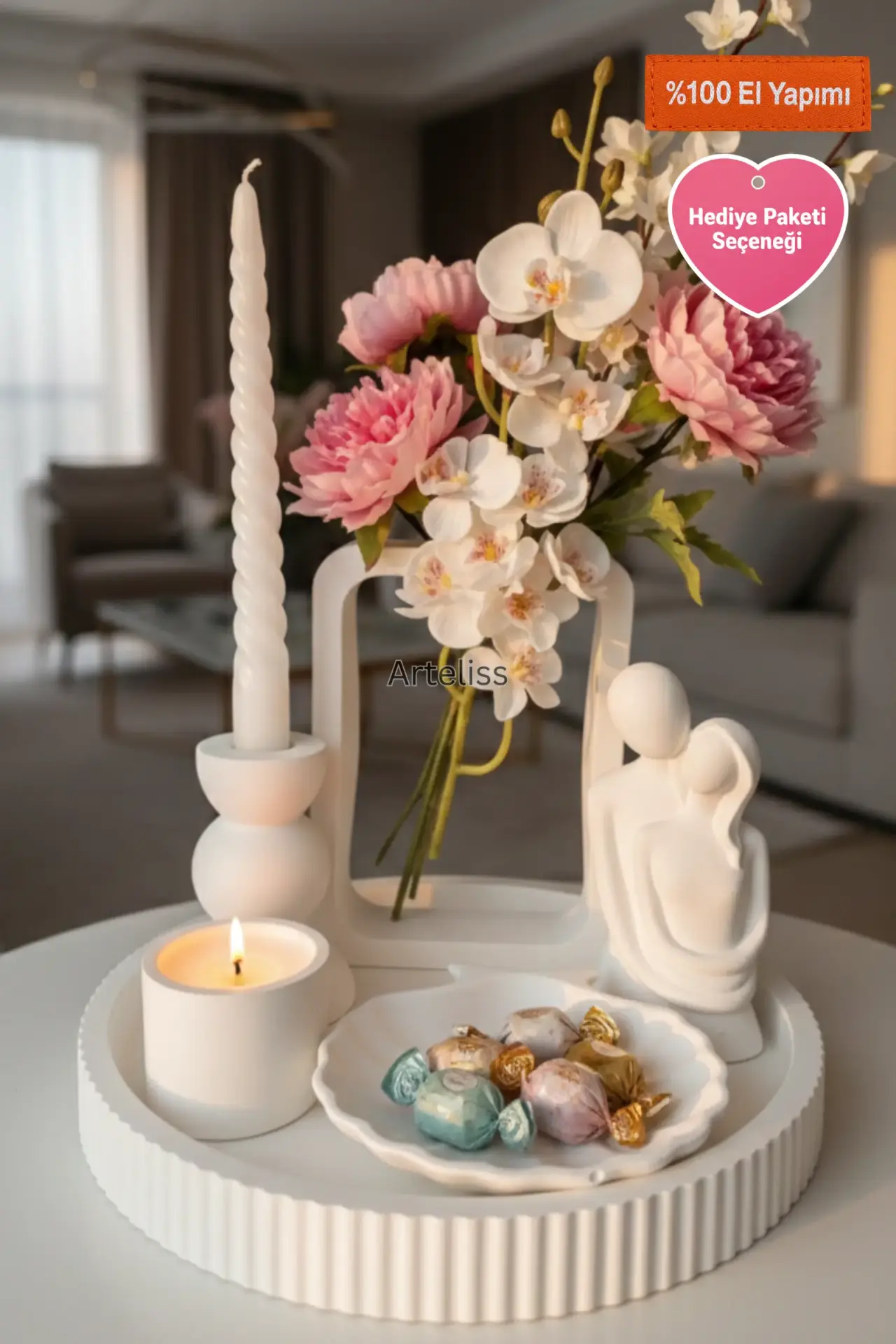 Arteliss® Artistic Frame Dekoratif Ev Aksesuarı seti; açık çerçeve formundaki özgün vazosu ve aşkı simgeleyen sevgili figürüyle yaşam alanlarında sanatsal bir derinlik oluşturur. Yuvarlak sunum tepsisi üzerinde yer alan şamdan ve minimalist silindir mumluk parçalarıyla bu dekoratif ev aksesuarı seti, dresuar veya orta sehpalar üzerinde hem modern bir aydınlatma hem de estetik bir sergileme alanı sunar.