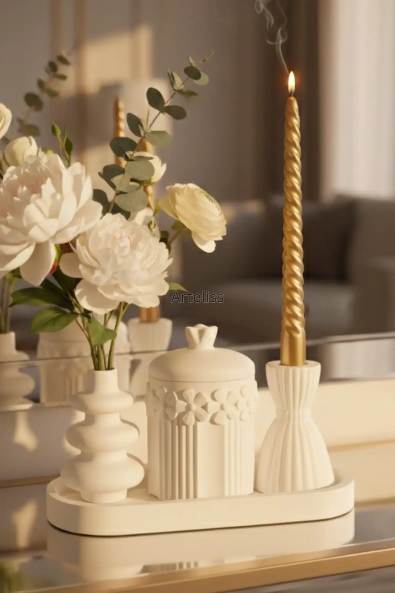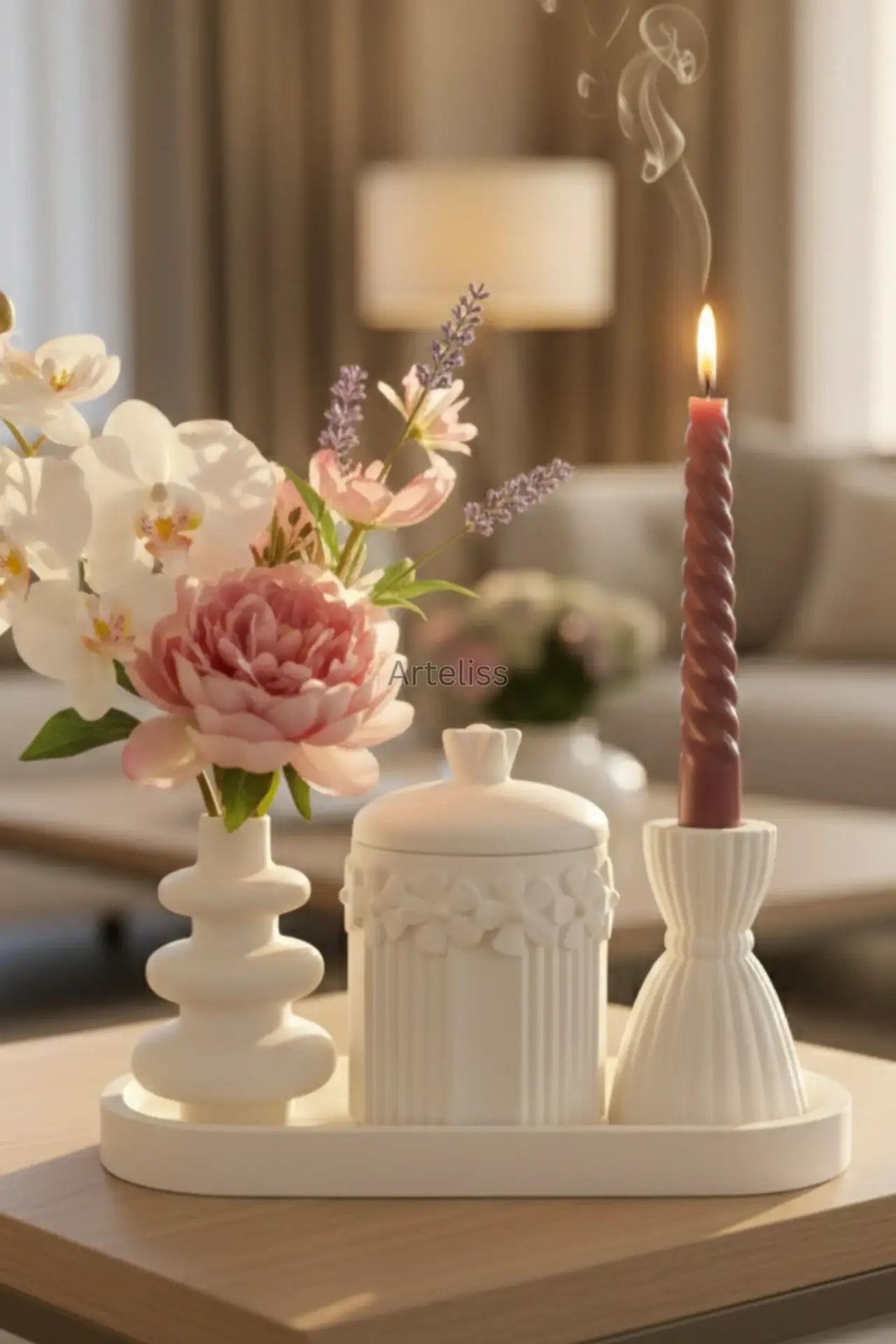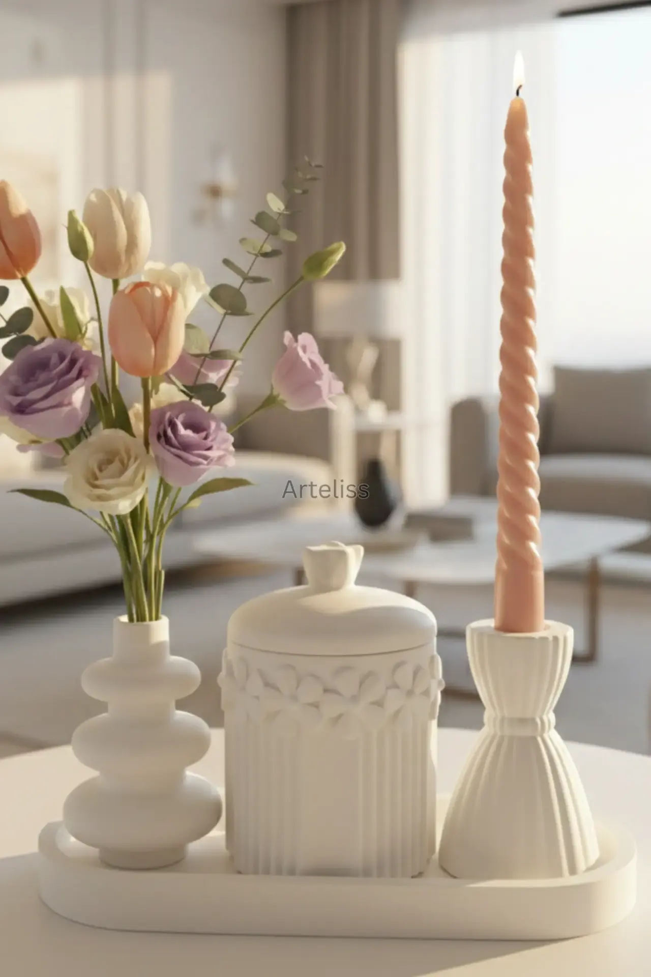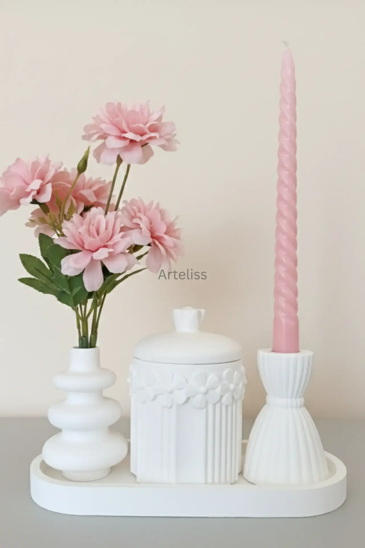 Arteliss® Bloom Cloud Sanatsal Ev Objeleri set; romantik detaylar ile modern formların kusursuz birleşimini sunar. Yaşam alanlarınıza estetik bir derinlik katmak için tasarlanan bu sanatsal ev objeleri, üzerinde zarif çiçek kabartmaları bulunan kapaklı saklama kavanozu ve "cloud" (bulut) formundaki vazo ile oval bir sunum tepsisi üzerinde eşsiz bir uyum yakalar.