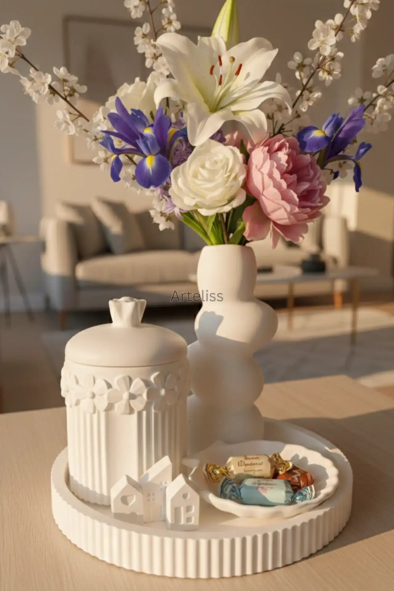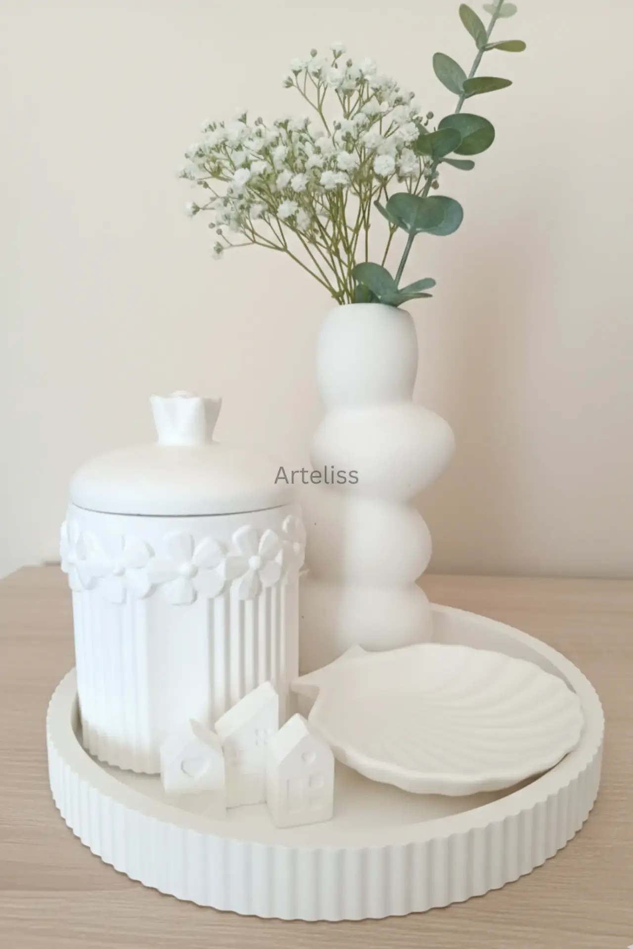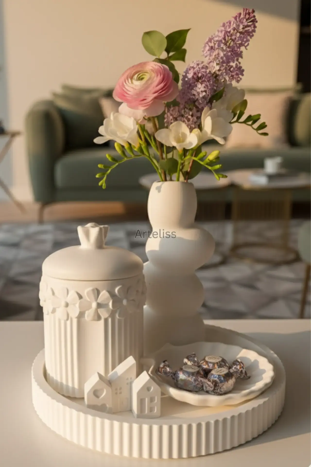 Arteliss® Blossom Pebble İskandinav Ev Aksesuarı set; üzerindeki zarif çiçek kabartmalarıyla öne çıkan kapaklı kavanozu ve çakıl vazoyu şık bir sunum tepsisi üzerinde buluşturur. Minimalist tasarımıyla dikkat çeken bu iskandinav ev aksesuarı seti, dresuar veya konsol üzerinde hem işlevsel bir sergileme alanı hem de katmanlı bir görsel estetik oluşturmak için özel olarak tasarlanmıştır.