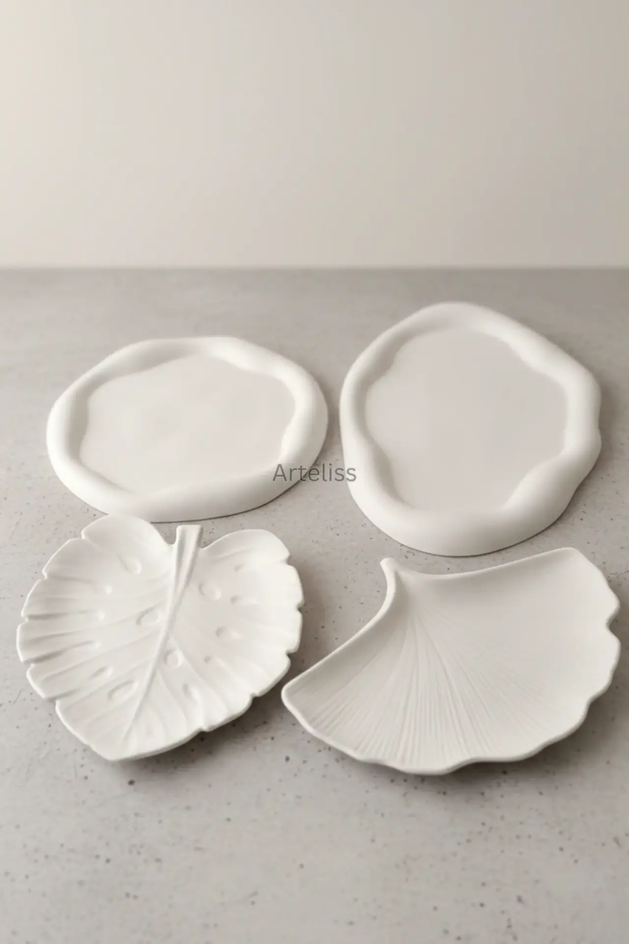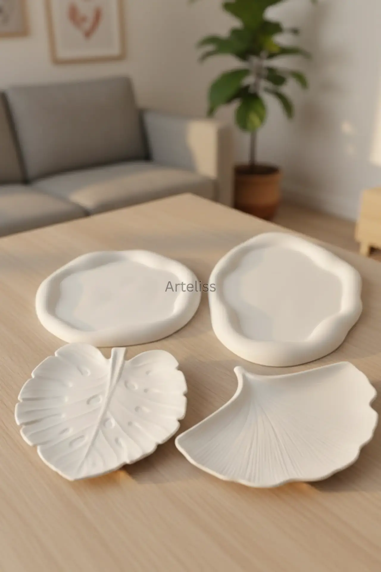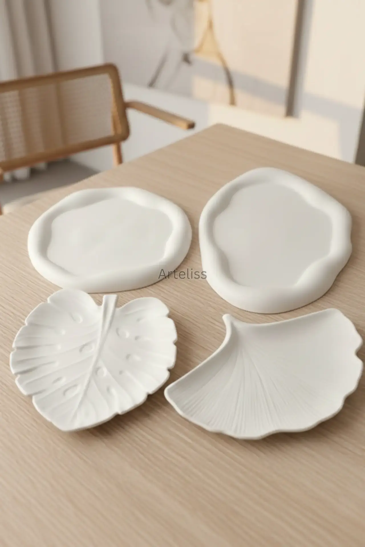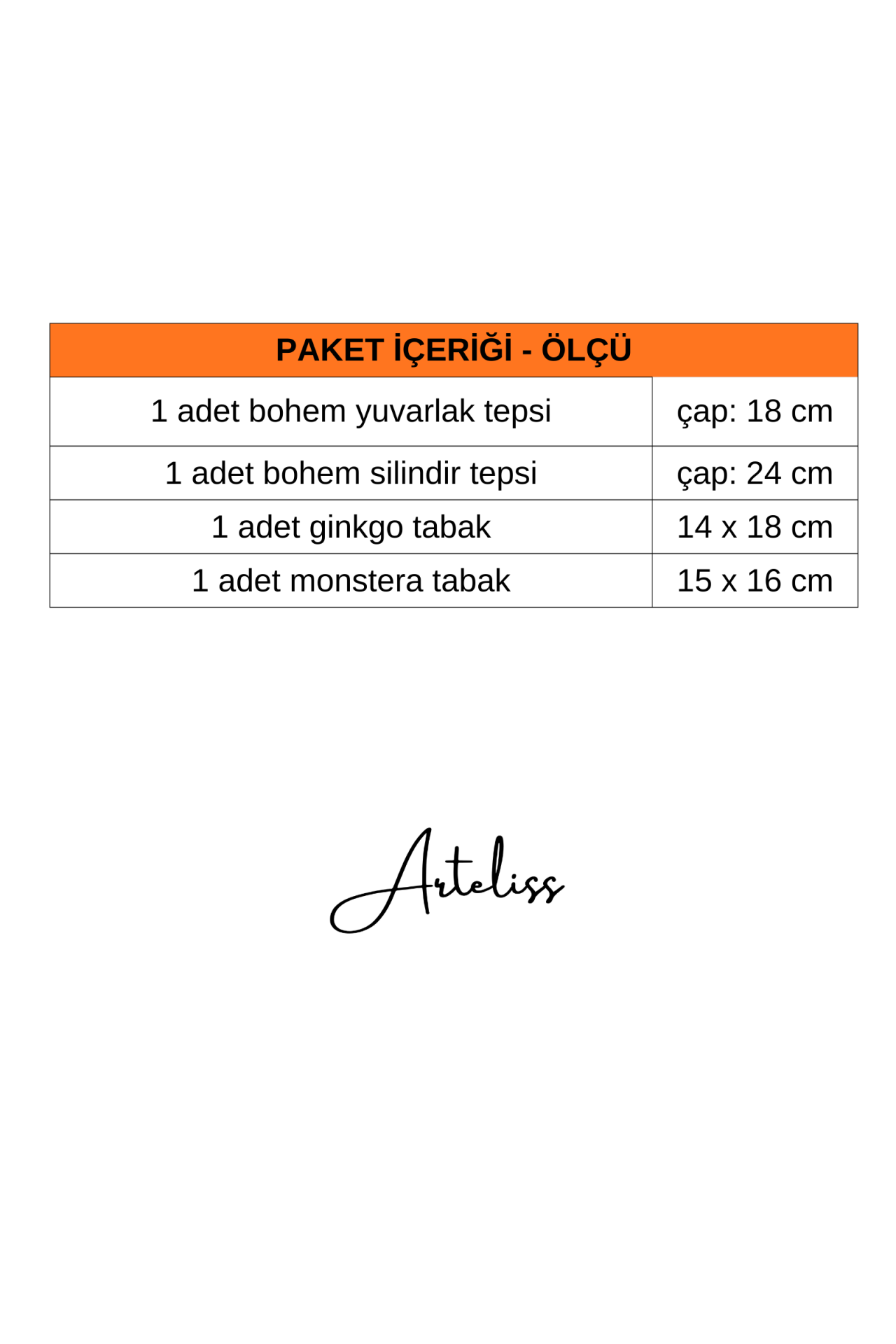Arteliss® Boho Nature seti; Monstera ve Ginkgo yaprağı formundaki tasarımları ile iki farklı boyuttaki amorf (dalgalı kenarlı) sunum tepsisinden oluşur. Modern bohem hatlara sahip bu dekoratif sunum tabak kombinasyonu, yaşam alanlarınızdaki dağınıklığı estetik bir şekilde düzenlerken evinize doğal bir zarafet katar.