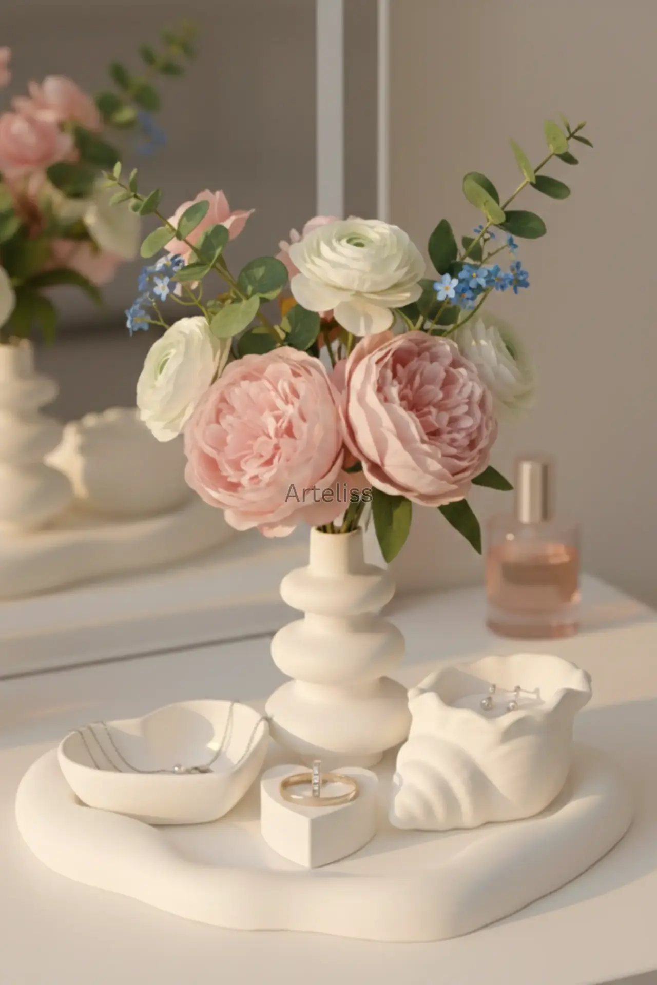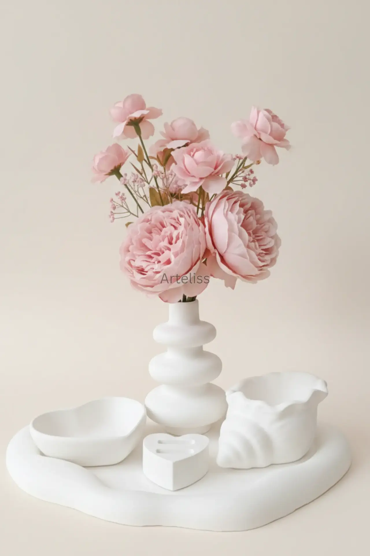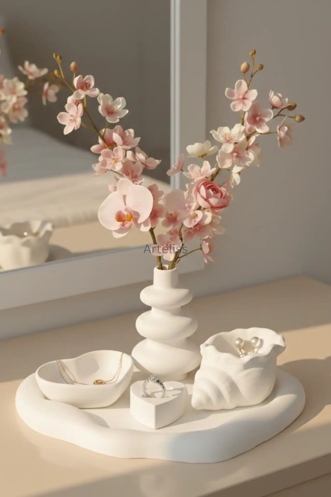 Arteliss® Cloud & Love Takı Organizeri Aksesuar Tepsisi; özgün bulut vazo tasarımı, kalp formundaki tabak ve yüzük standı ile makyaj masası veya dresuarlarınız için estetik bir düzenleme sunar. Bohem tablası sayesinde bütünsel bir takı organizeri aksesuar tepsisi görevi gören bu set; yüzük, küpe ve kolyeleriniz için şık bir saklama alanı oluştururken bulut vazosuyla yaşam alanınıza ferahlık katar.