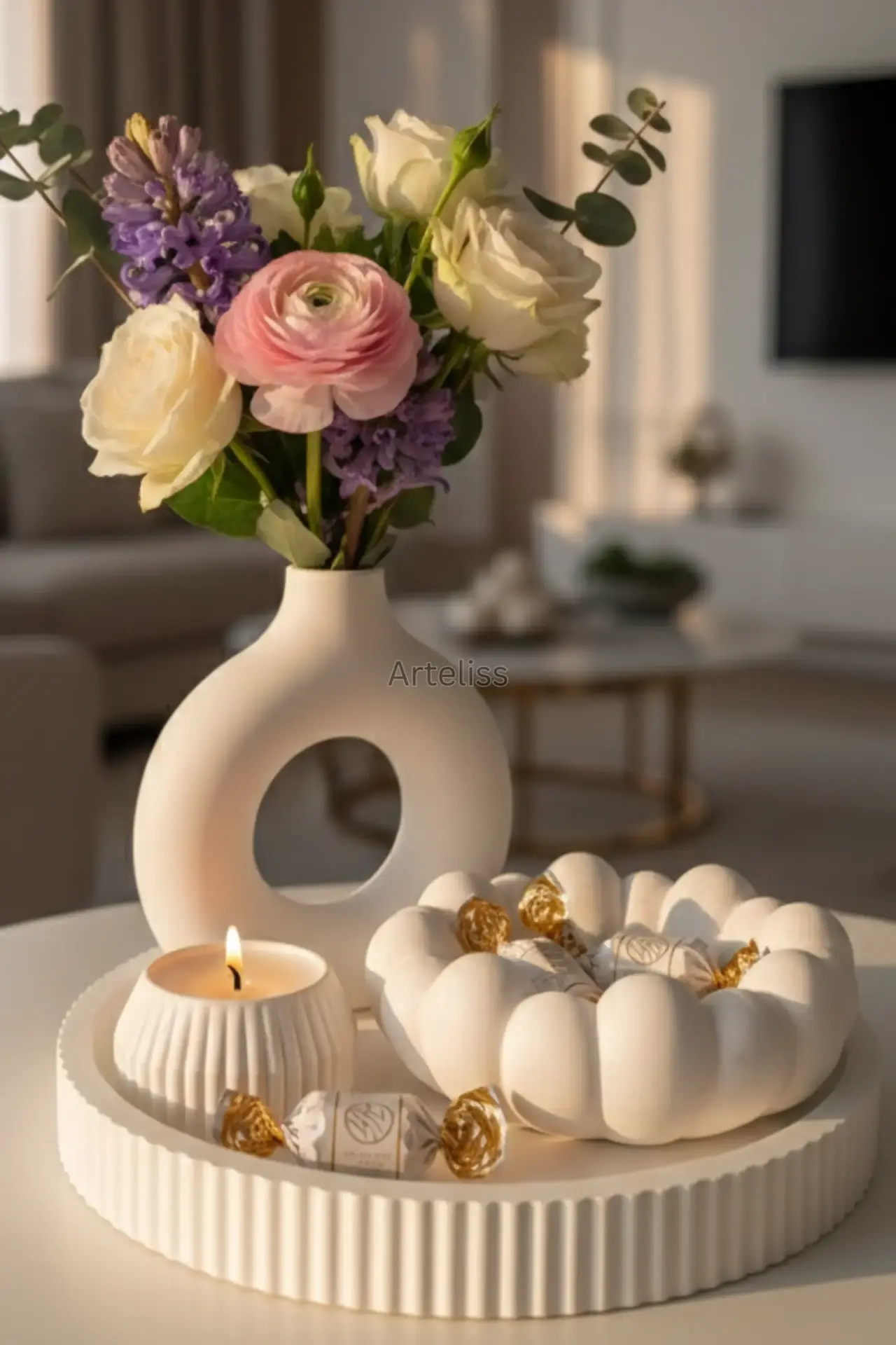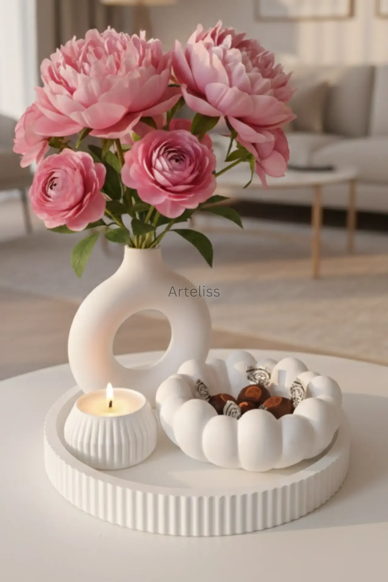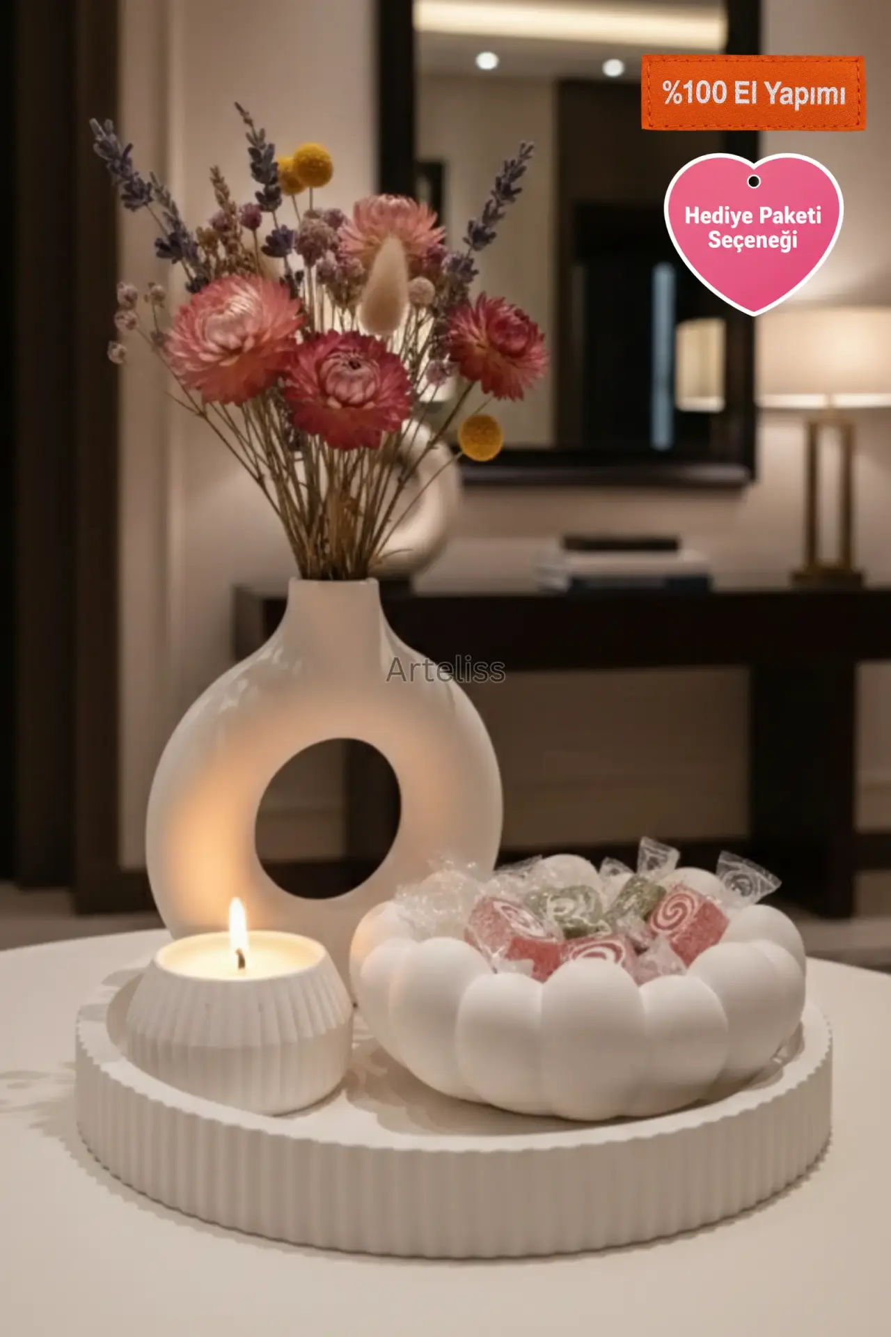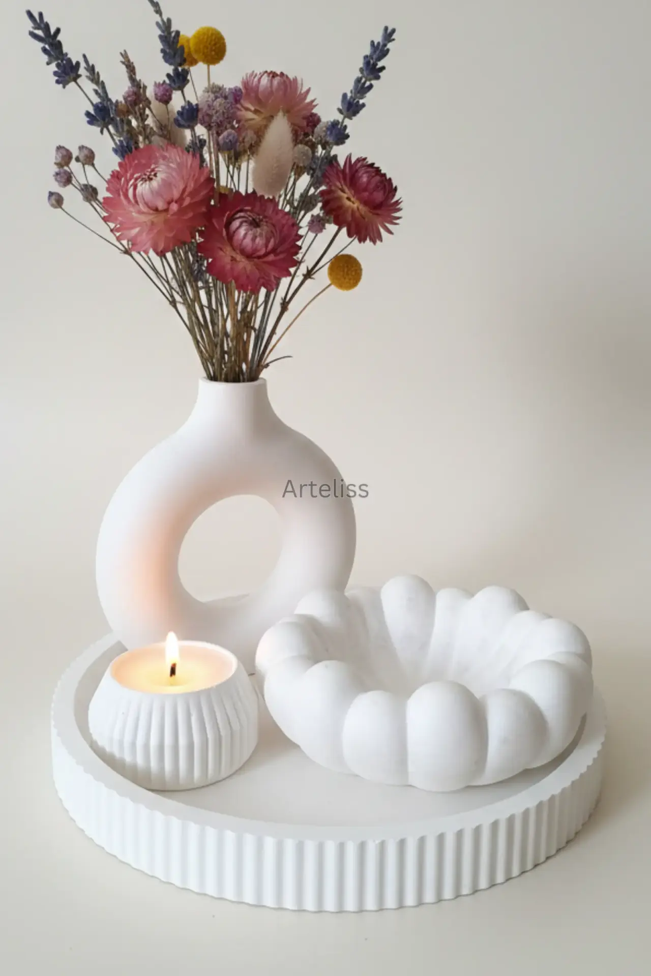 Arteliss® Cloudy Zen Japandi Dekorasyon Seti; ikonik halka vazosu ve bulut hatlarına sahip estetik kasesiyle yaşam alanlarınızda minimalist bir huzur köşesi oluşturur. İskandinav fonksiyonelliği ile Japon minimalizmini harmanlayan bu japandi dekorasyon seti, dresuar ve orta sehpalar üzerinde modern bir aydınlatma odağı ve düzenli bir görsel bütünlük sergilemek için özel olarak tasarlanmıştır.