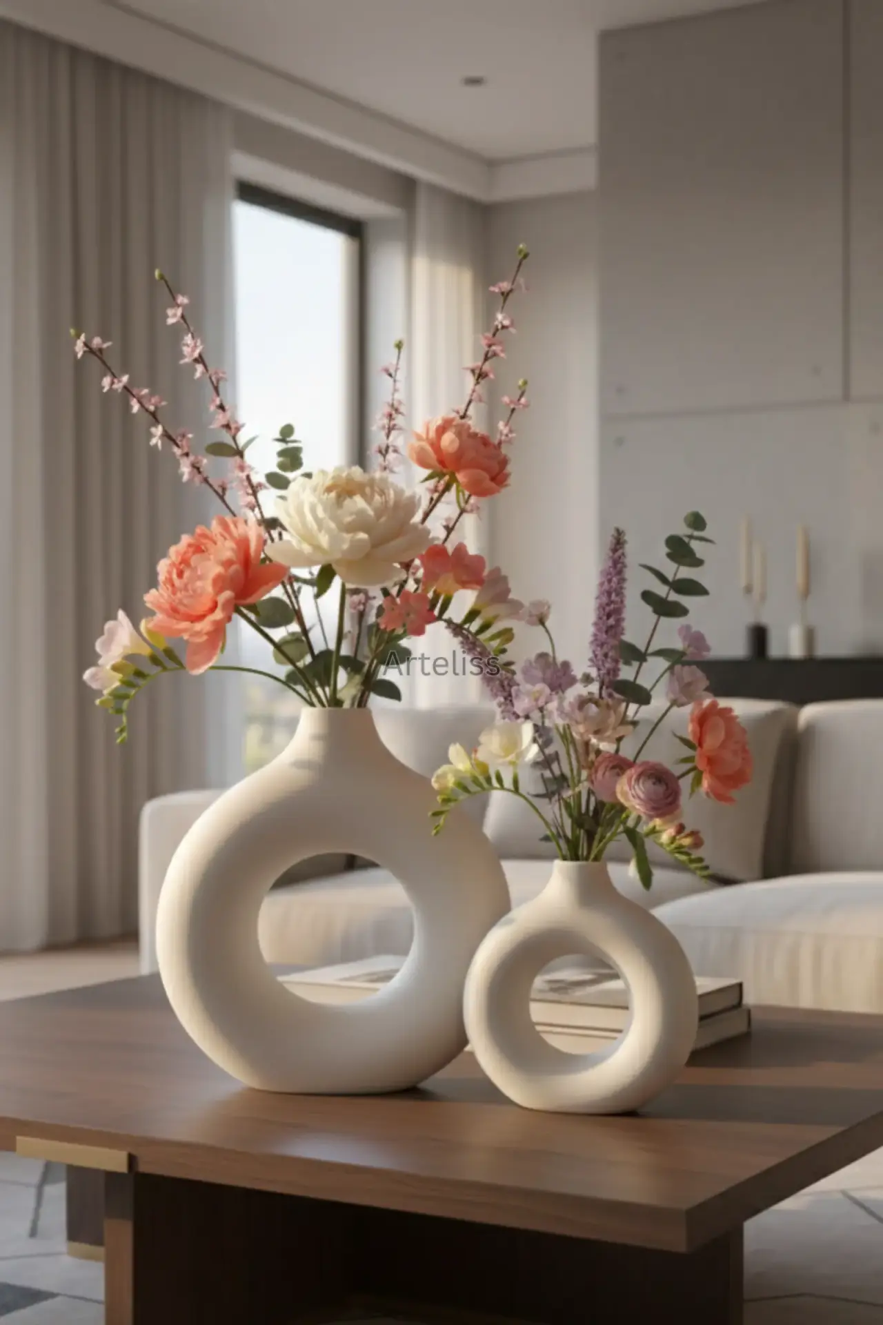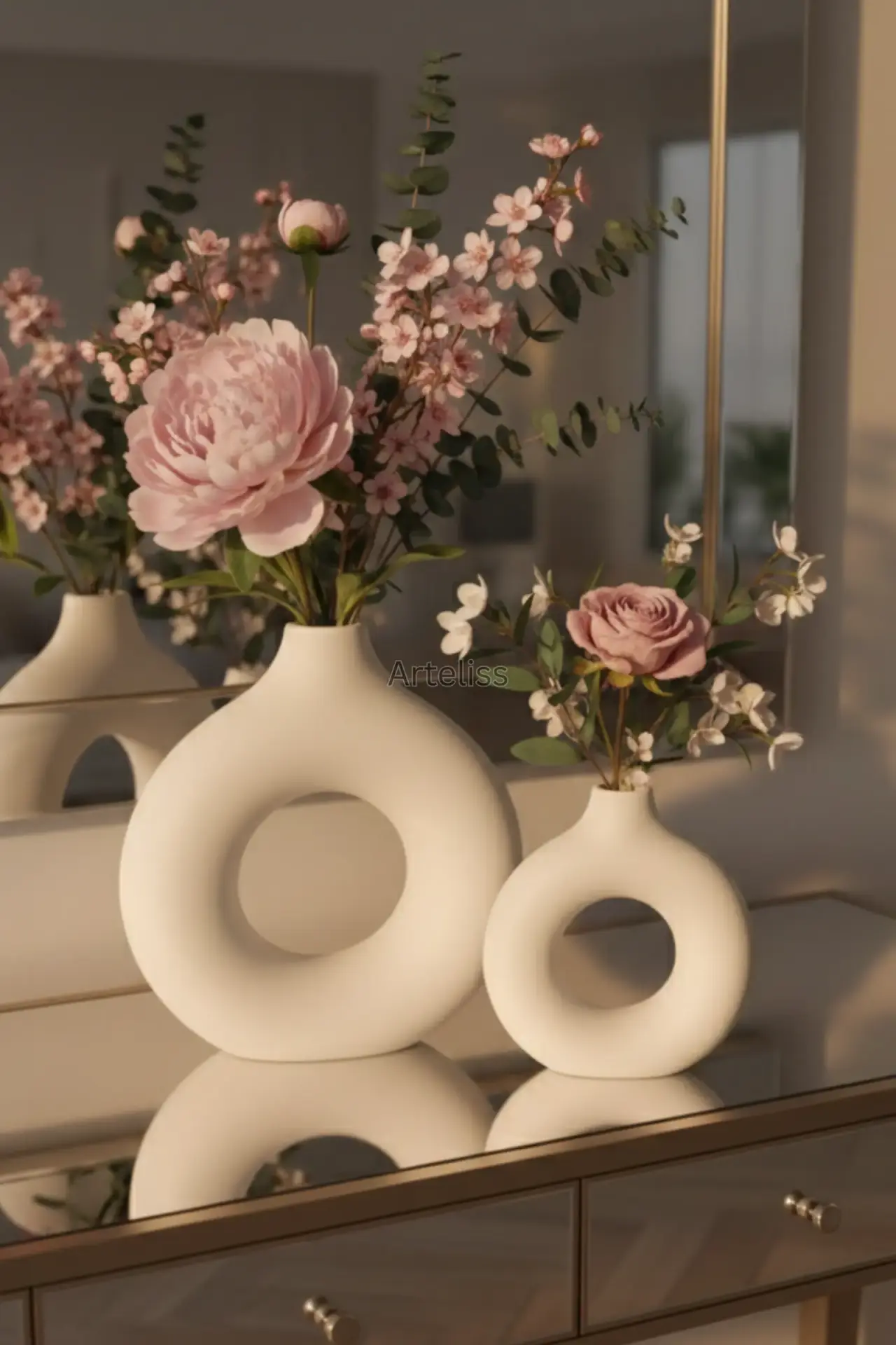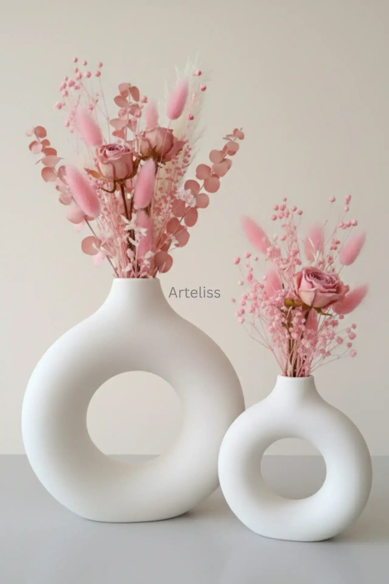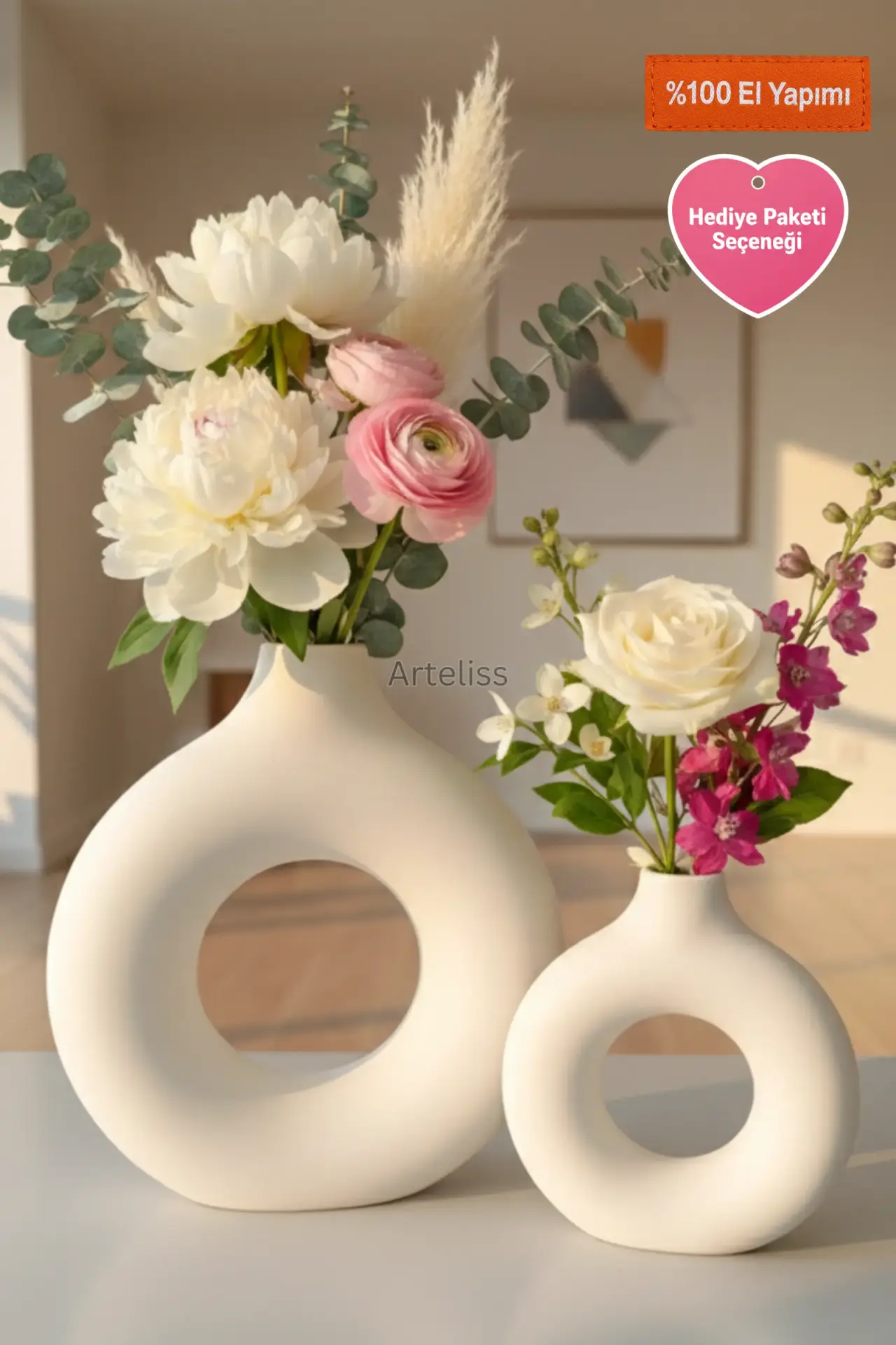Arteliss® Donut Duo Halka Vazo set, modern iç mimarinin en popüler formlarından biri olan donut tasarımını iki farklı boyutta sunarak yaşam alanlarınıza heykelsi bir derinlik katar. Minimalist estetiğin zirvesini temsil eden bu halka vazo grubu; biri geniş ve görkemli, diğeri ise daha kompakt ve zarif iki adet ikonik parçadan oluşur. Mat beyazın saflığını taşıyan bu özel tasarım, mekanın ışık ve boşluk dengesini kusursuzca ayarlar.