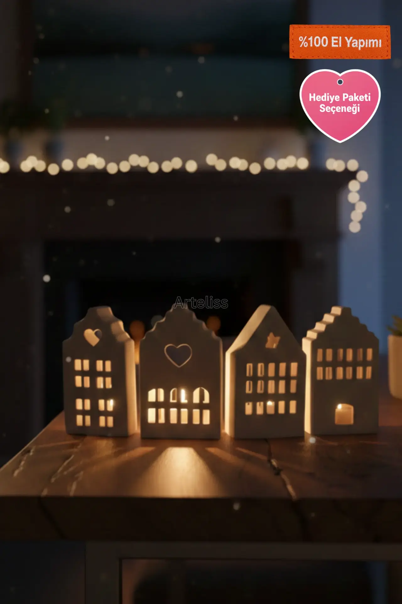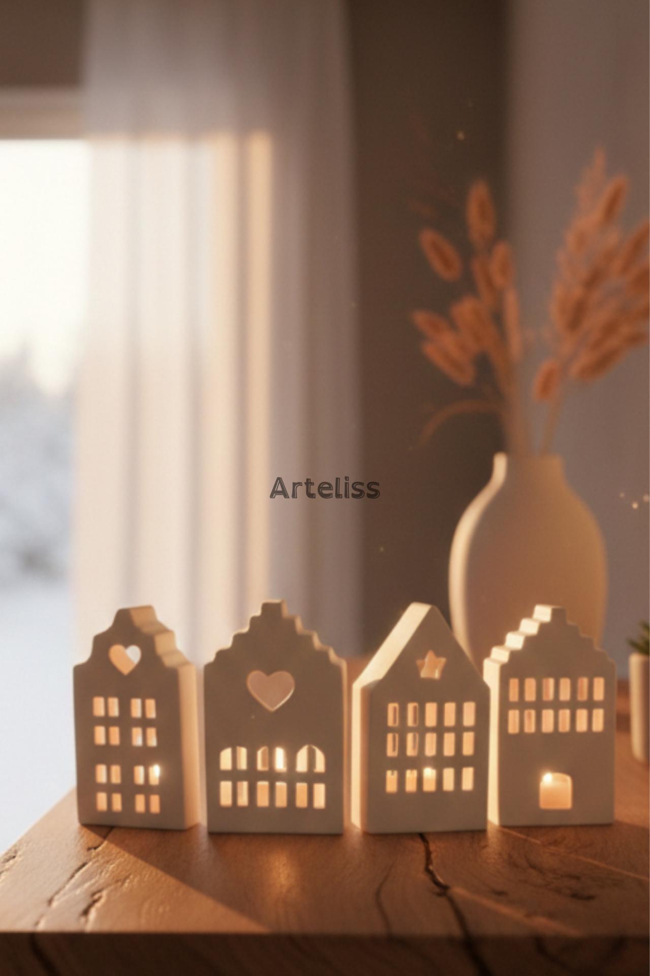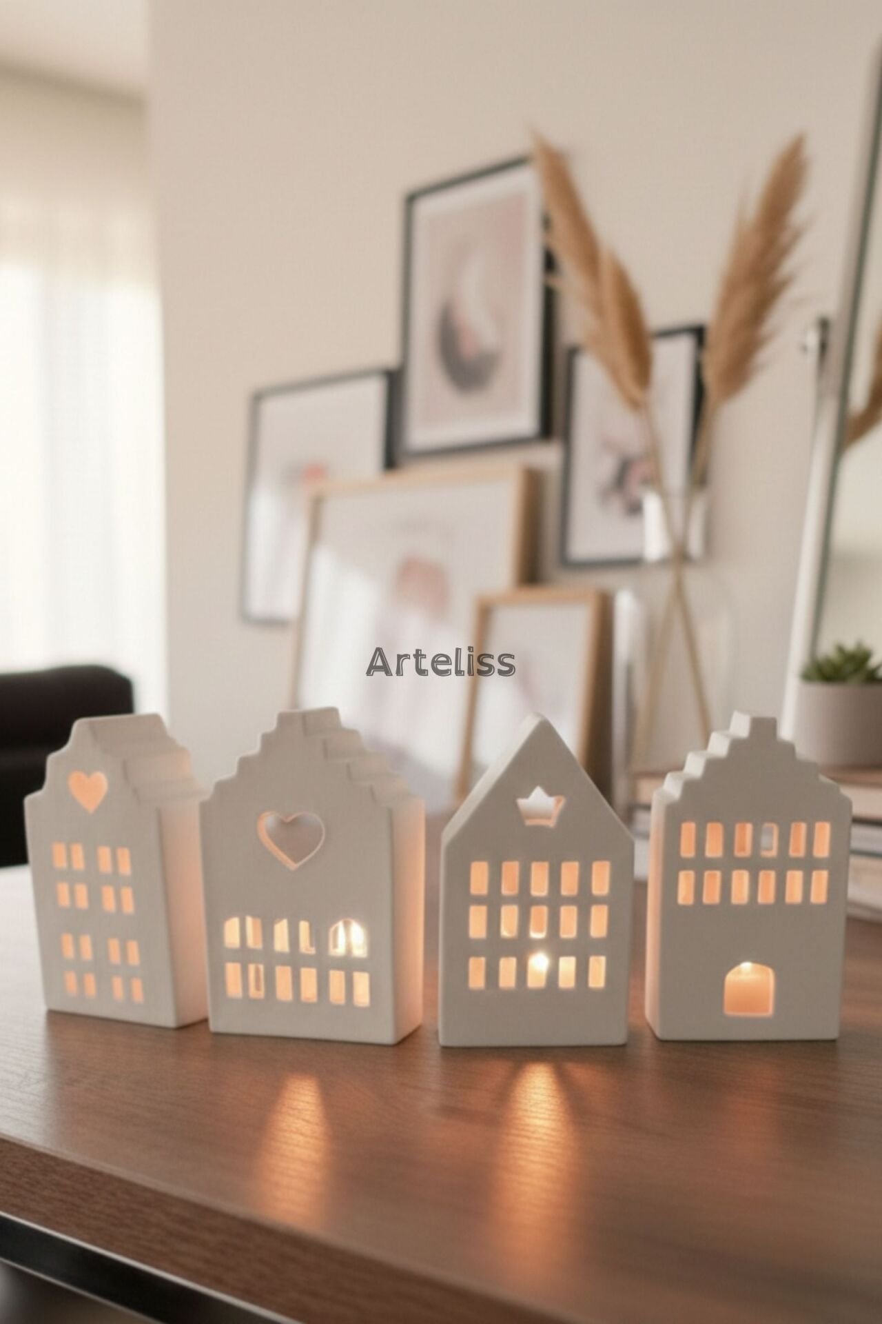 Arteliss® Dreamy Street Dekoratif Aydınlatma Obje ışıkevleri koleksiyonu, farklı mimari tasarımlara sahip dört adet midi boy evi bir araya getirerek yaşam alanlarınızda huzurlu bir "hayal sokağı" kurgular. Evinizde büyüleyici bir ambiyans yaratmak için tasarlanan bu dekoratif aydınlatma obje grubu; kalp ve yıldız gibi romantik pencerelerden süzülen yumuşak ışığı mat beyazın zarafetiyle buluşturur.