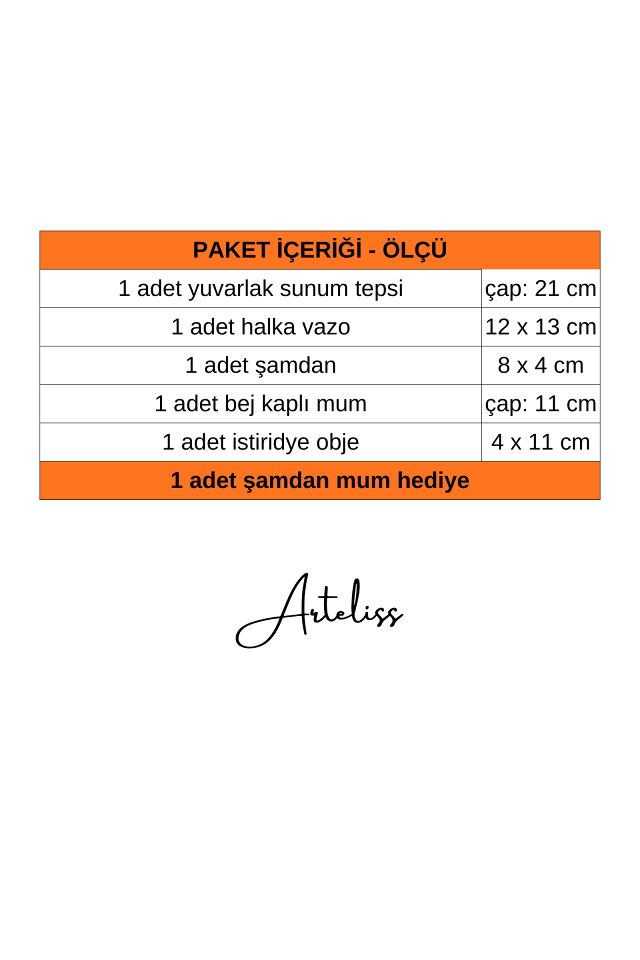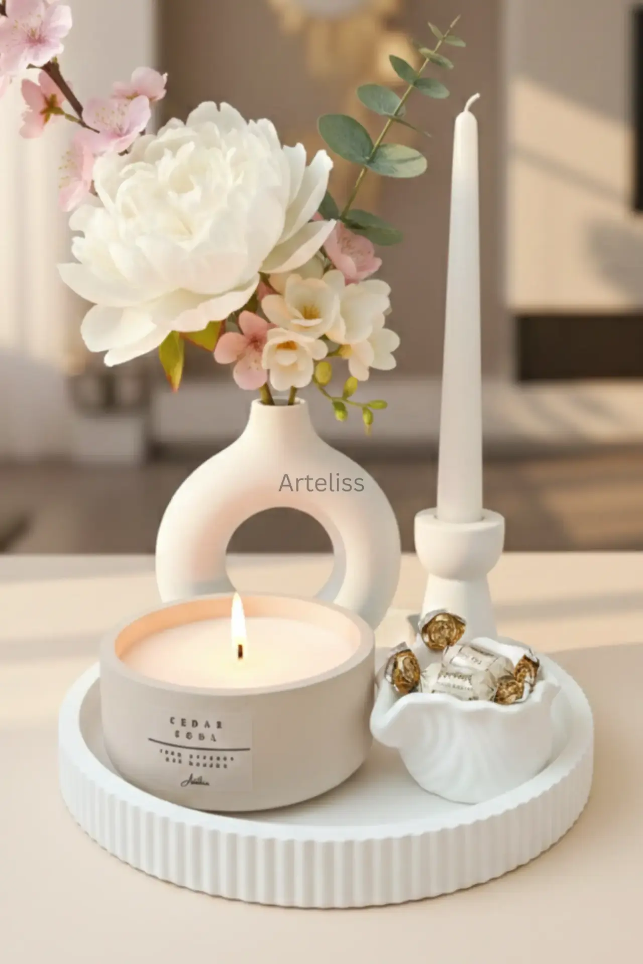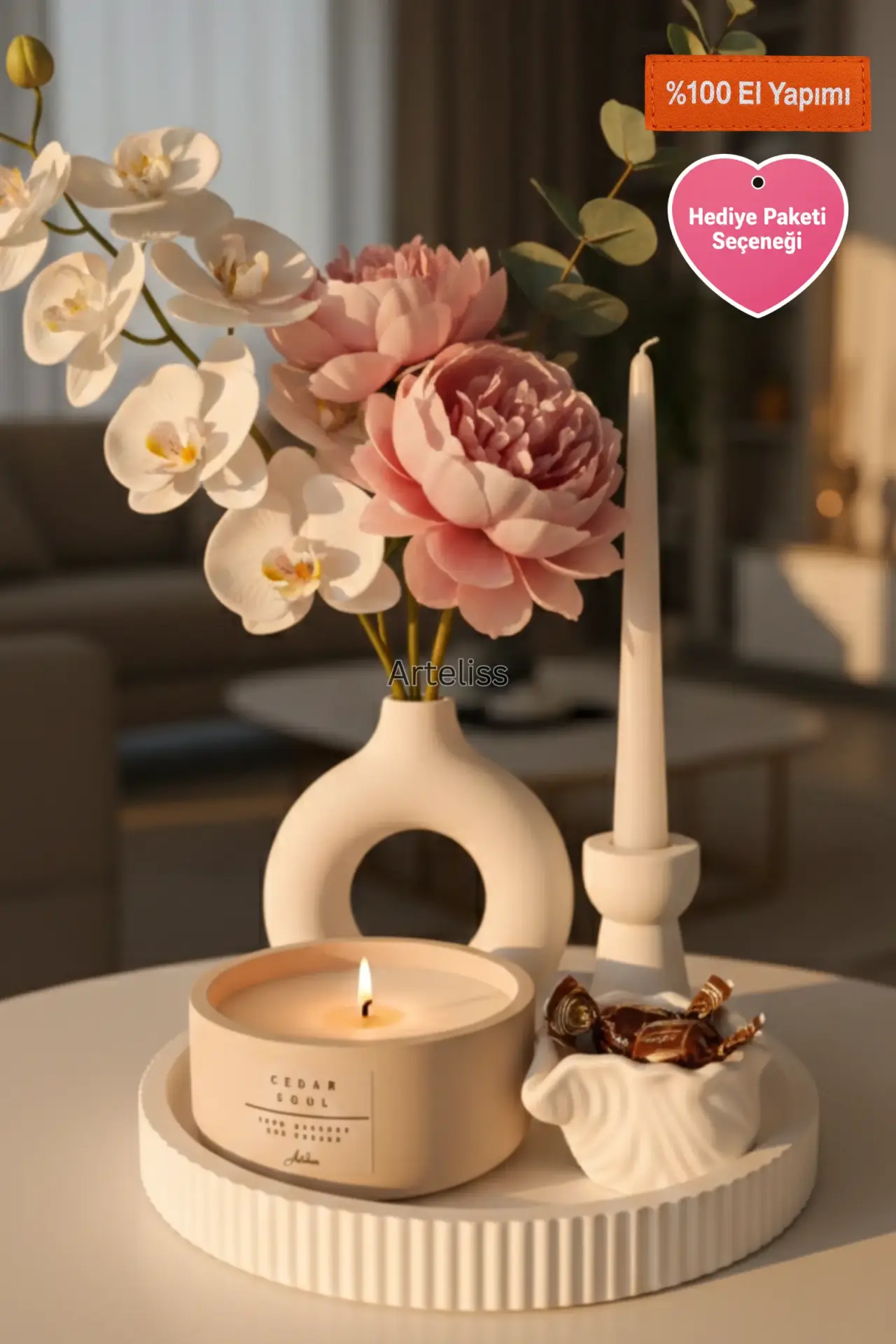Arteliss® Earth Collection Modern Ev Dekorasyon Seti ile fonksiyonel dekorasyonu evinize taşıyın. Bej kaplı sedir ağacı kokulu doğal soya mum, halka vazo, istiridye şekerlik obje, minimal şamdan ve şık sunum tepsisinden oluşan bu modern ev dekorasyon seti, yaşam alanlarınızda bütünsel bir estetik yaratmak için özenle bir araya getirildi.