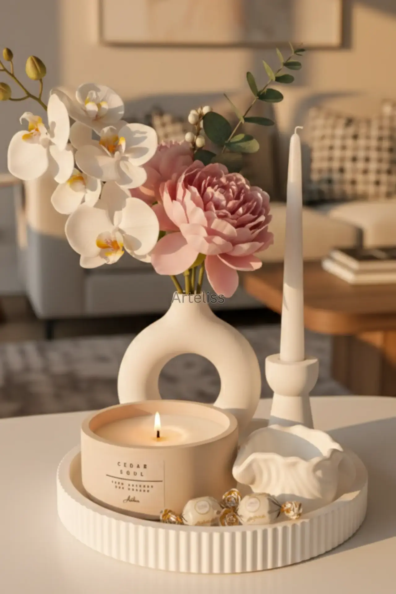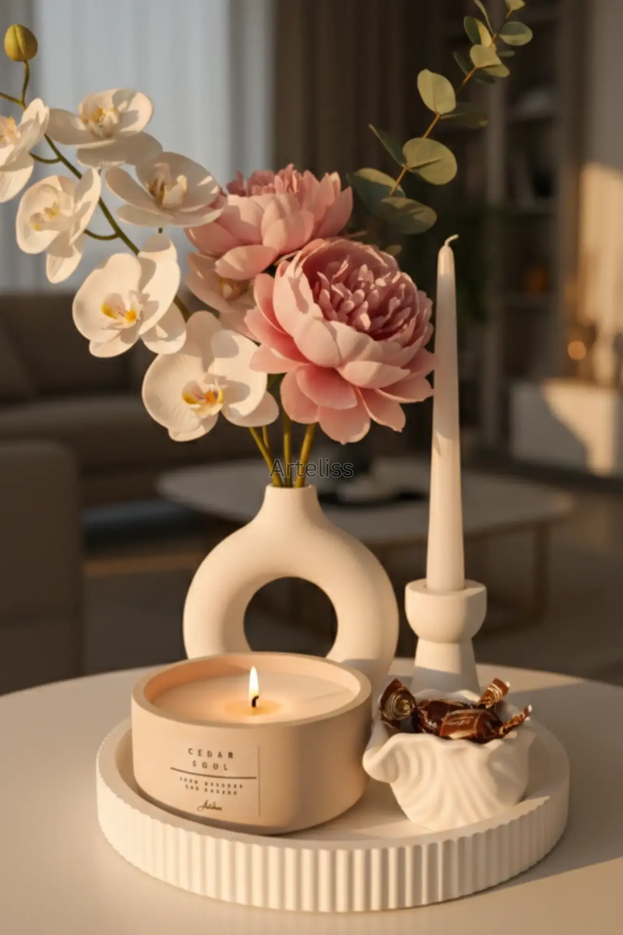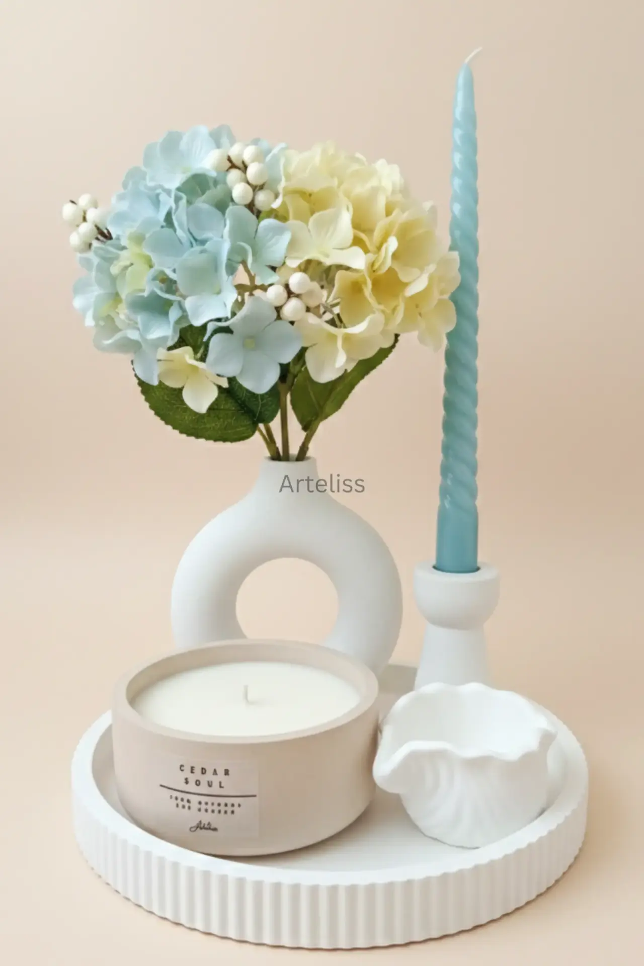 Arteliss® Earth Collection Modern Ev Dekorasyon Seti ile fonksiyonel dekorasyonu evinize taşıyın. Bej kaplı sedir ağacı kokulu doğal soya mum, halka vazo, istiridye şekerlik obje, minimal şamdan ve şık sunum tepsisinden oluşan bu modern ev dekorasyon seti, yaşam alanlarınızda bütünsel bir estetik yaratmak için özenle bir araya getirildi.