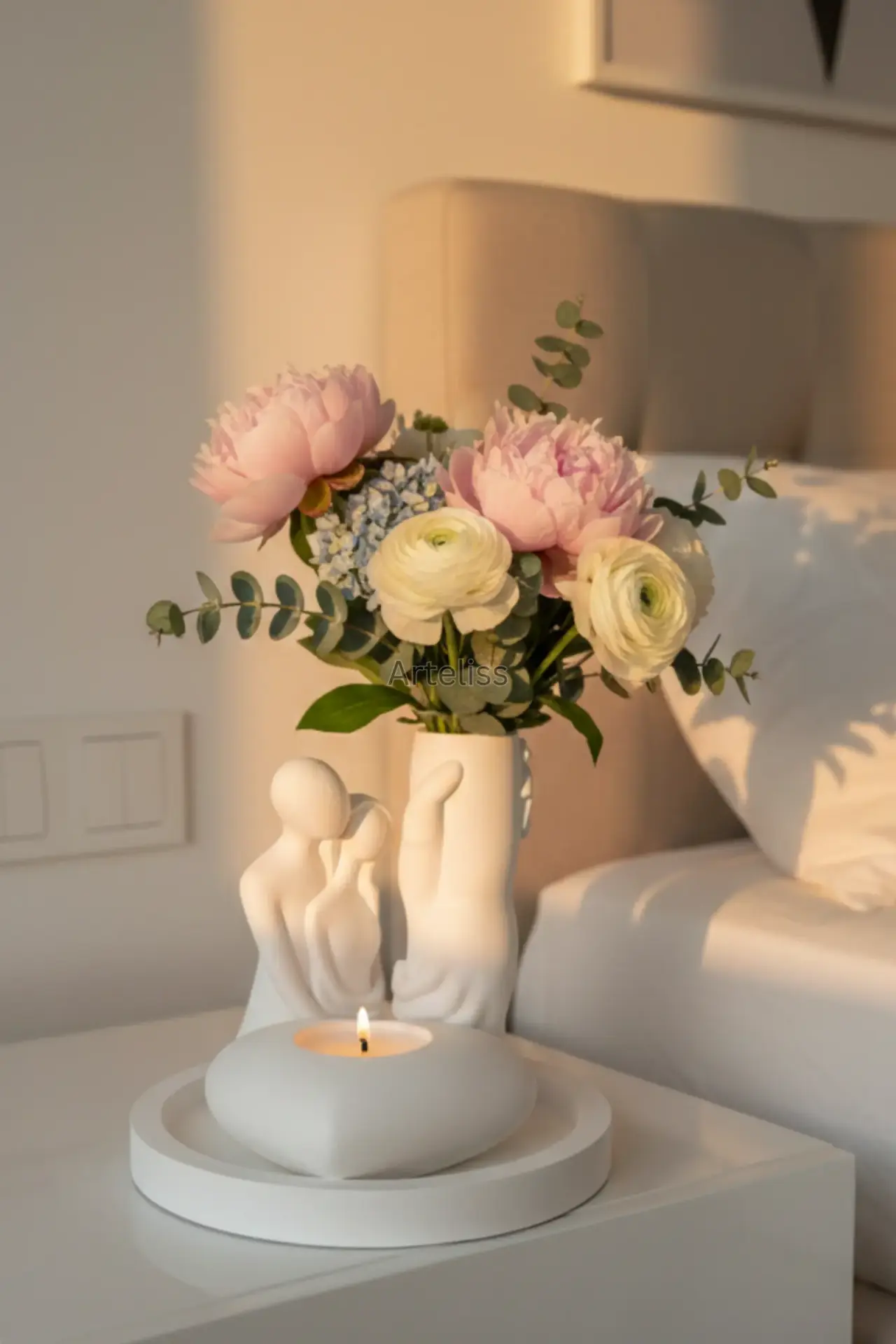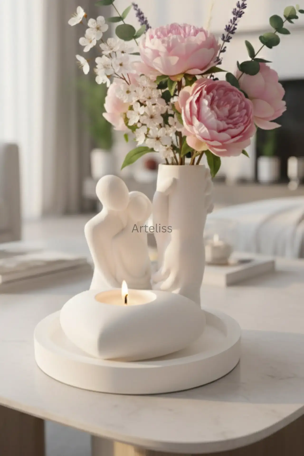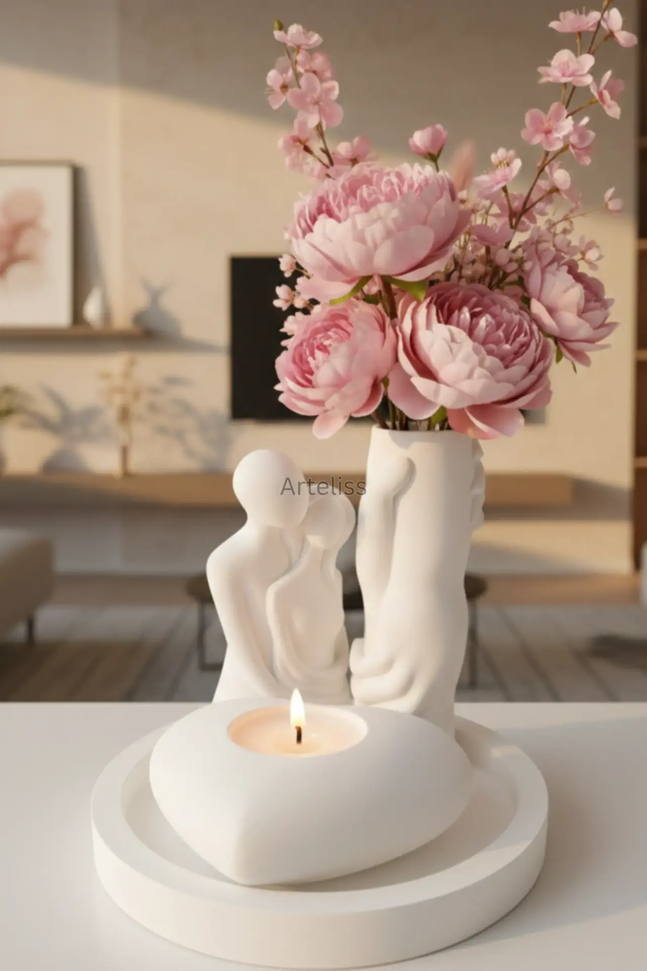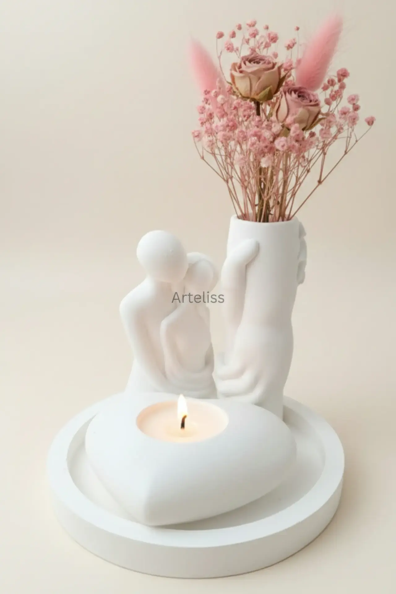 Arteliss® Eternal Flame Sevgili Dekoratif Hediye seti, aşkın ve bağlılığın en estetik sembollerini modern bir tasarımda buluşturur. Anlamlı bir sevgili dekoratif hediye arayanlar için tasarlanan bu setin odak noktası olan şefkati simgeleyen el formundaki vazo, birbirine kenetlenmiş sevgili figürü ile romantik bir uyum yakalar.