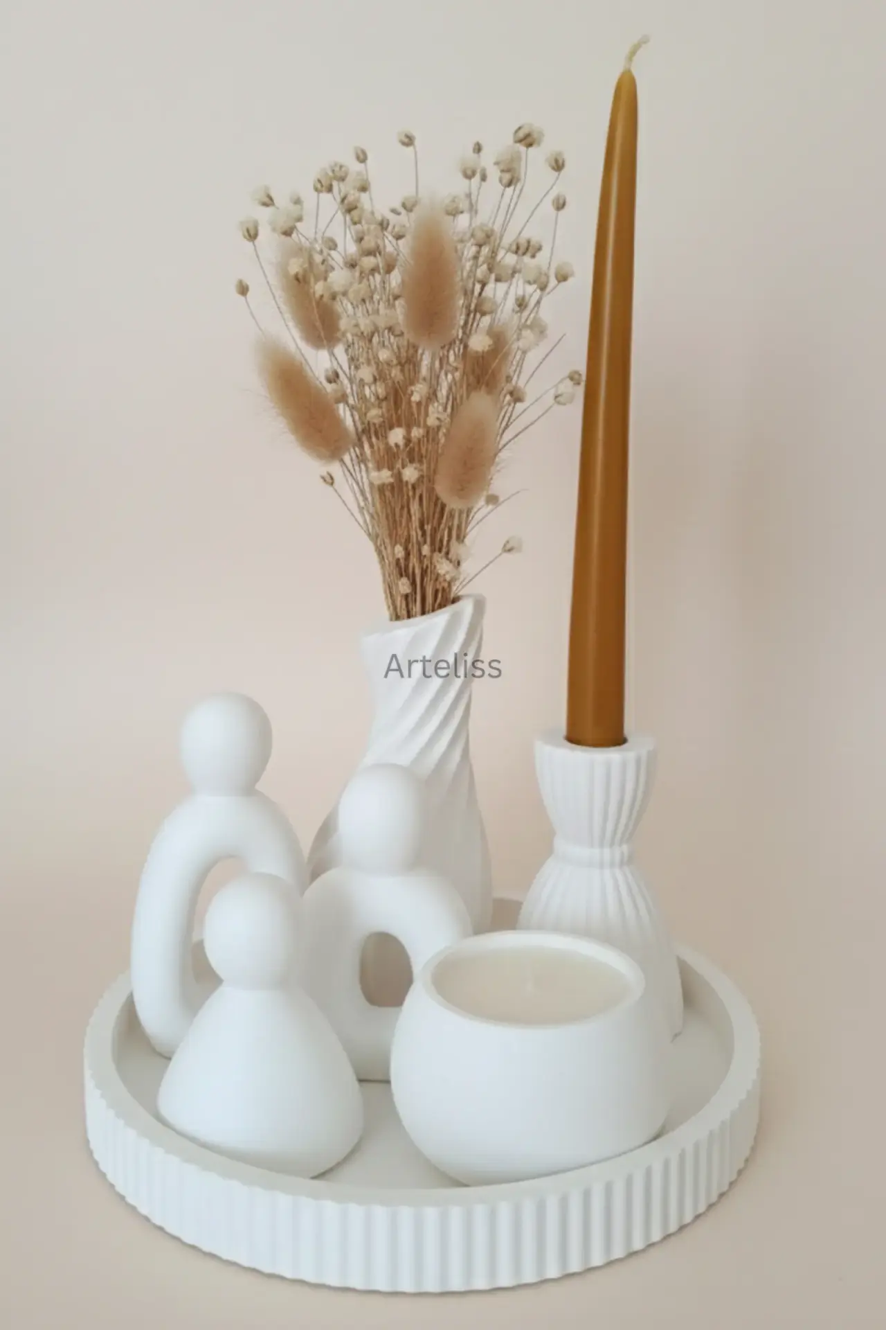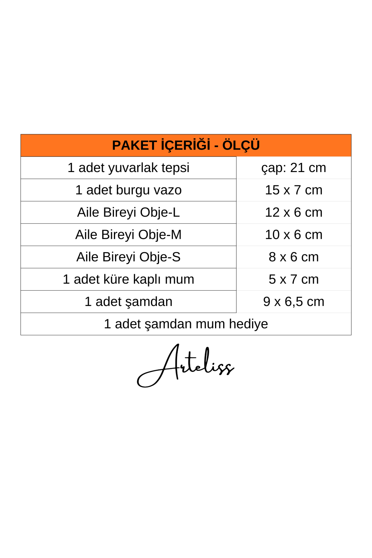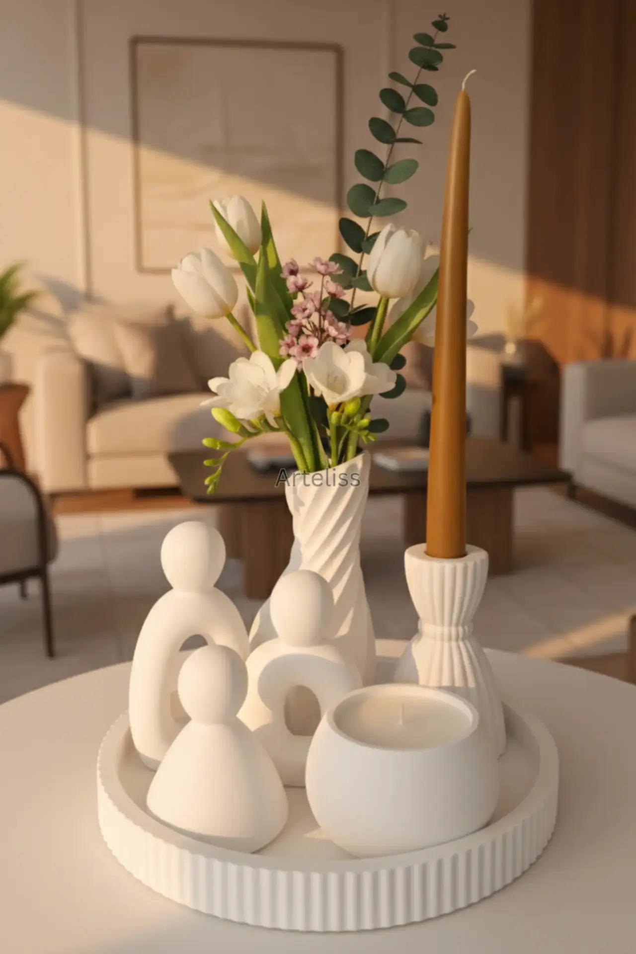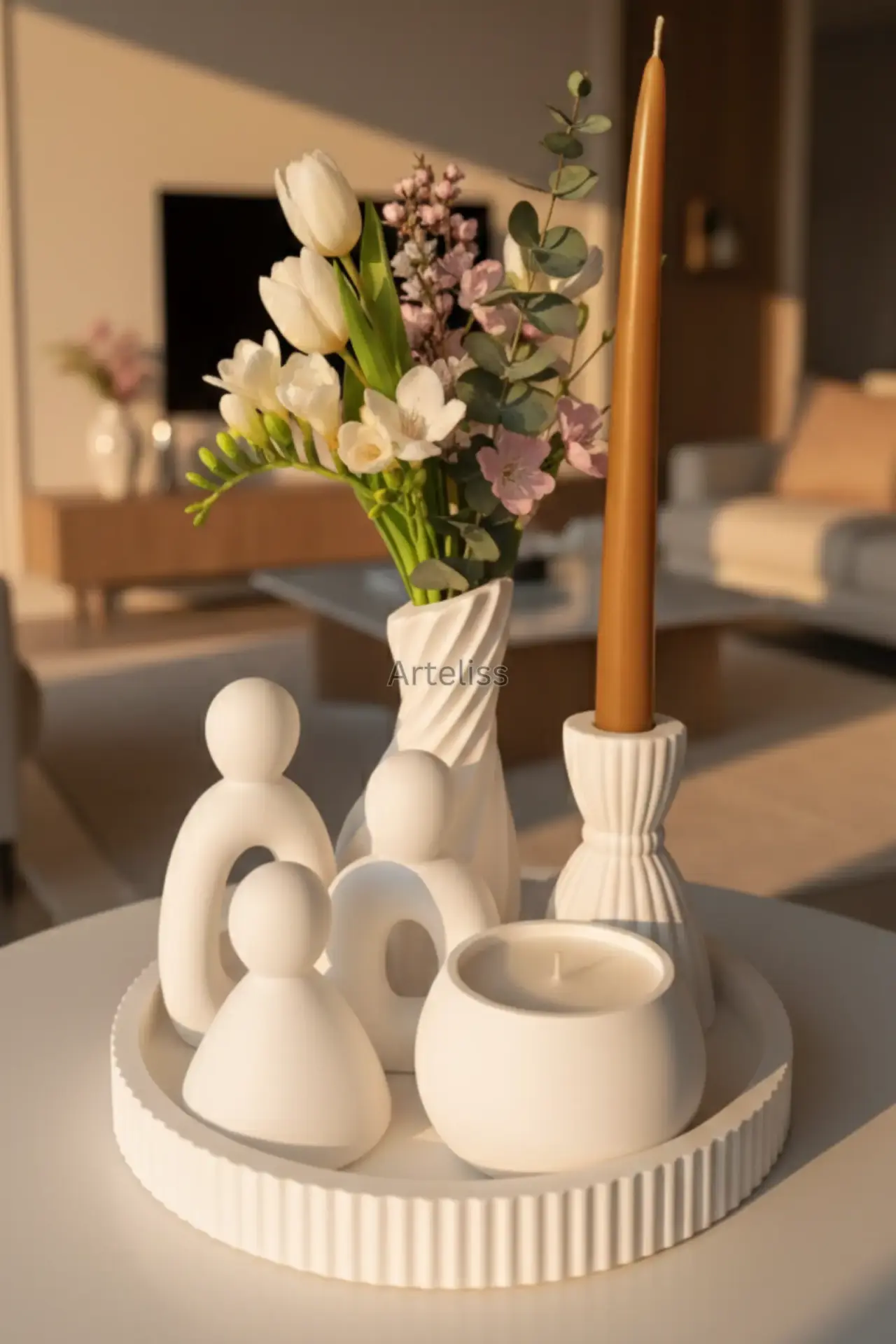 Arteliss® Family Bonds Ev Dekorasyon Seti; birliği simgeleyen üçlü aile figürünü, estetik burgu vazo ve şık bir şamdan ile oval sunum tepsisi üzerinde bir araya getirir. Minimalist beyaz dokusu ve modern hatlarıyla bu ev dekorasyon seti, dresuar veya orta sehpalar üzerinde hem duygusal bir anlam hem de zarif bir görsel bütünlük sunmak için tasarlanmıştır.