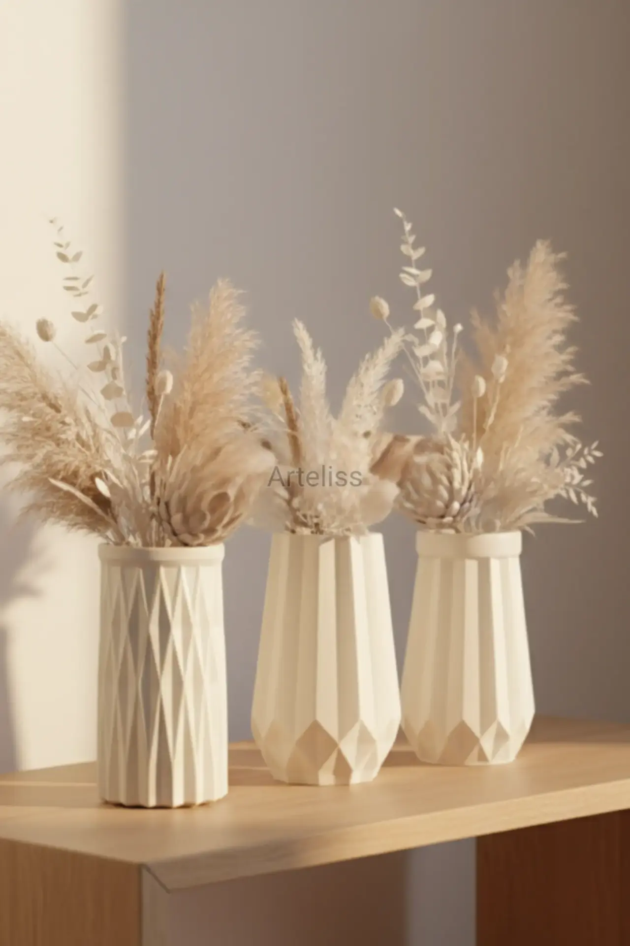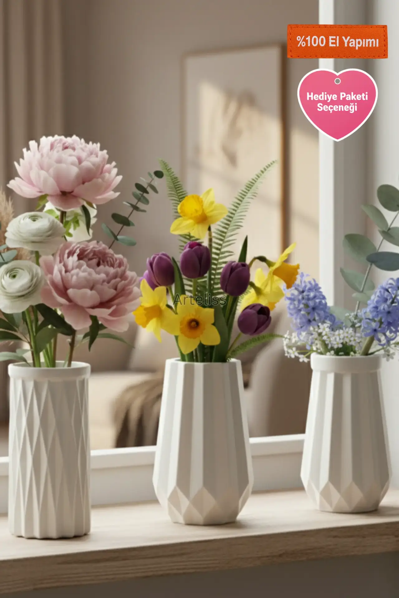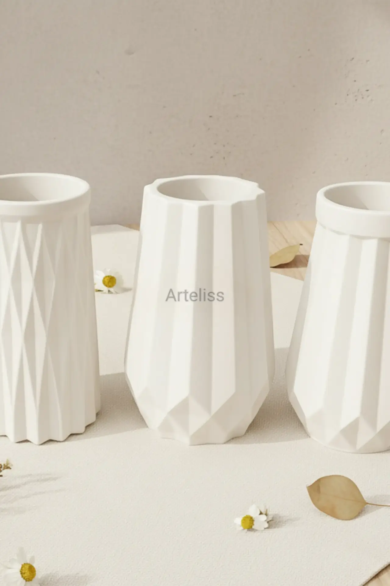 Arteliss® Geometric Trio Dekoratif Vazo Seti, geometrik formların disiplinli estetiğini ve mat beyazın yalın zarafetini yaşam alanlarınıza taşır. Modern bir galeri havası yaratmak için tasarlanan bu dekoratif vazo seti; yüzeyinde dinamik ışık oyunları yaratan baklava desenli (diamond cut) bir silindir vazo ile keskin hatlara sahip iki farklı prizmatik figürden oluşur.