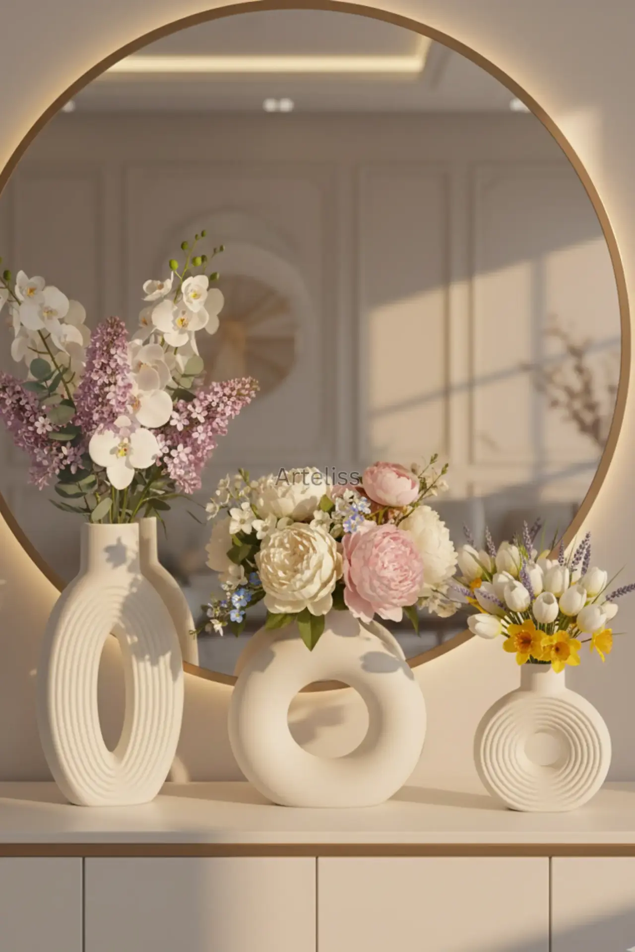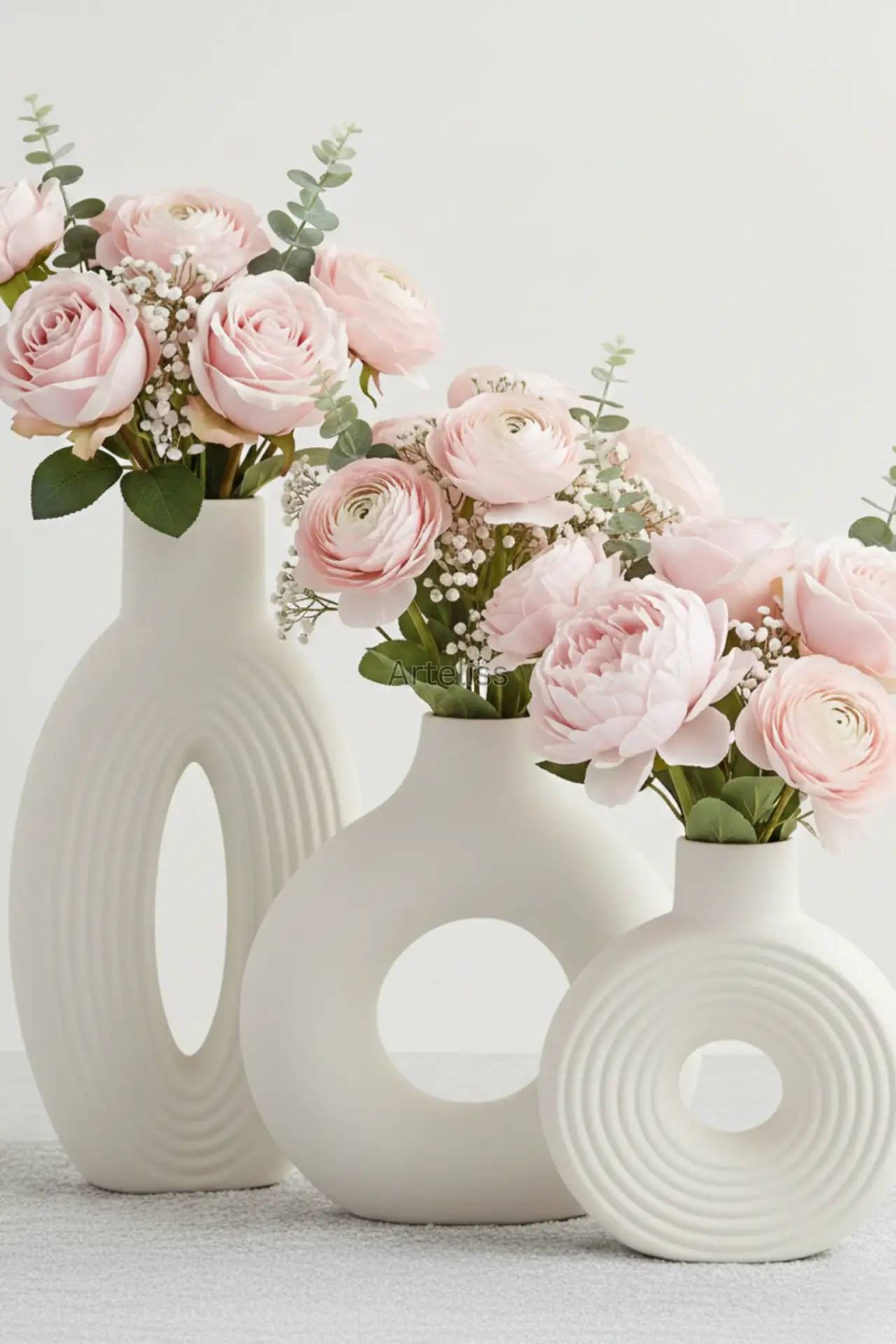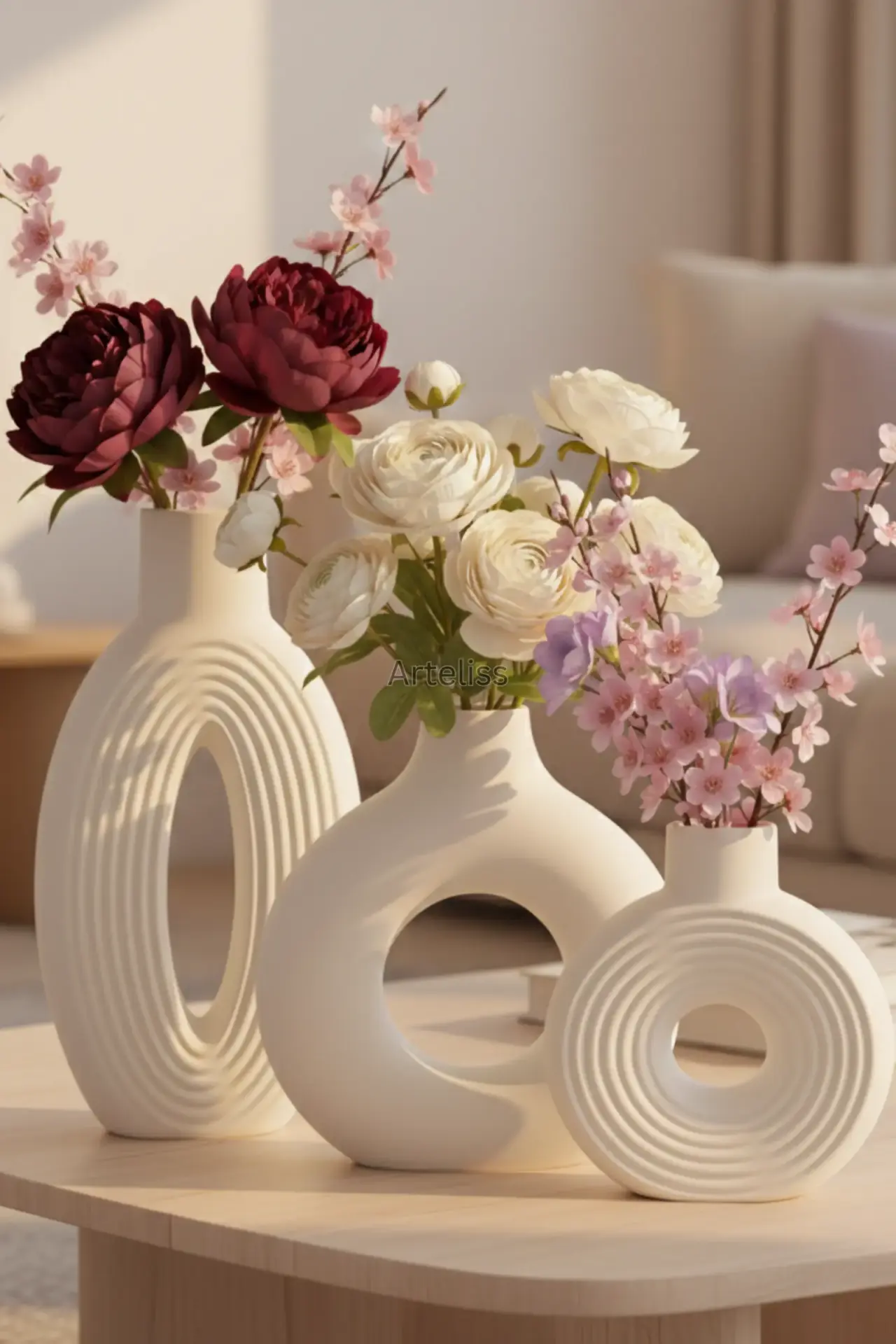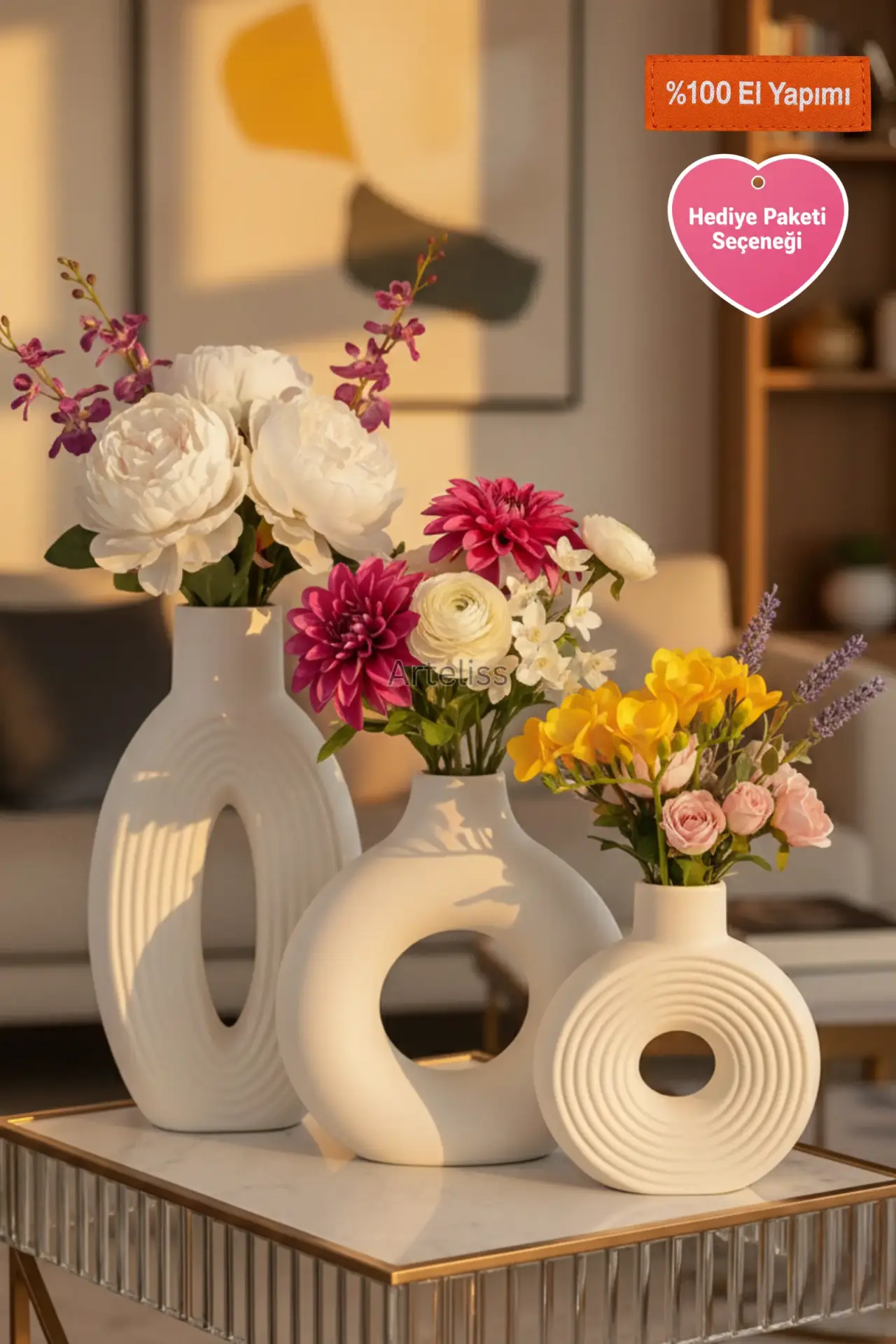 Arteliss® Grand Gallery Bohem Vazo Salon Aksesuar Seti, heykelsi formları ve büyük ölçekli tasarımlarıyla mekanınızın karakterini değiştirmek için bir araya getirildi. Görkemli bir salon aksesuar seti arayanlar için tasarlanan bu özel seçki; ikonik halka vazo, dikey çizgisel dokulu yüksek elips vazo ve konsantrik çizgili kompakt yuvarlak vazodan oluşur. Mat beyazın saflığını ve modern sanatın dinamizmini taşıyan bu parçalar, yaşam alanlarınıza rafine bir derinlik katar.