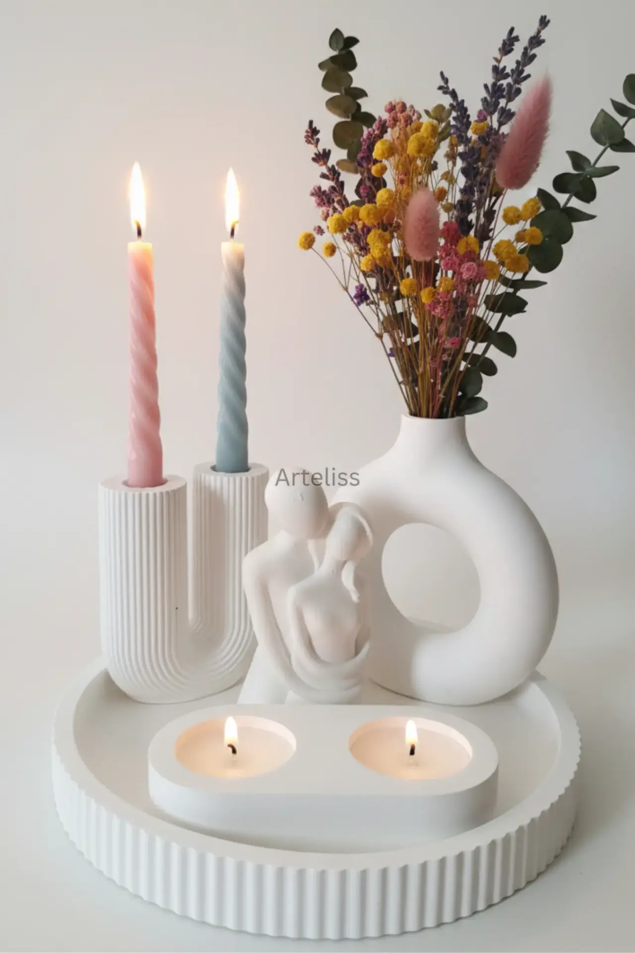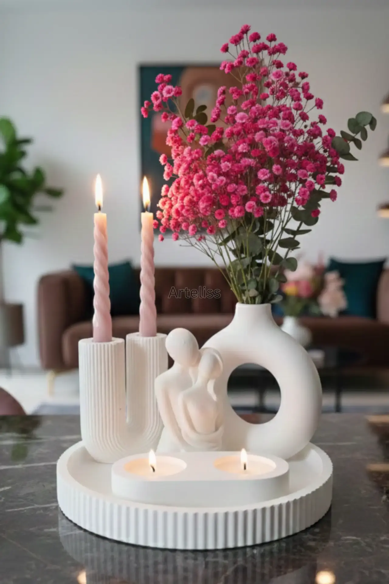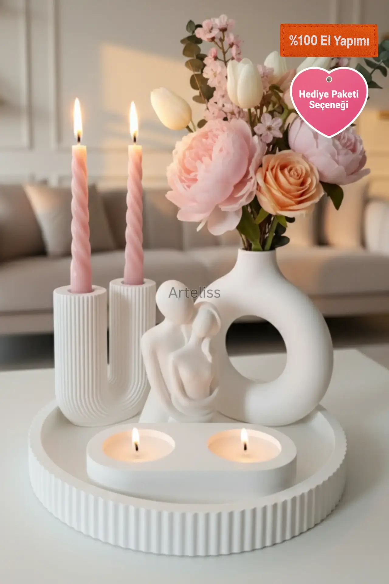 Arteliss® Harmonious Union Romantik hediye dekor set; minimalist halka vazosu ve birbirine kenetlenmiş sevgili figürüyle yaşam alanlarınızda sanatsal bir denge kurar. Sevdikleriniz için eşsiz bir romantik hediye dekor seçeneği sunan bu set; yuvarlak sunum tepsisi, dikey çizgili U form şamdan ve ikili tealight mumluk parçalarıyla dresuar veya orta sehpalarınızda modern bir bohem estetiği sergilemek için tasarlanmıştır.