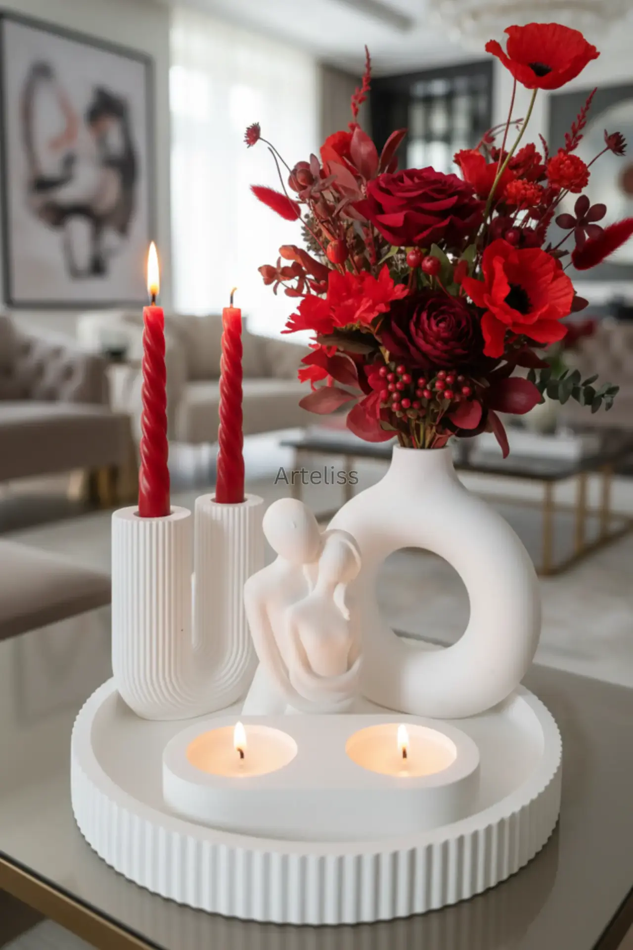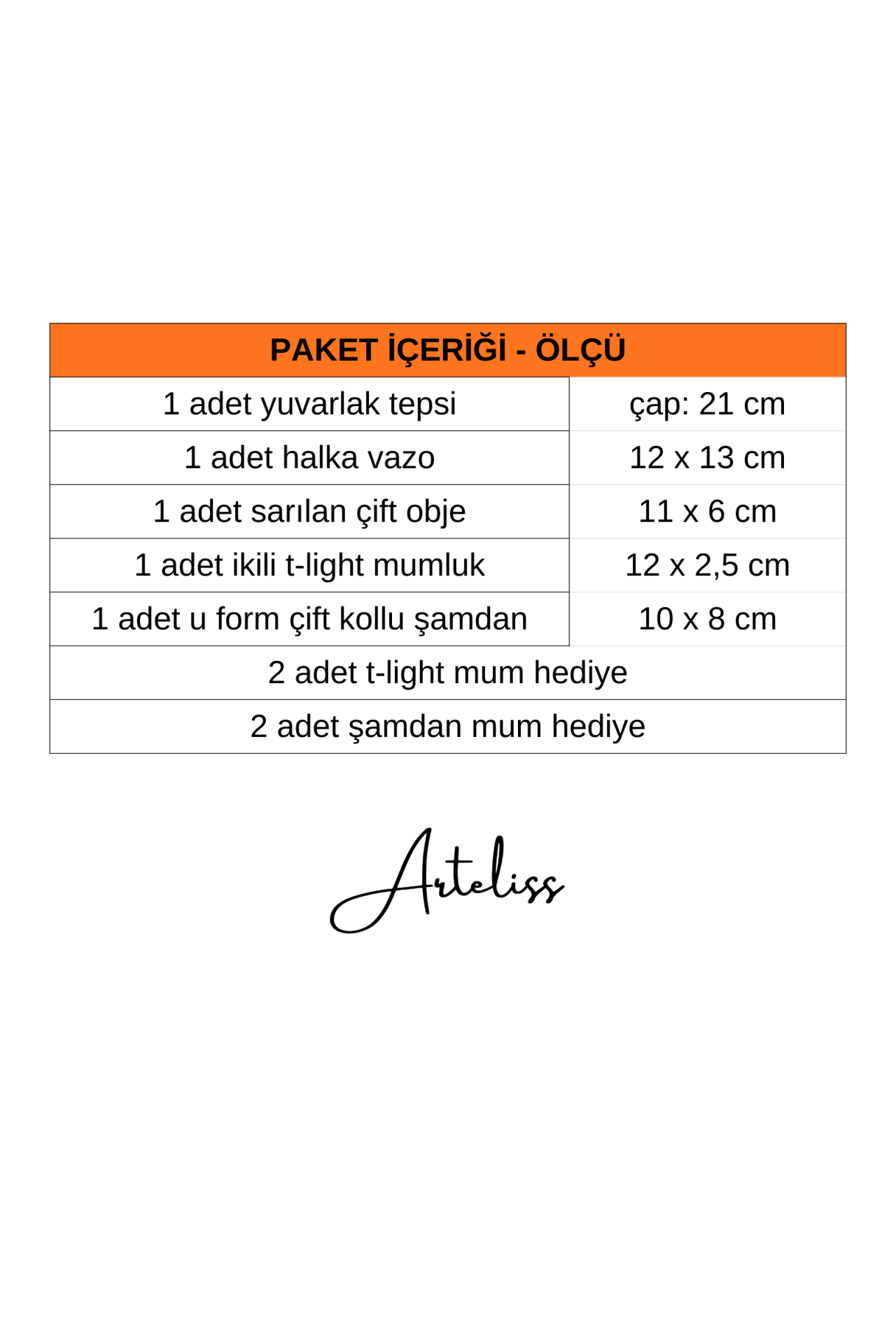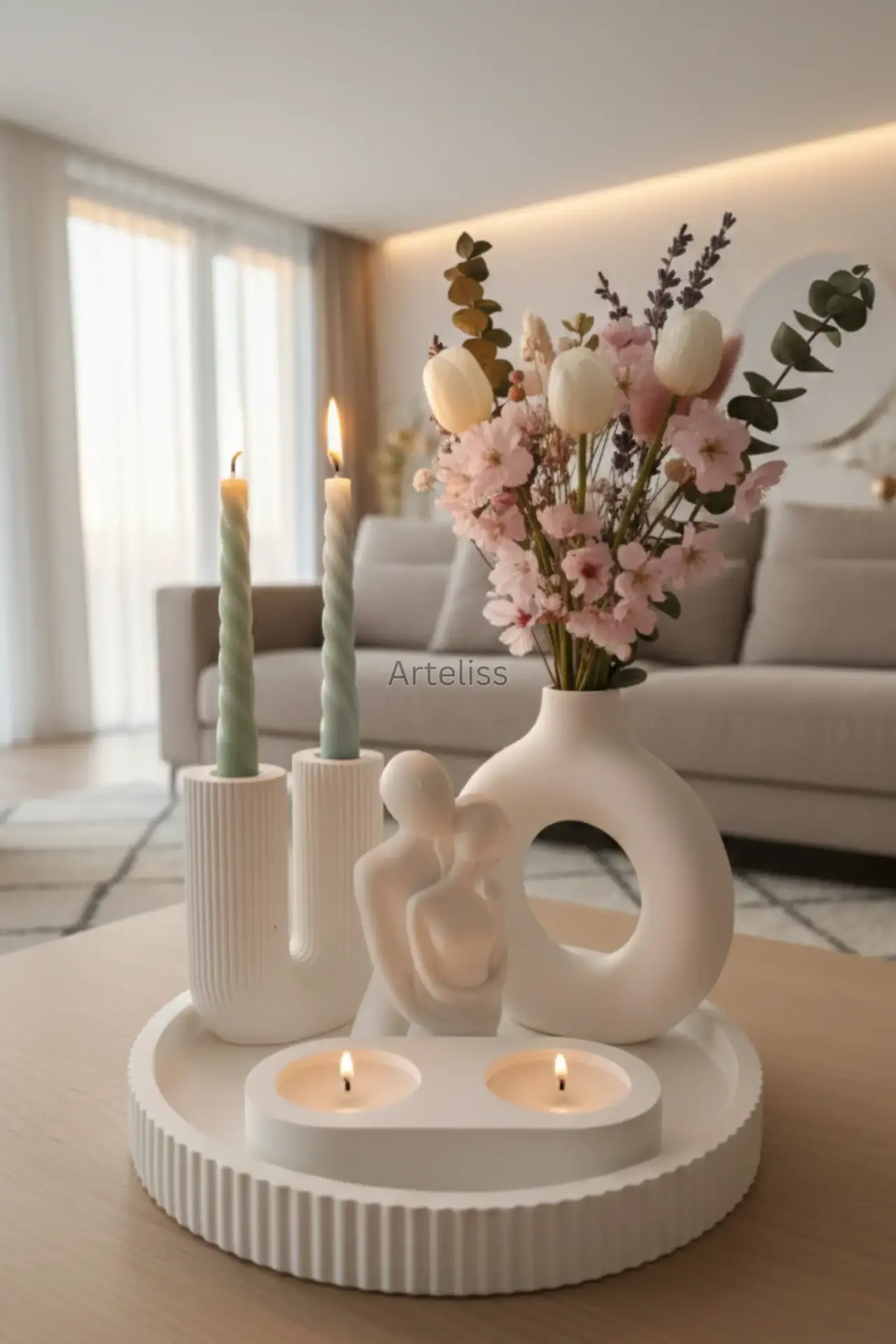 Arteliss® Harmonious Union Romantik hediye dekor set; minimalist halka vazosu ve birbirine kenetlenmiş sevgili figürüyle yaşam alanlarınızda sanatsal bir denge kurar. Sevdikleriniz için eşsiz bir romantik hediye dekor seçeneği sunan bu set; yuvarlak sunum tepsisi, dikey çizgili U form şamdan ve ikili tealight mumluk parçalarıyla dresuar veya orta sehpalarınızda modern bir bohem estetiği sergilemek için tasarlanmıştır.
