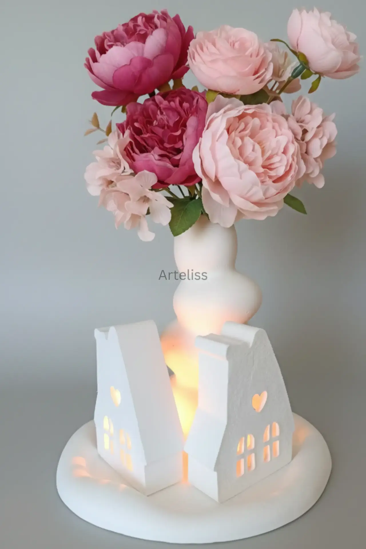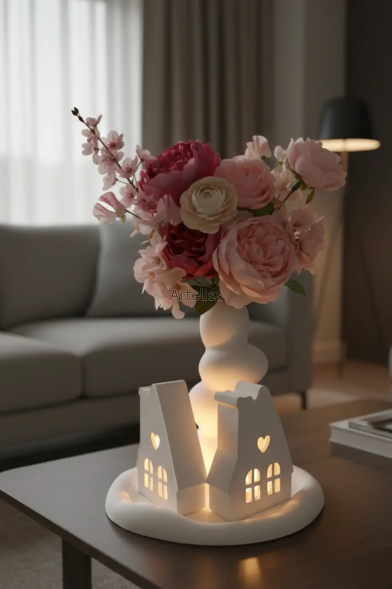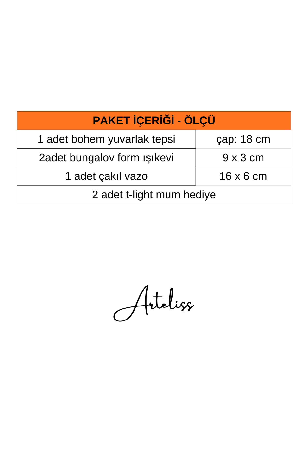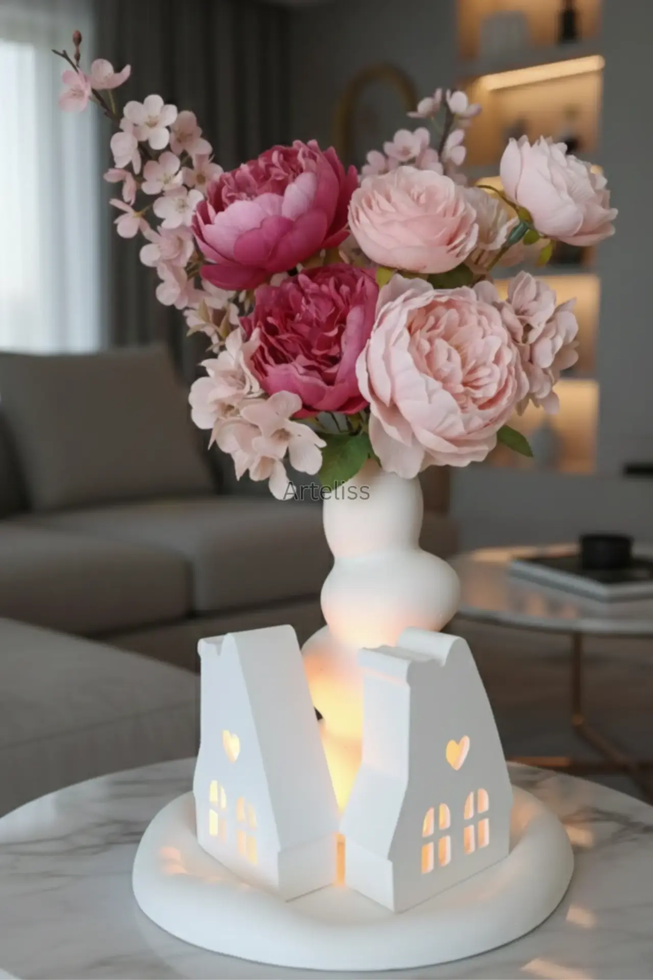 Arteliss® Heart Bungalow Bohem Dekorasyon Seti; kalp pencereli ışıkevlerini, estetik bir çakıl vazo ve sunum tablası ile bir araya getirerek yaşam alanlarınızda sıcak bir odak noktası oluşturur. Ev figürlerinin içinden süzülen yumuşak ışık ve organik hatlara sahip bu bohem dekorasyon seti, dresuar veya orta sehpalar üzerinde huzurlu bir ambiyans yaratmak için tasarlanmıştır.