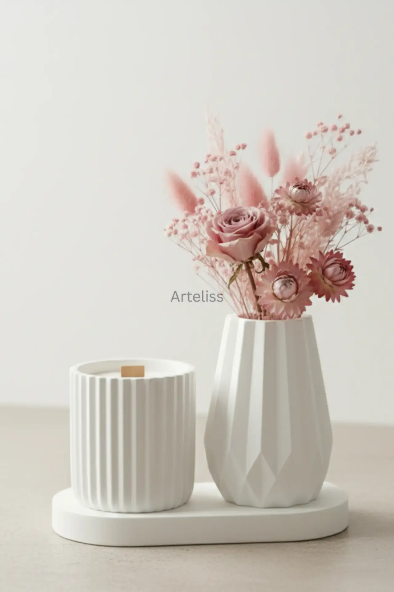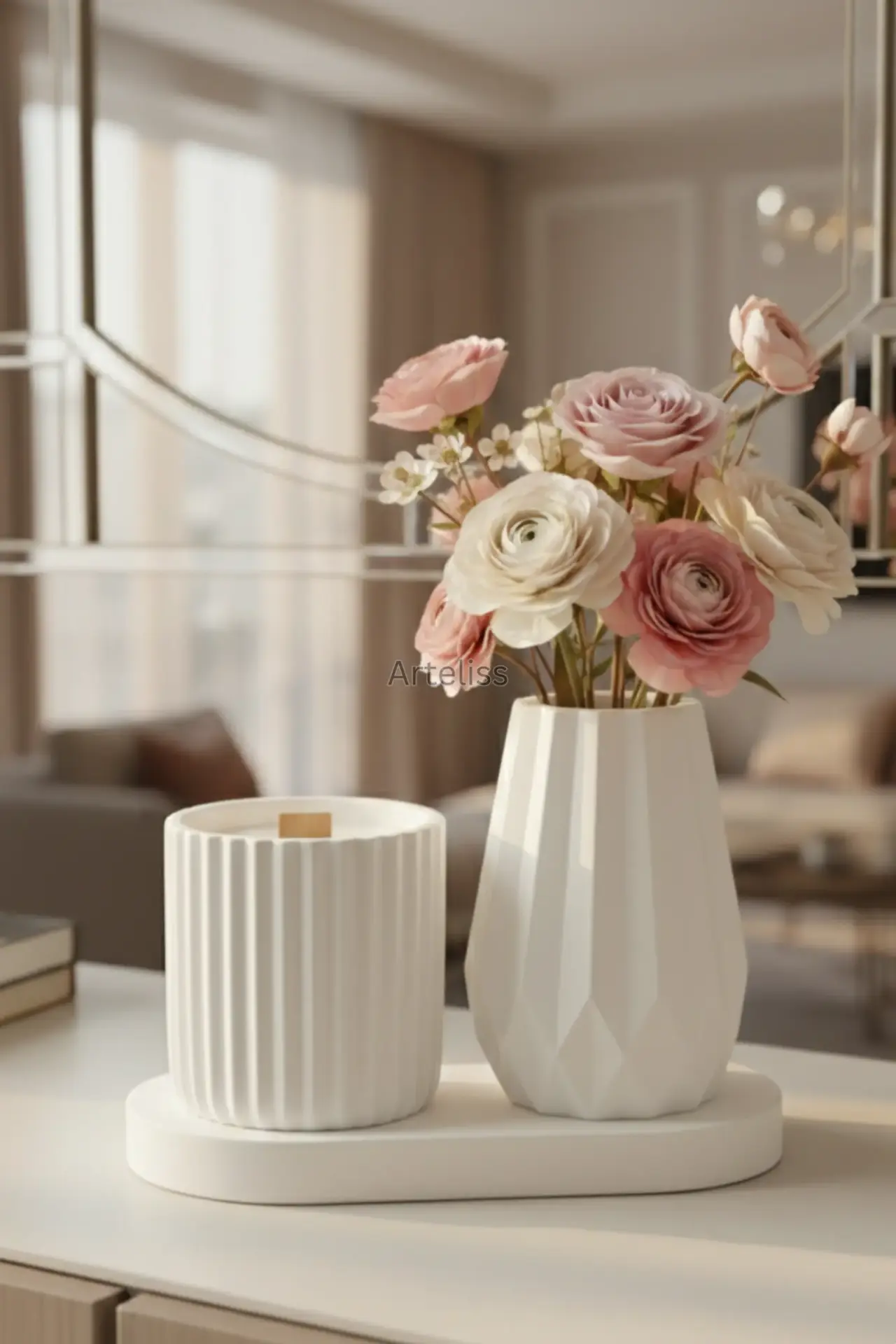 Arteliss® Honeysuckle Aura Modern Ev Dekorasyon Seti; dikey çizgili (ribbed) vazo, oval sunum tablası ve ahşap fitilli hanımeli çiçeği kokulu büyük mumuyla yaşam alanınızda sofistike bir atmosfer yaratır. Evinizin her köşesine zarafet katacak bu modern ev dekorasyon seti, pürüzsüz beyaz dokusuyla tüm mobilya renklerine kusursuz uyum sağlar.