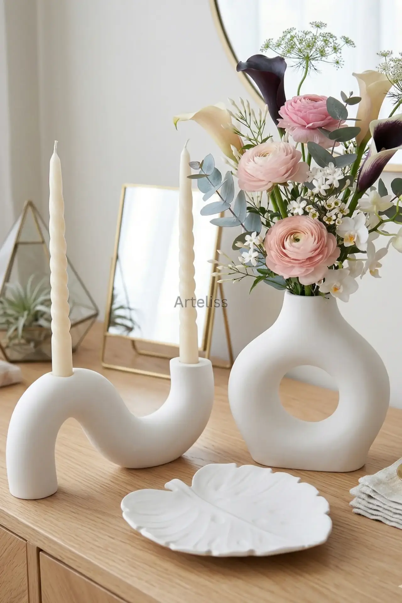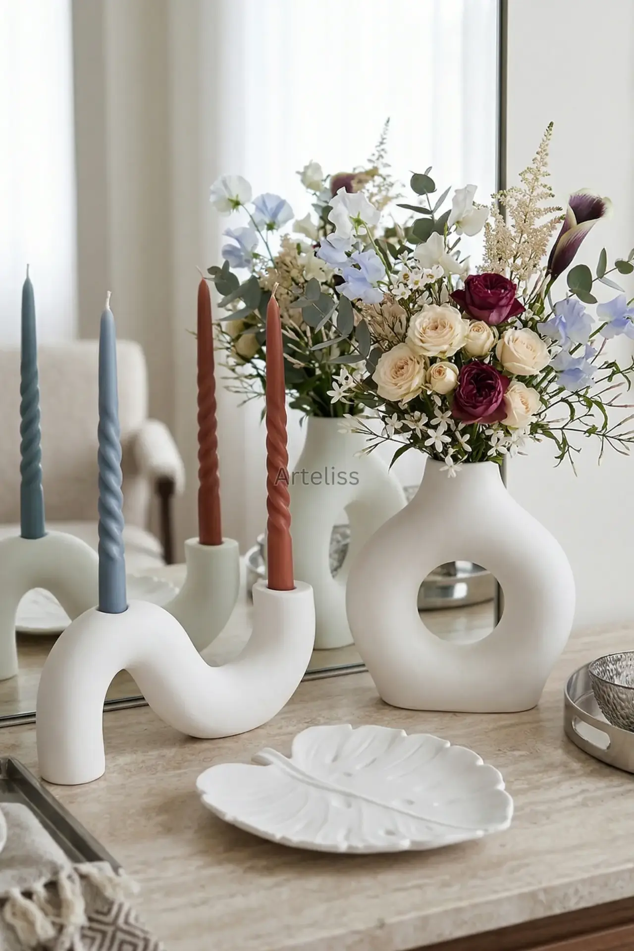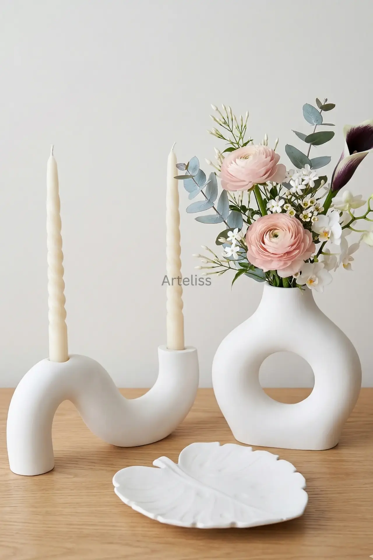 Arteliss® Luna Curve Modern Ev Aksesuarları Seti, akışkan çizgilerin ve doğal formların kusursuz uyumunu yaşam alanlarınıza taşır. Modern bir estetik anlayışıyla tasarlanan bu Modern Ev Aksesuarları seti; S-formlu heykelsi bir şamdan, ikonik halka vazo ve ince işçilikli bir yaprak tabaktan oluşur. Mat beyazın saflığını taşıyan bu parçalar, dresuar ve yemek masalarında sanatsal bir derinlik yaratır.