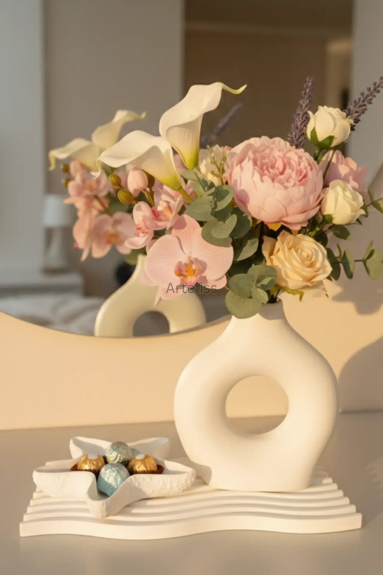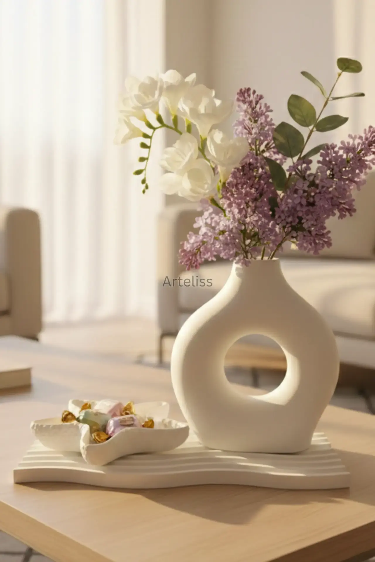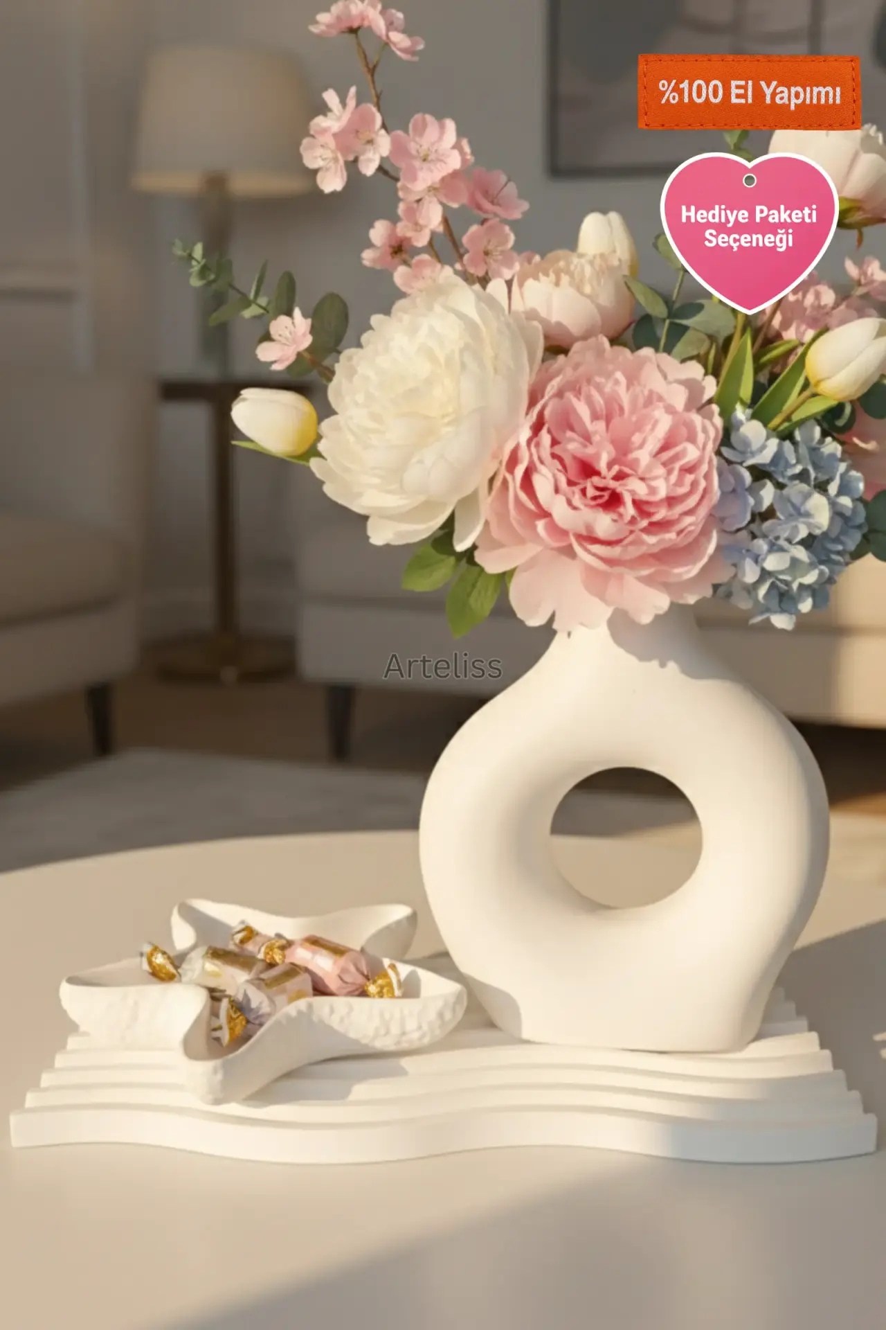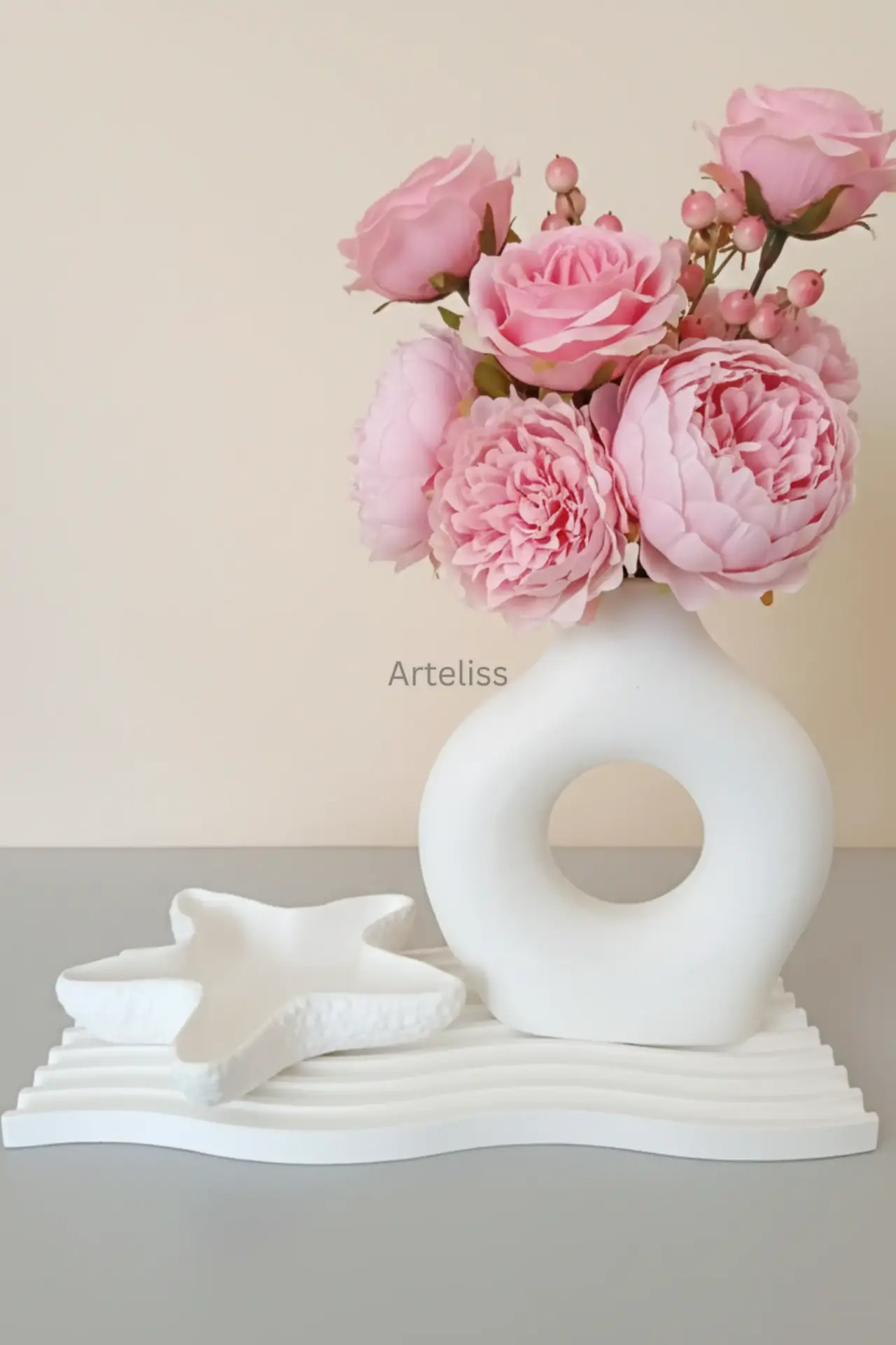 Arteliss® Marine Halo Zen Dekorasyon Seti; ikonik halka vazosu ve dokulu deniz yıldızı formlu tabağıyla yaşam alanlarınızda estetik bir sahil kasabası havası oluşturur. Minimalist tasarımıyla dikkat çeken bu zen dekorasyon seti, dresuar veya orta sehpalar üzerinde hem taze çiçekleriniz için sanatsal bir alan hem de dingin bir görsel bütünlük sunmak için tasarlanmıştır.