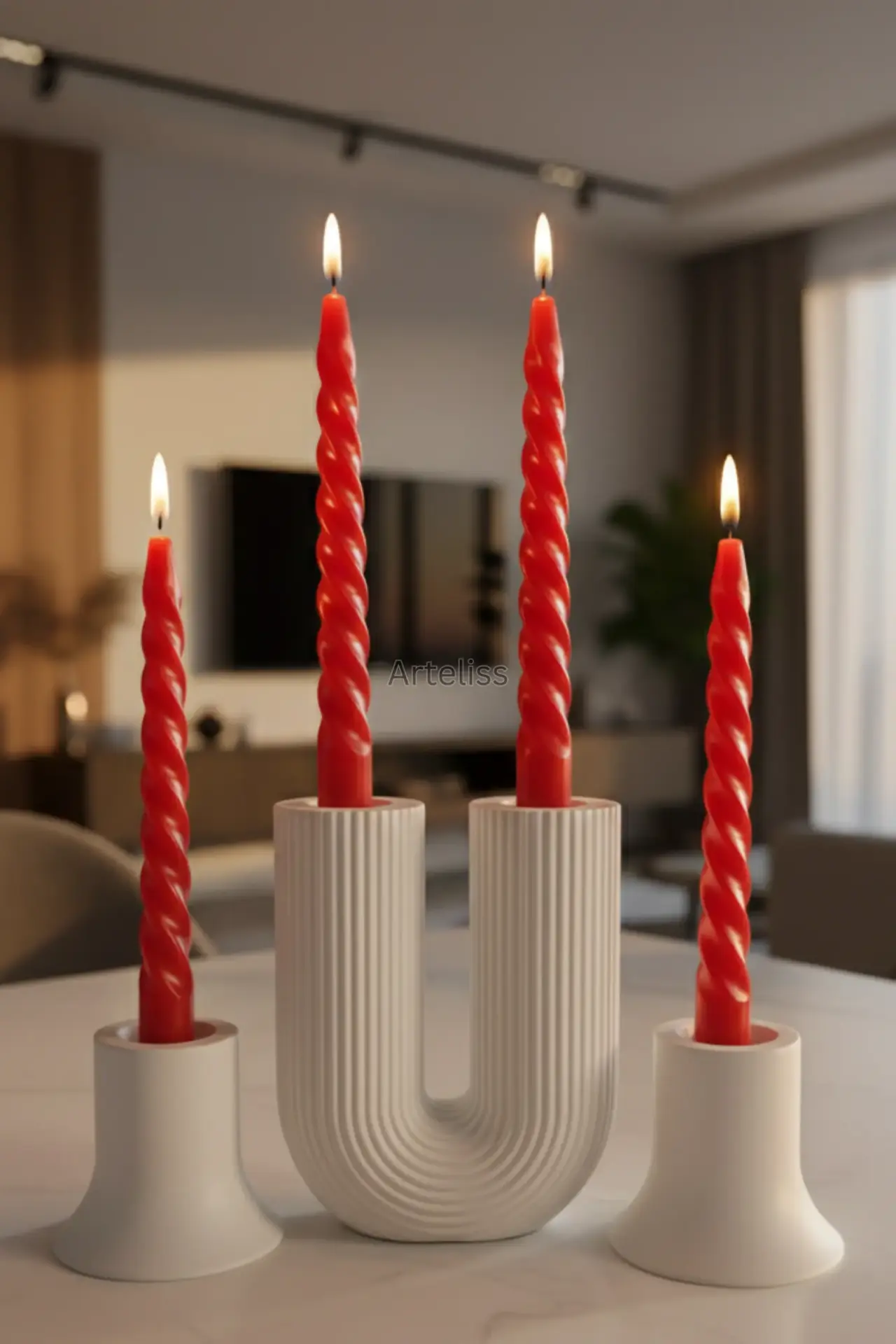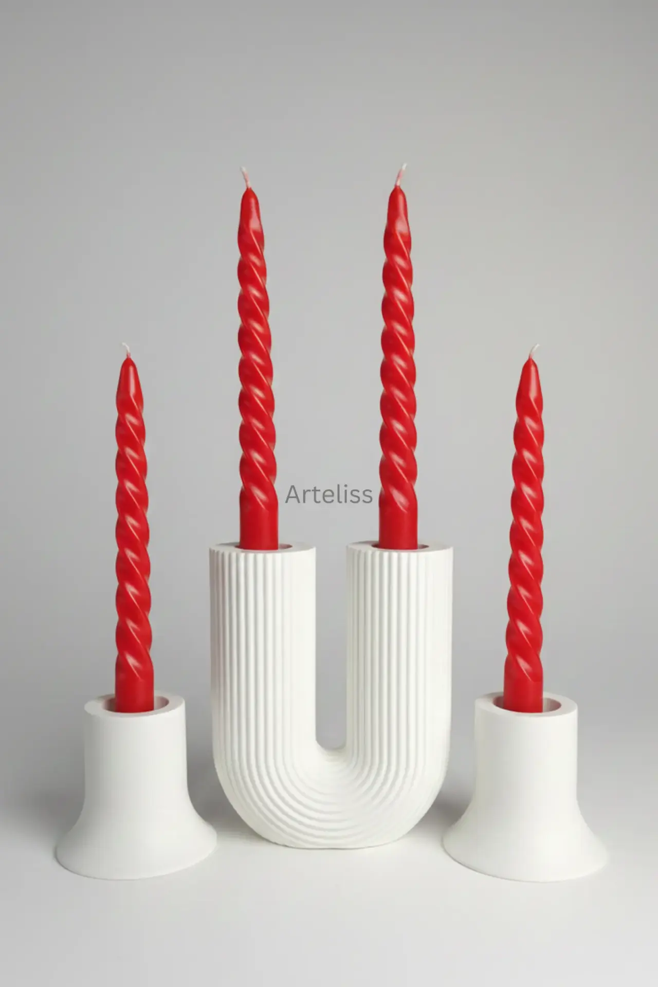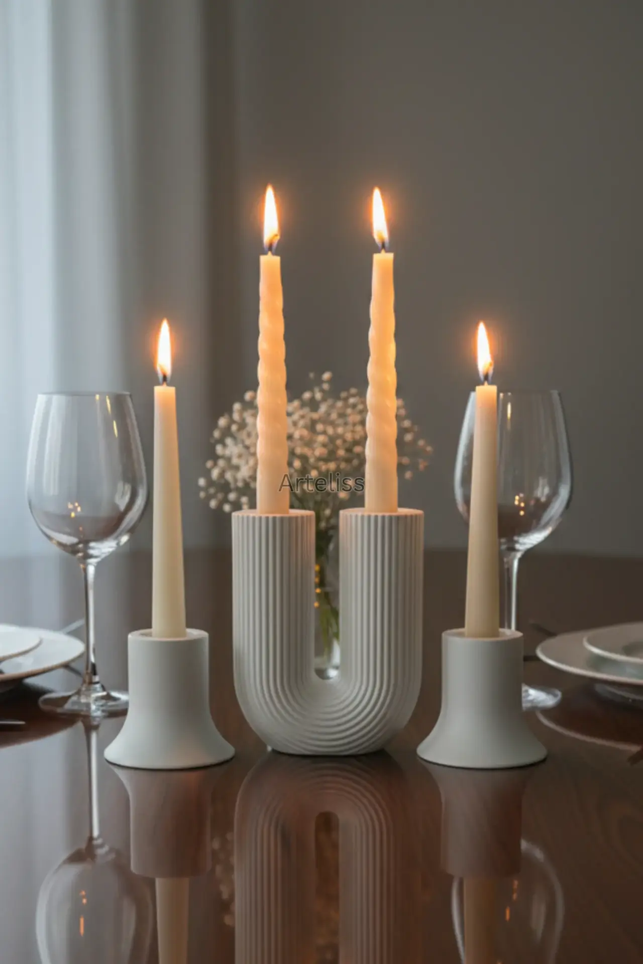 Arteliss® Modern Arch koleksiyonu, ikonik U formu ve dikey çizgili dokusuyla yemek masaları ile orta sehpalar üzerinde heykelsi bir aydınlatma odağı oluşturmak için tasarlanmıştır. U formlu büyük bir parça ve iki adet mini şamdandan oluşan bu şamdan mumluk seti, farklı yükseklikleri sayesinde her türlü sofra sunumuna derinlik ve modern bir estetik katar.