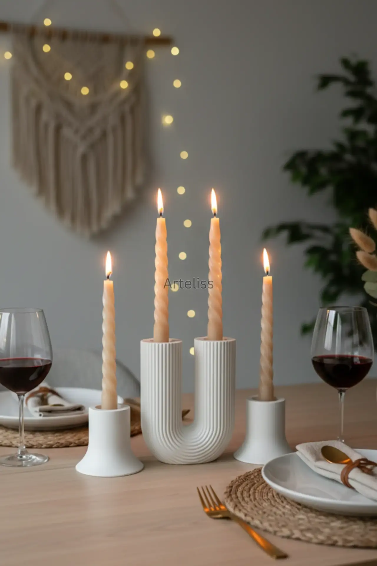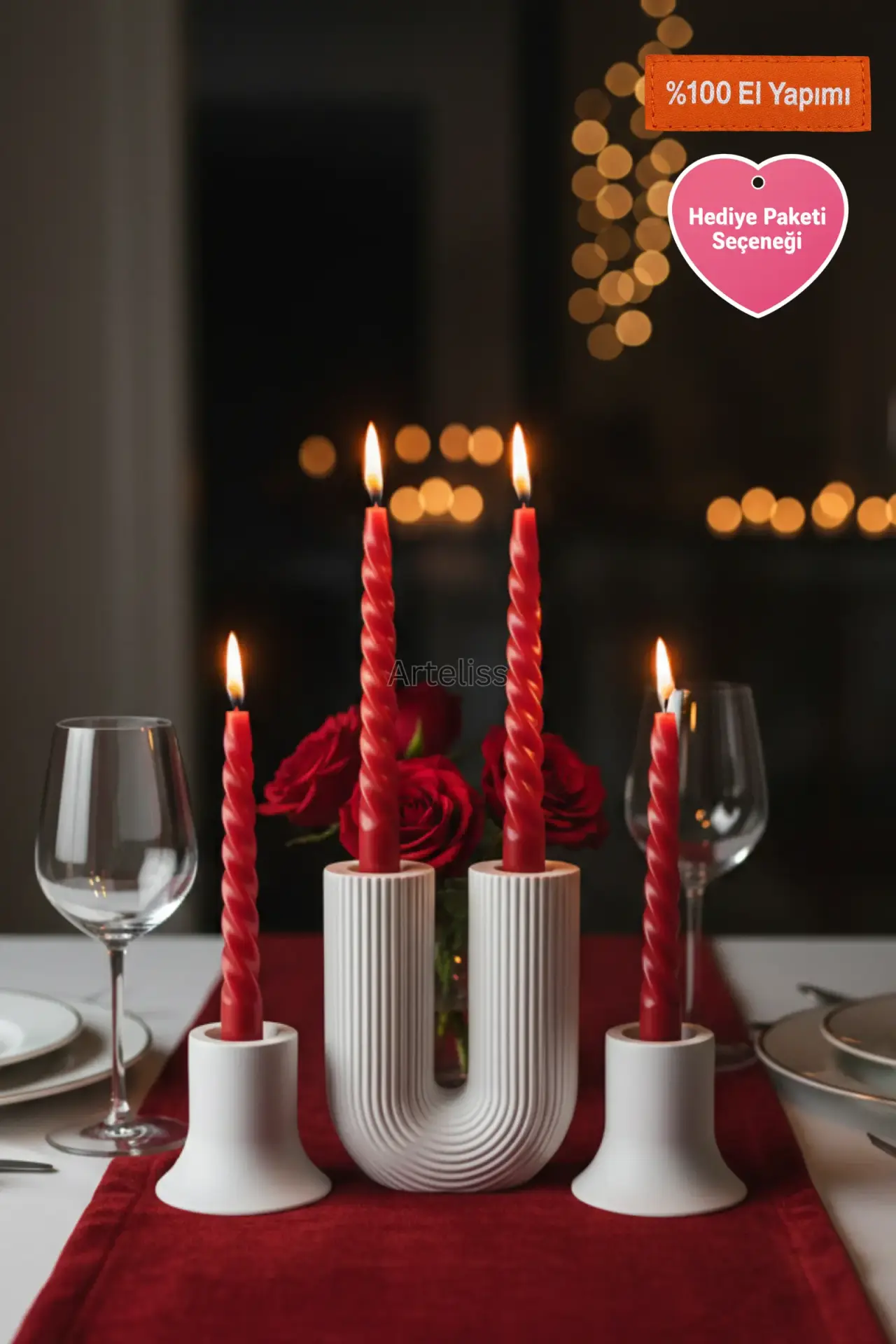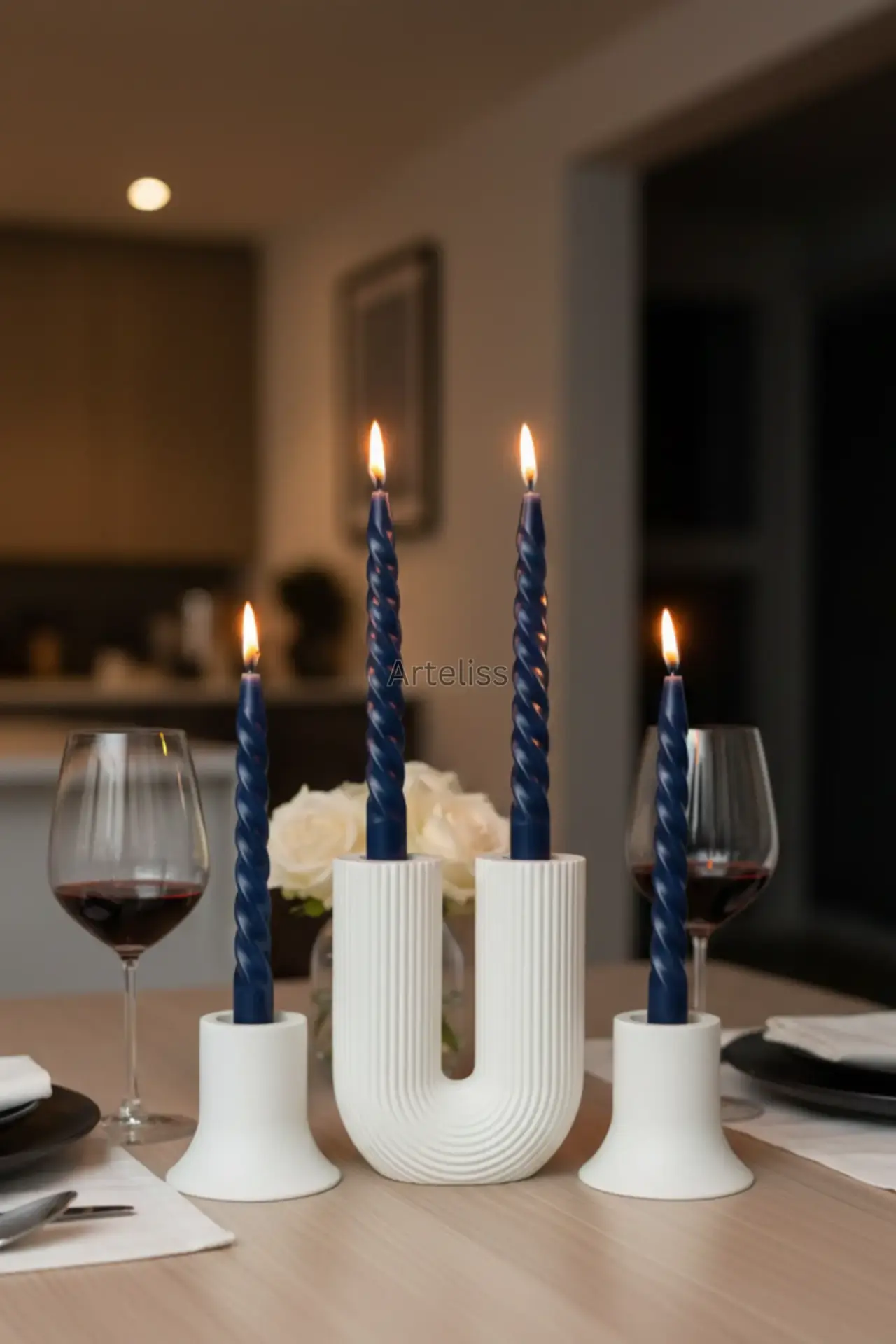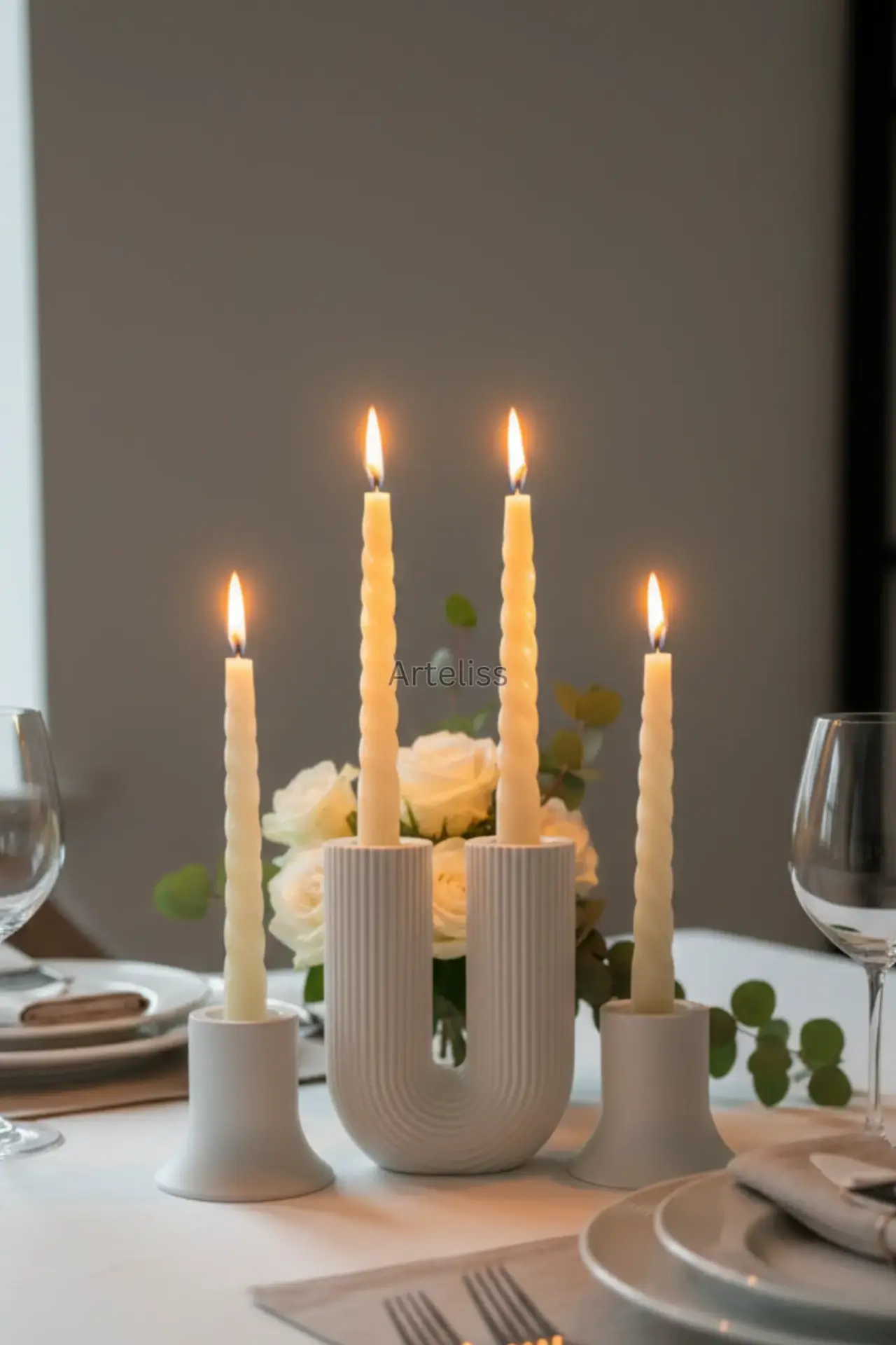 Arteliss® Modern Arch koleksiyonu, ikonik U formu ve dikey çizgili dokusuyla yemek masaları ile orta sehpalar üzerinde heykelsi bir aydınlatma odağı oluşturmak için tasarlanmıştır. U formlu büyük bir parça ve iki adet mini şamdandan oluşan bu şamdan mumluk seti, farklı yükseklikleri sayesinde her türlü sofra sunumuna derinlik ve modern bir estetik katar.