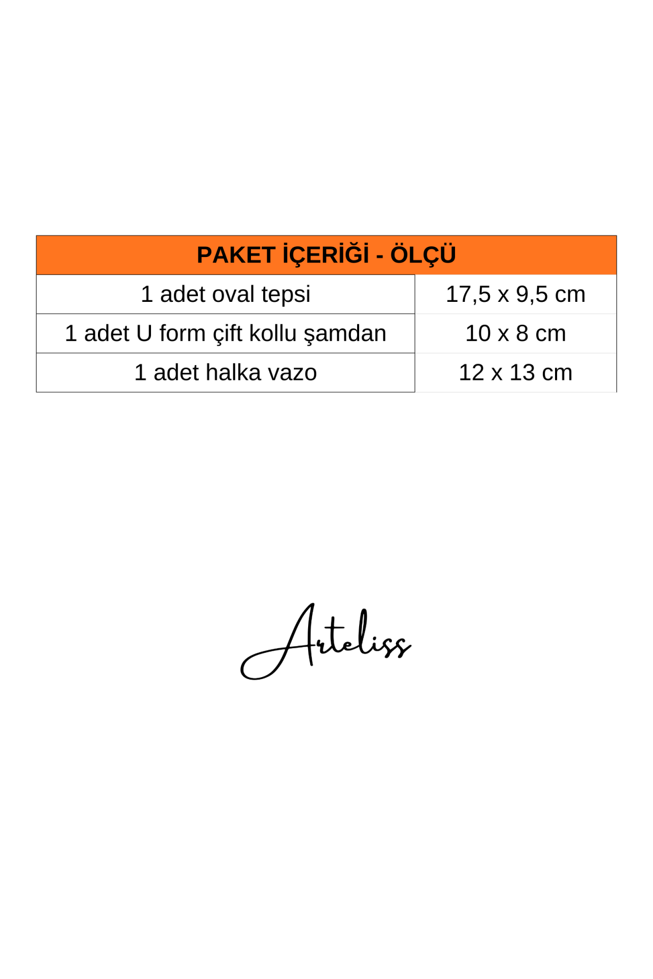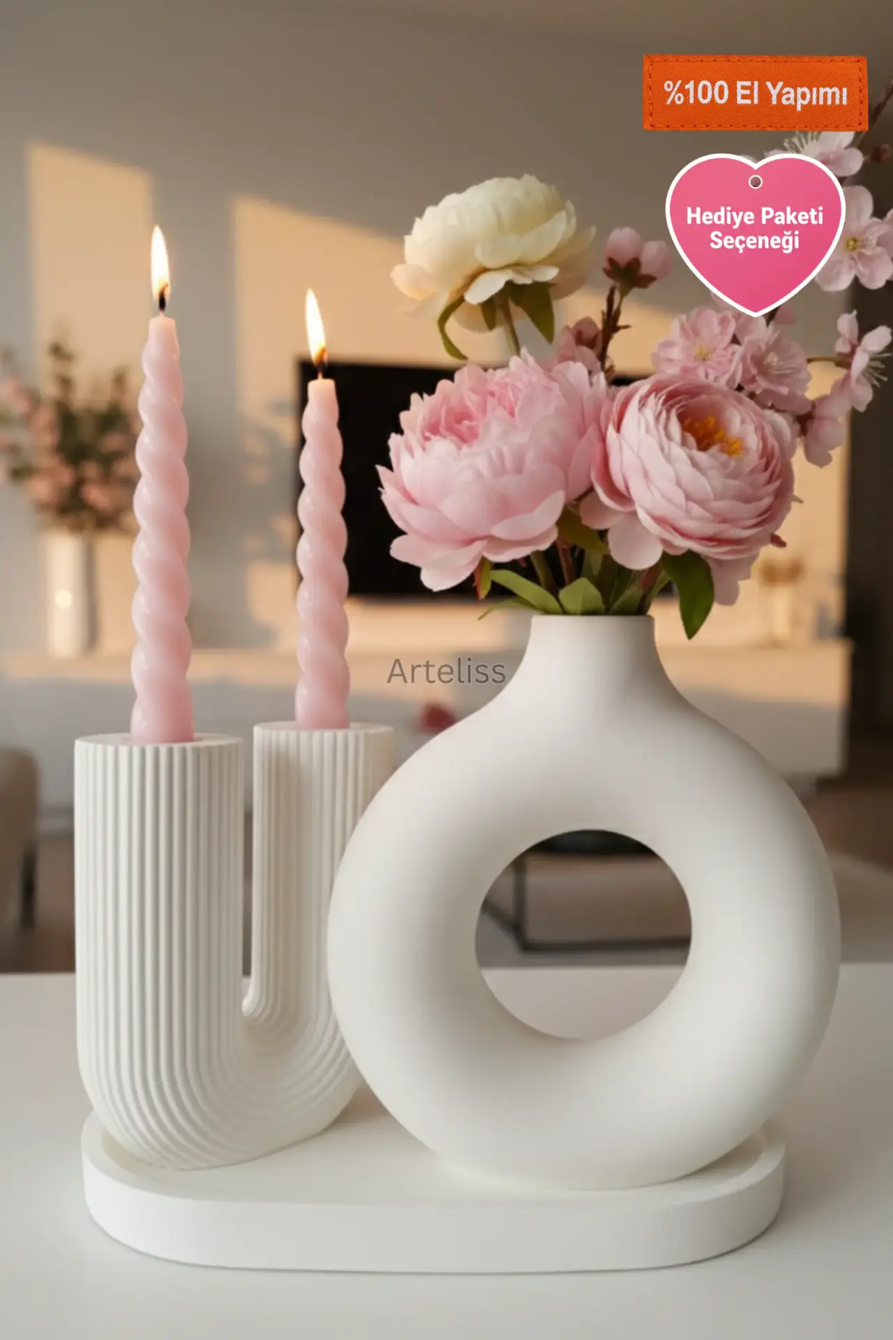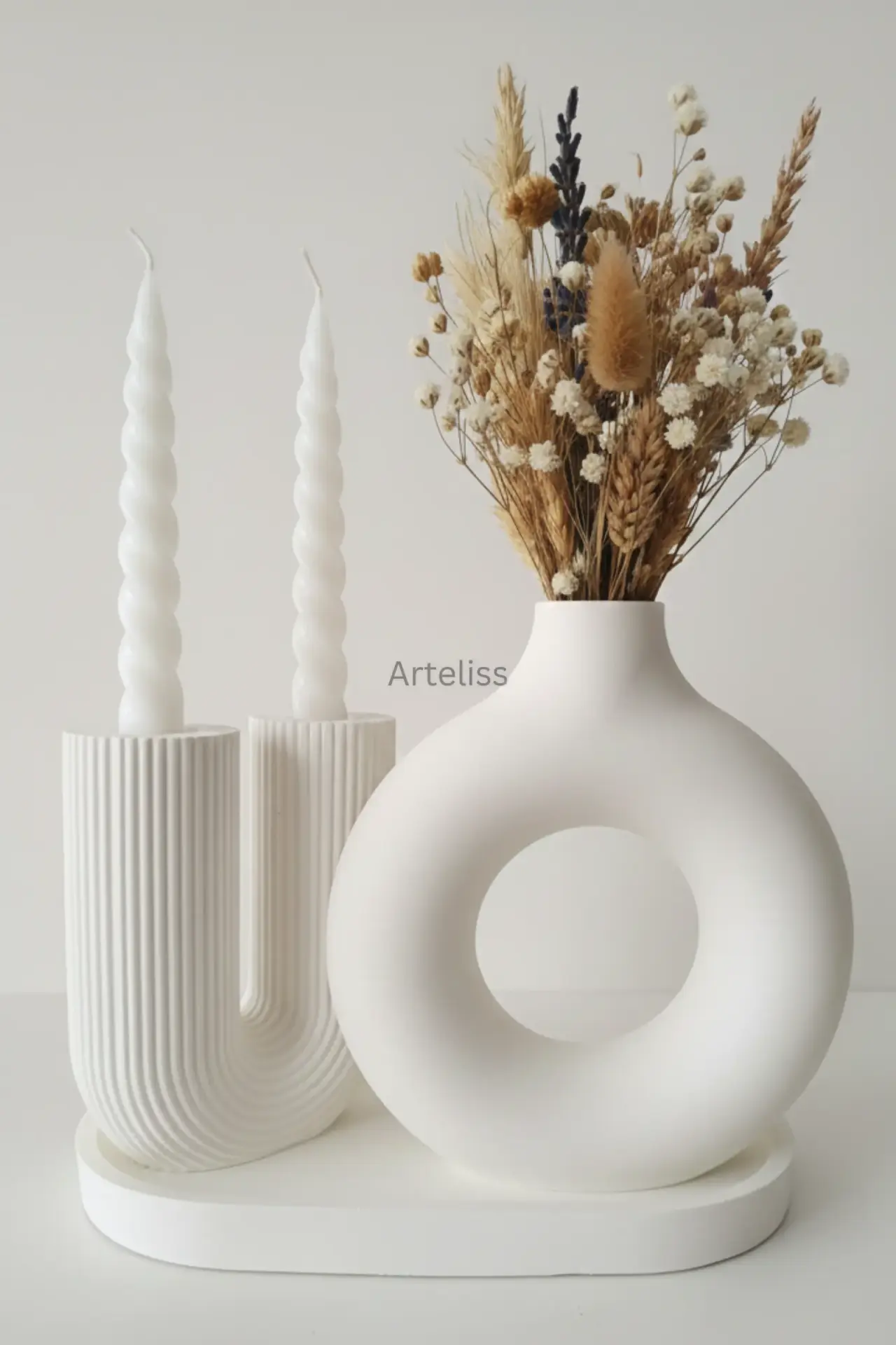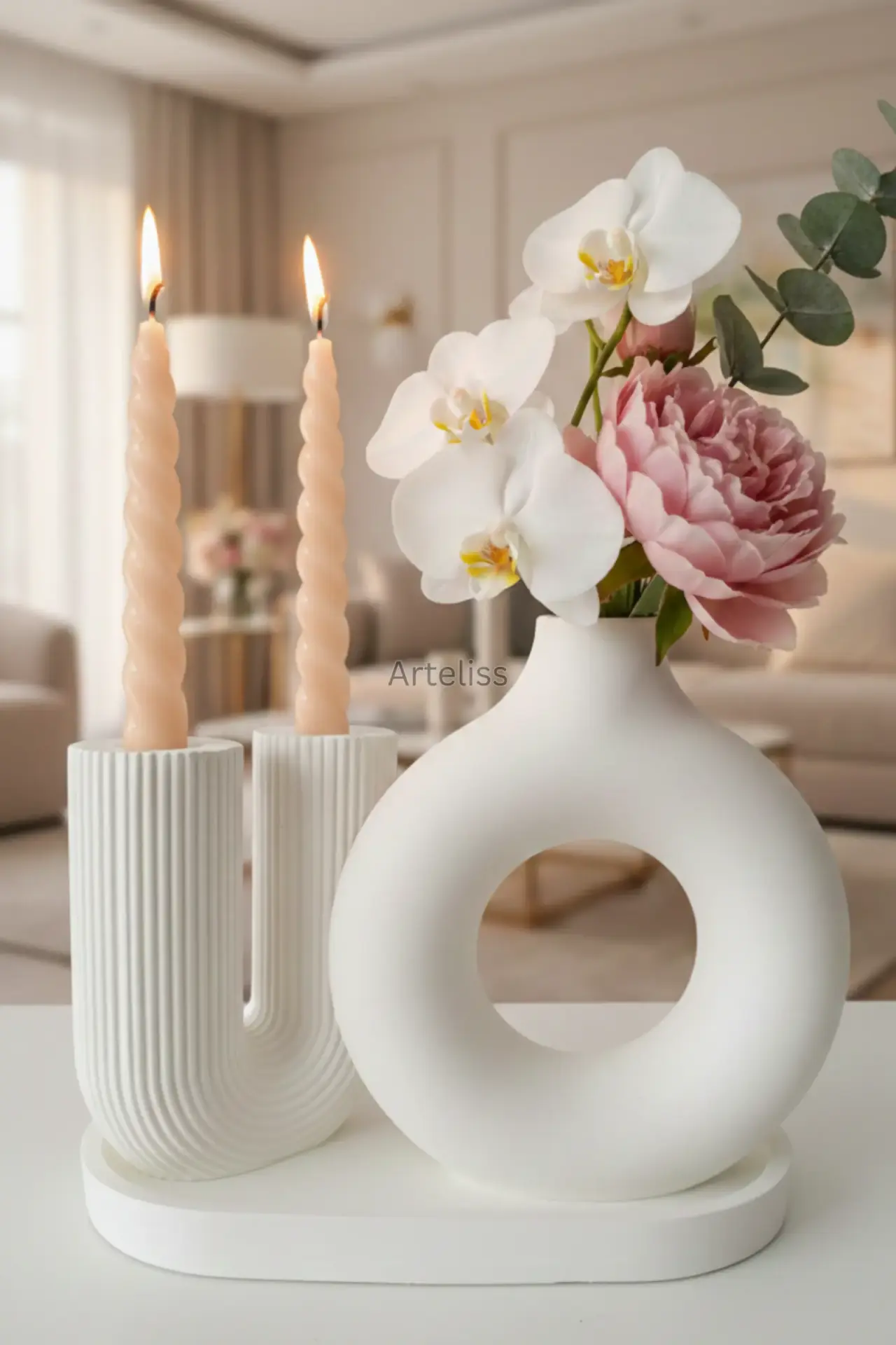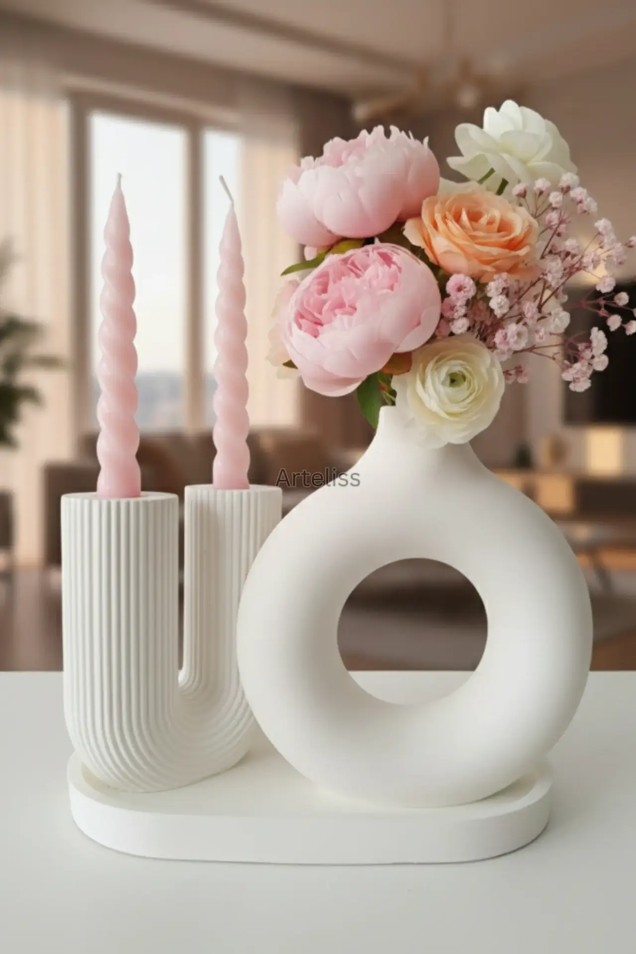 Arteliss® Modern Gallery dekoratif set; dikey çizgili U şamdanı ve minimal halka vazoyu oval bir sunum tepsisi üzerinde buluşturarak yaşam alanlarınızda modern bir sergileme alanı yaratır. Geometrik formları ve pürüzsüz beyaz dokusuyla bu iskandinav ev dekorasyonu seti, orta sehpa, konsol veya antre dresuarlarında estetik bir odak noktası oluşturmak için tasarlanmıştır.