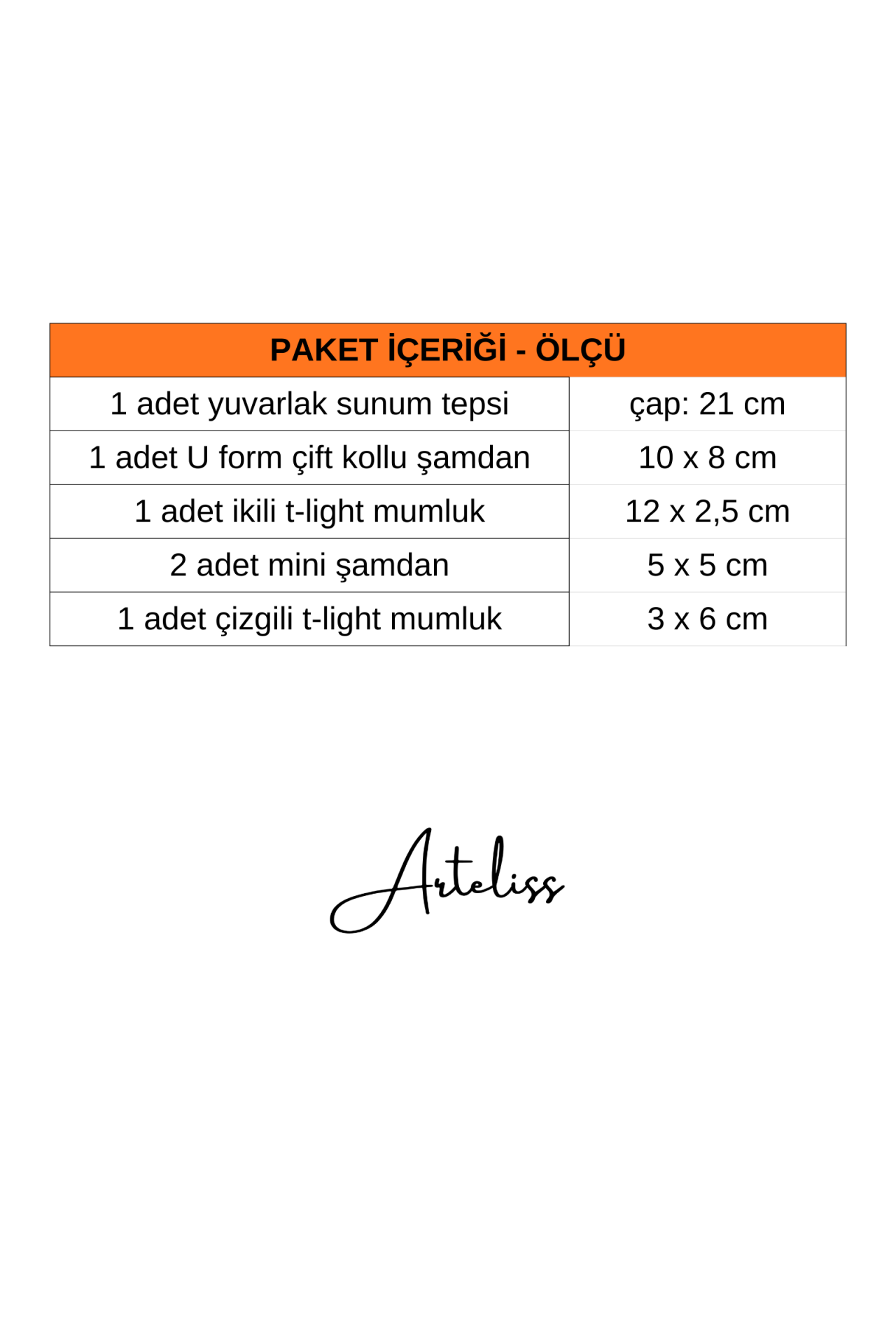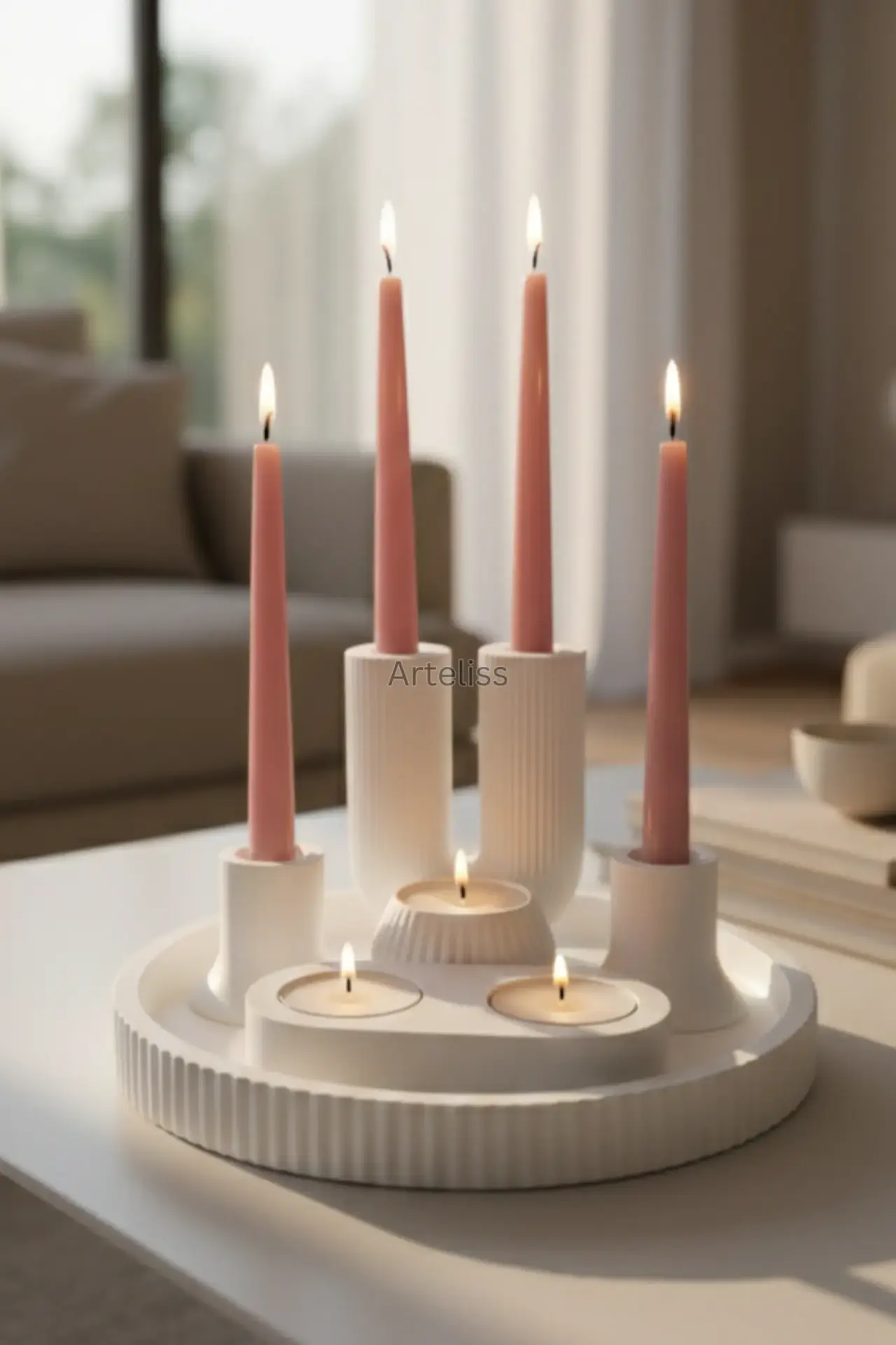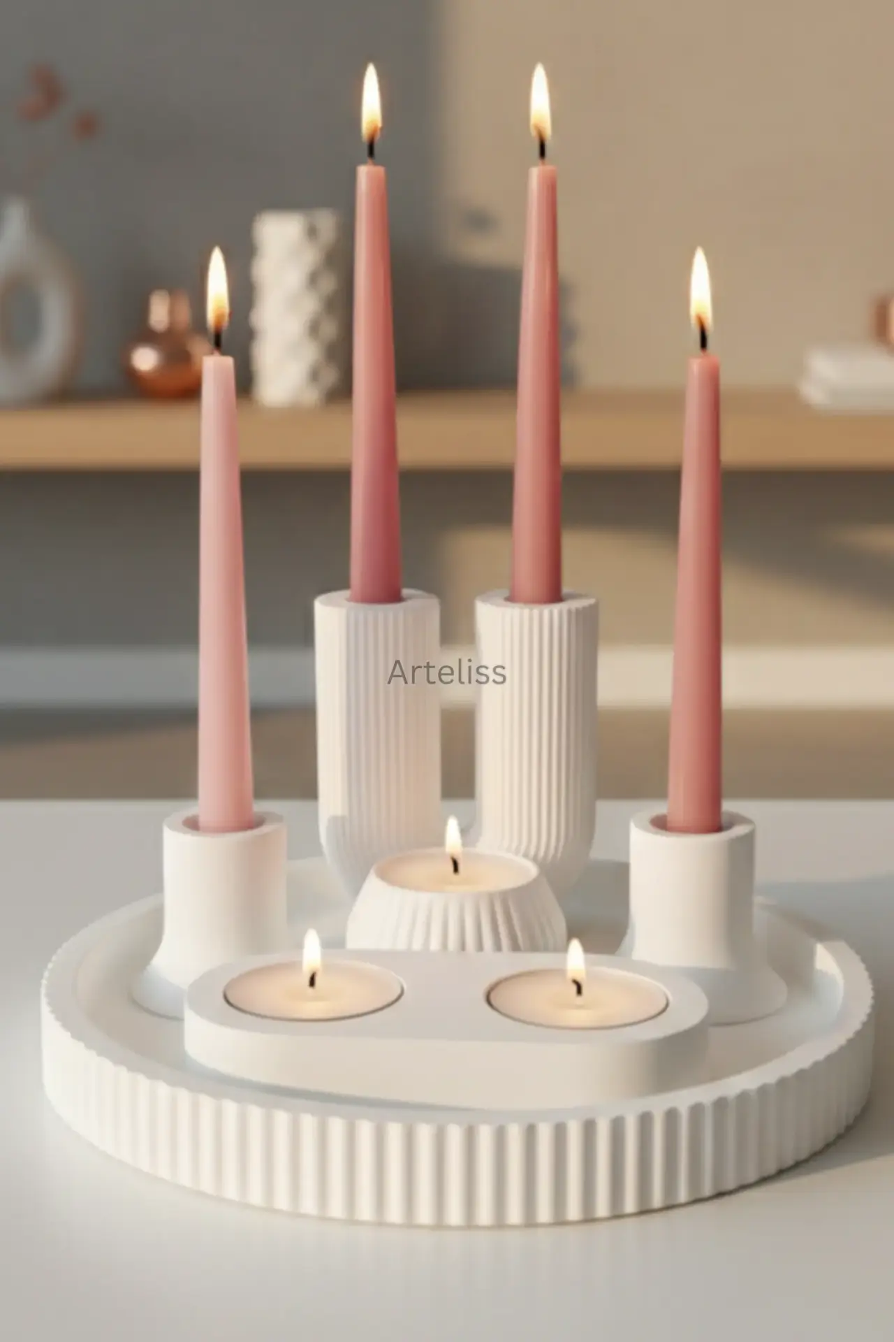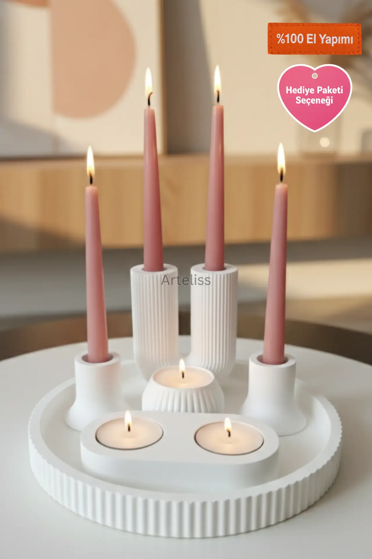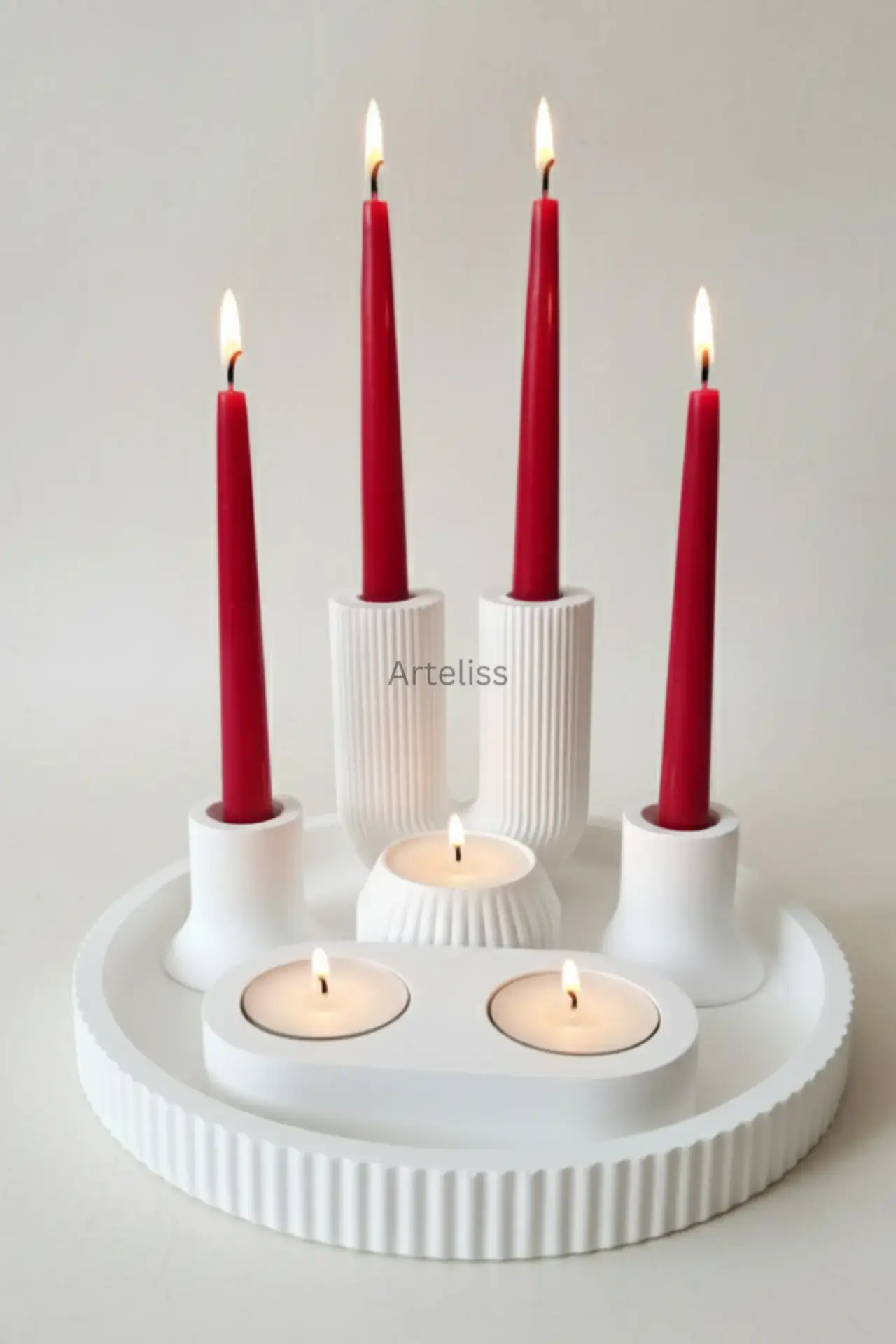 Arteliss® Modern Illumination serisi; çizgili U şamdan, mini şamdanlar ve farklı formlardaki tealight mumlukları geniş bir sunum tepsisi üzerinde birleştirerek kapsamlı bir aydınlatma çözümü sunar. Yemek masalarında veya geniş konsol yüzeylerinde katmanlı bir ışık etkisi yaratmak amacıyla tasarlanan bu 6 parçalı dekoratif mumluk seti, minimalist beyaz dokusuyla her türlü modern mekana asil bir atmosfer katar.