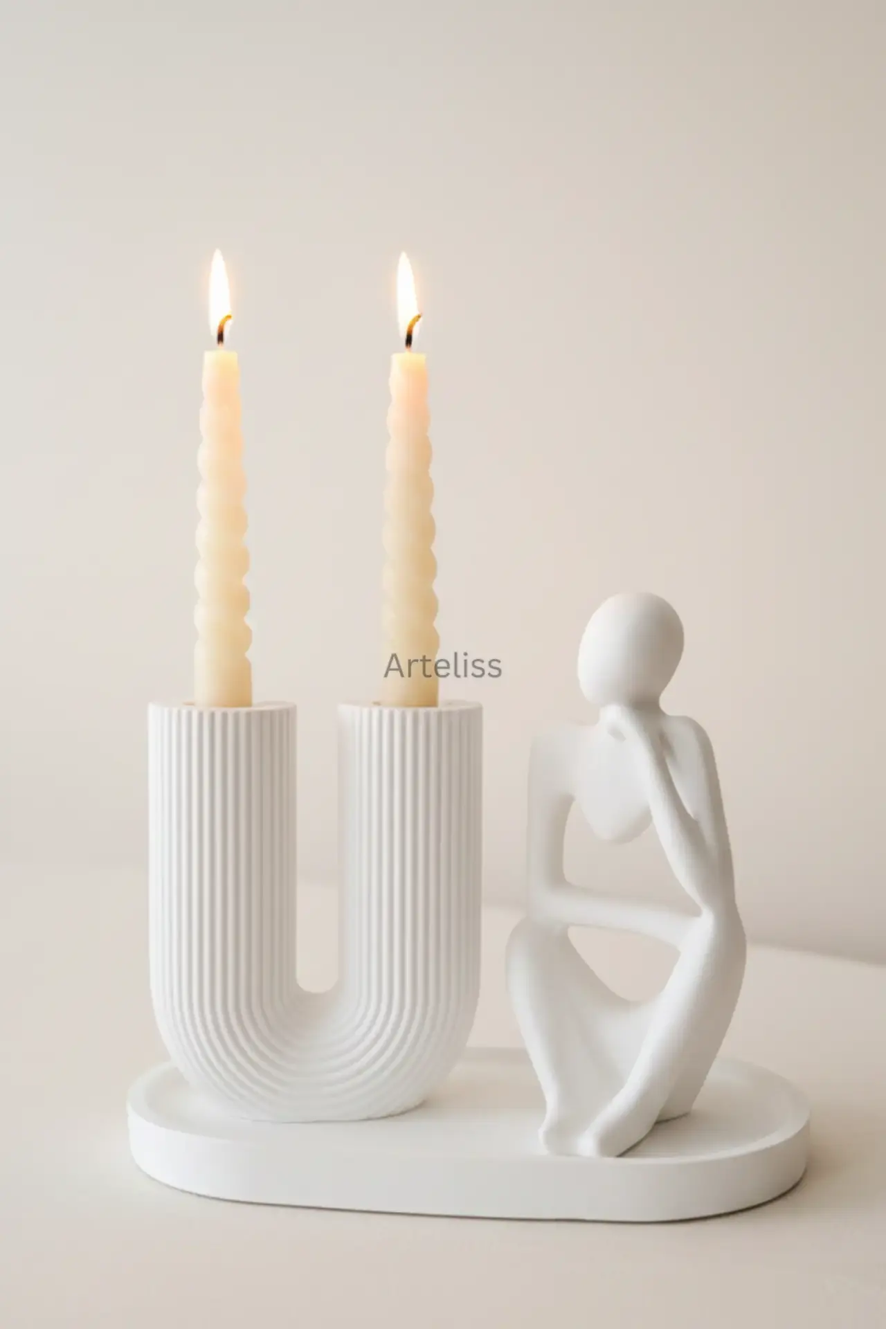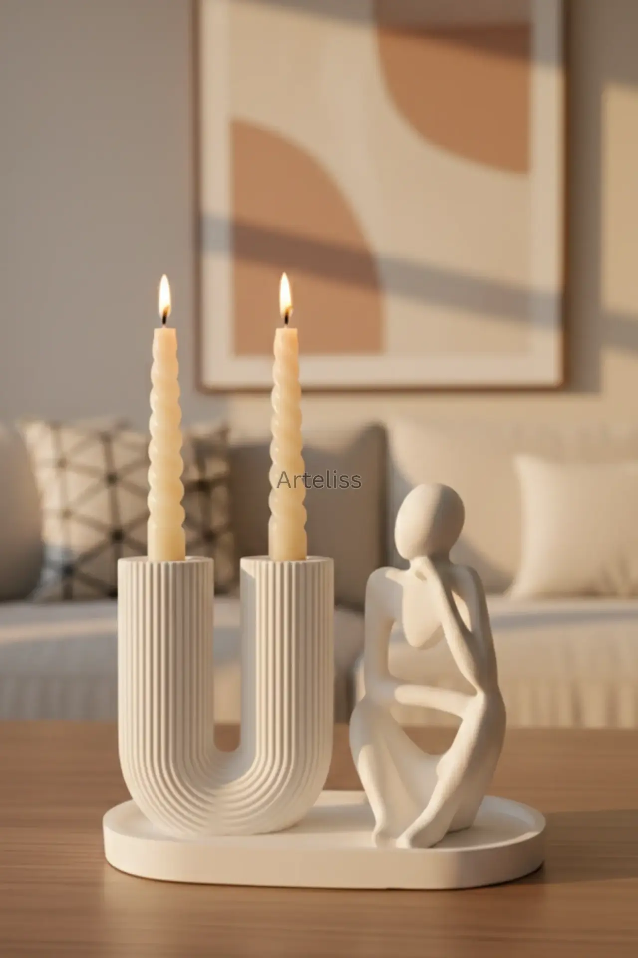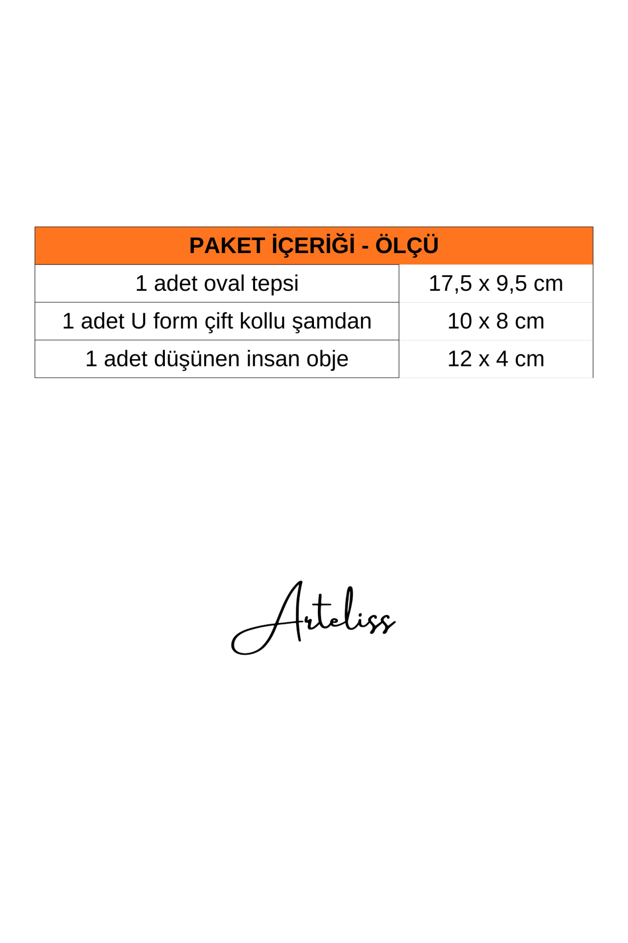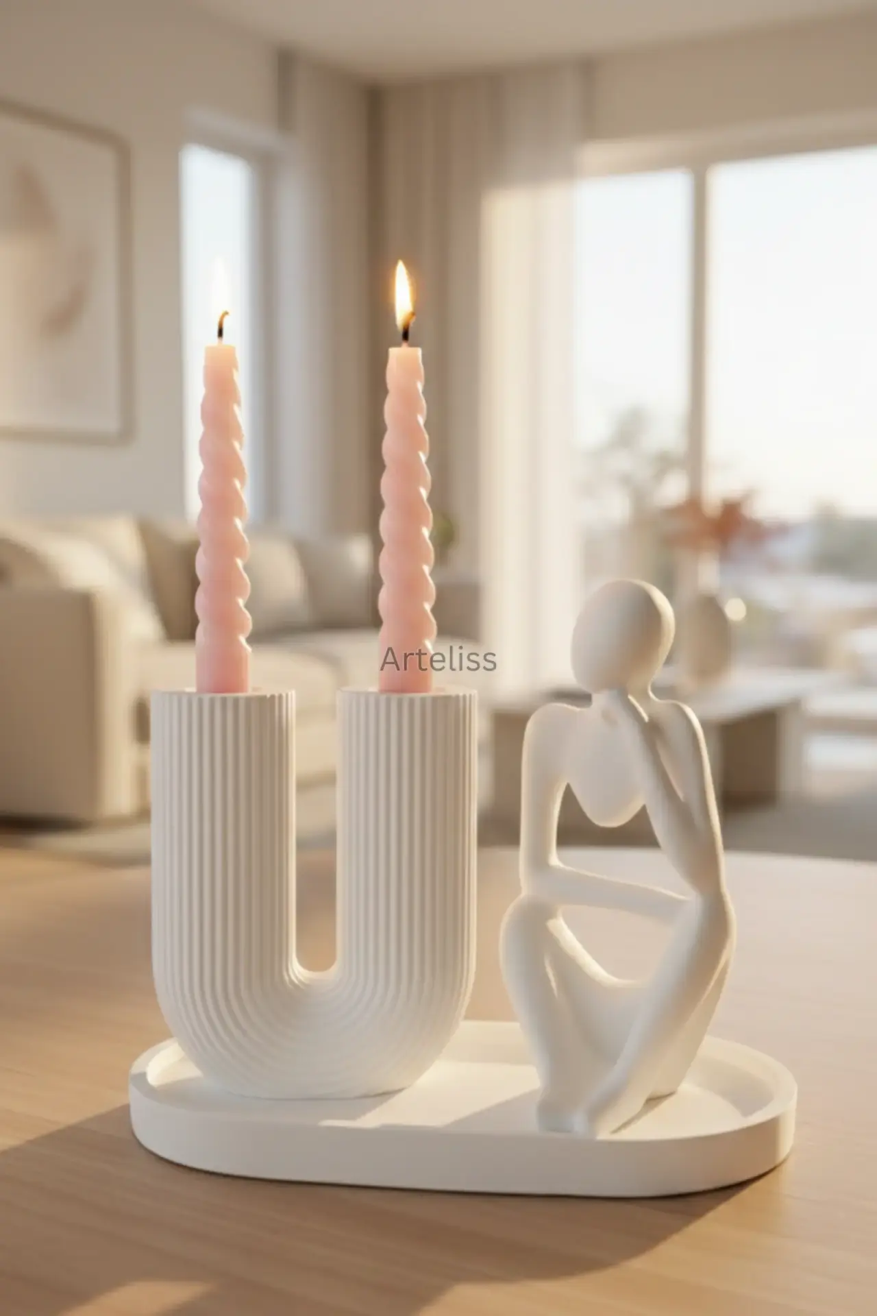 Arteliss® Modern Muse dekoratif set; dikey çizgili U formlu şamdanı ve düşünen insan figürünü oval bir sunum tablası üzerinde birleştirerek orta sehpa veya konsollarda sanatsal bir odak noktası oluşturur. Estetik ve fonksiyonelliği bir araya getiren bu minimalist ev dekoru şamdan obje seti, kütüphane rafları veya çalışma masaları için modern bir dekorasyon çözümü sağlar.