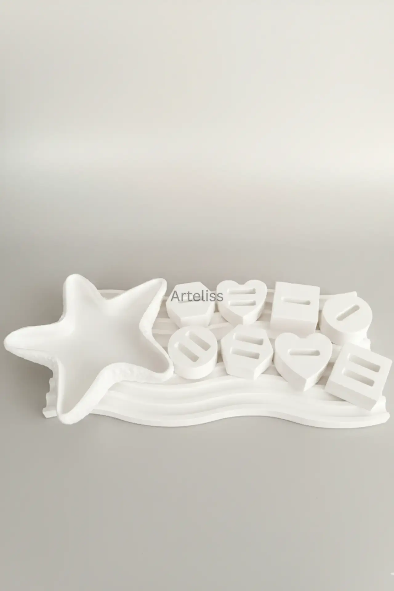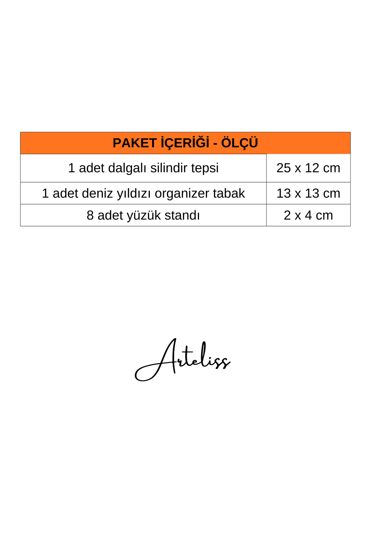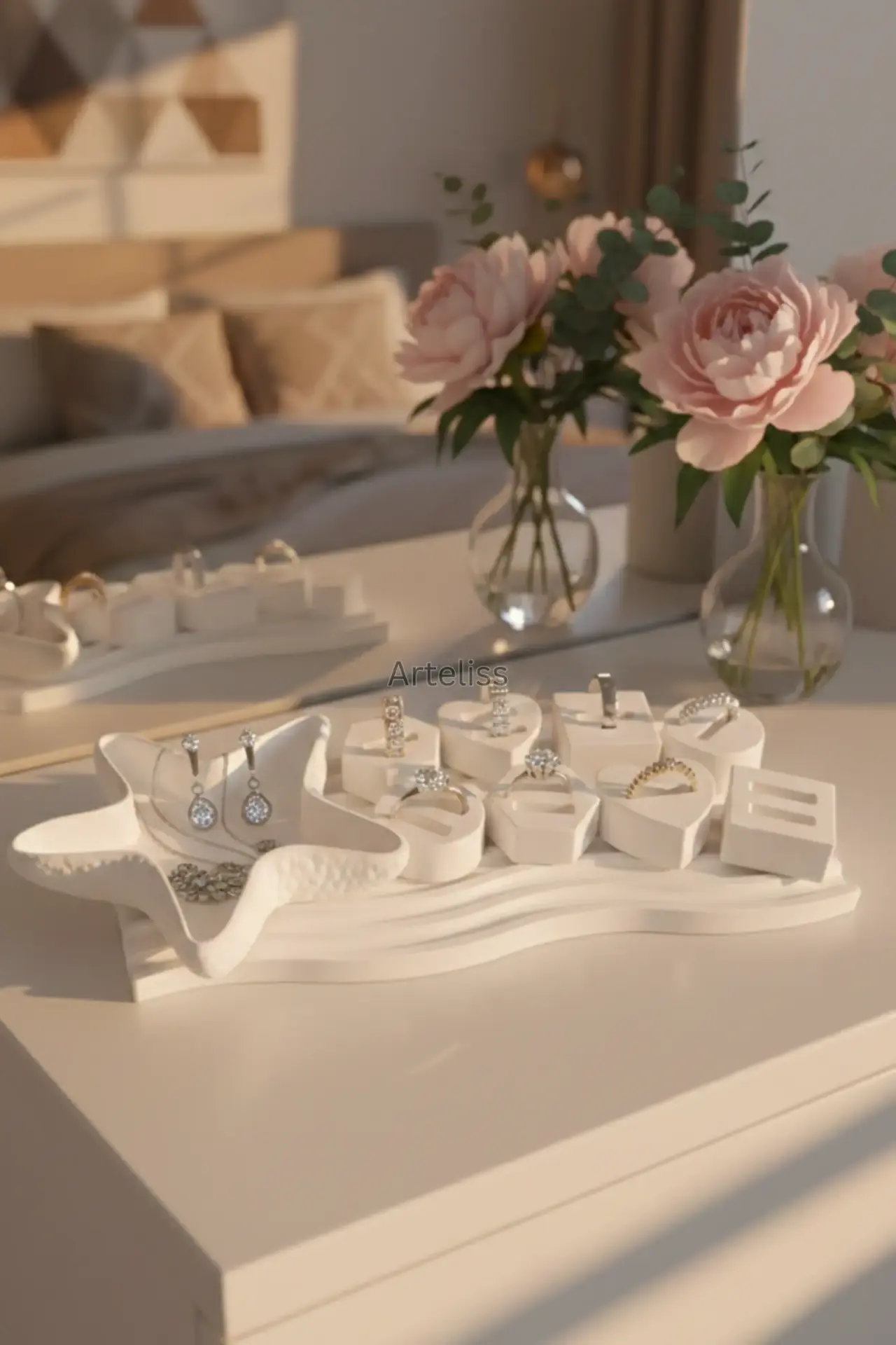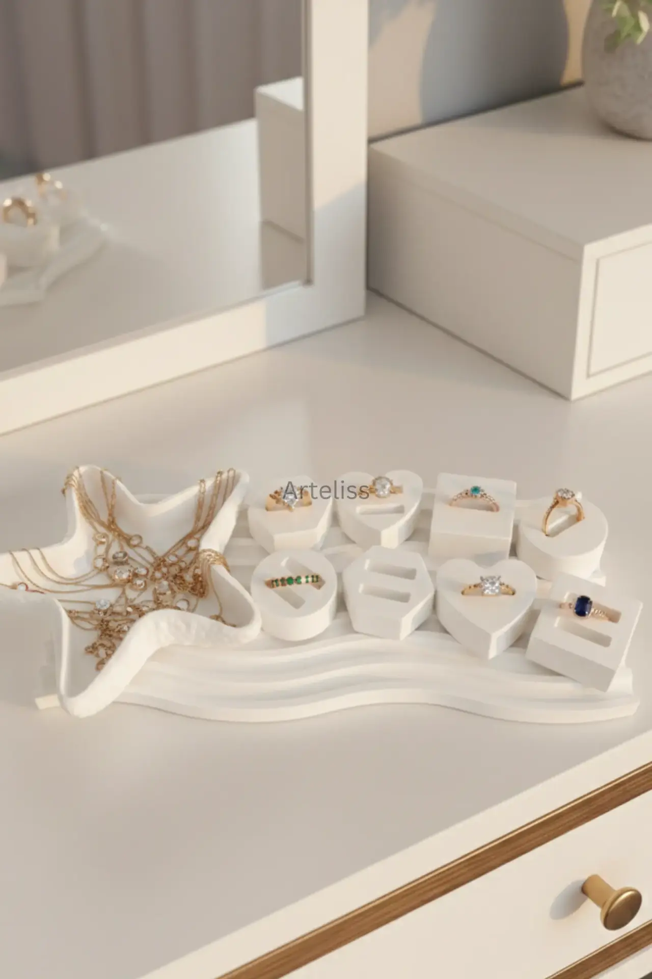 Arteliss® Ocean Star Lüks Yüzük Standı ve Organizer Seti; deniz yıldızı formundaki obje tabağı ve sekiz adet geometrik yüzük standıyla tüm takı koleksiyonunuzu bir arada tutan kapsamlı bir düzenleme çözümü sunar. Dalgalı sunum tepsisi üzerinde sergilenen kare, kalp, altıgen ve yuvarlak formlardaki parçalarıyla bu Lüks Yüzük Standı ve Organizer Seti, aksesuarlarınızı kategorize ederek makyaj masalarınızda estetik bir görünüm yaratır.