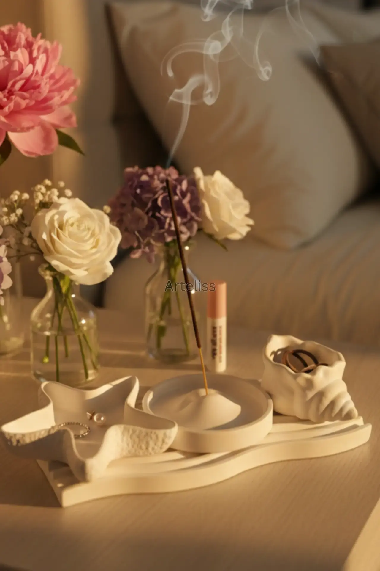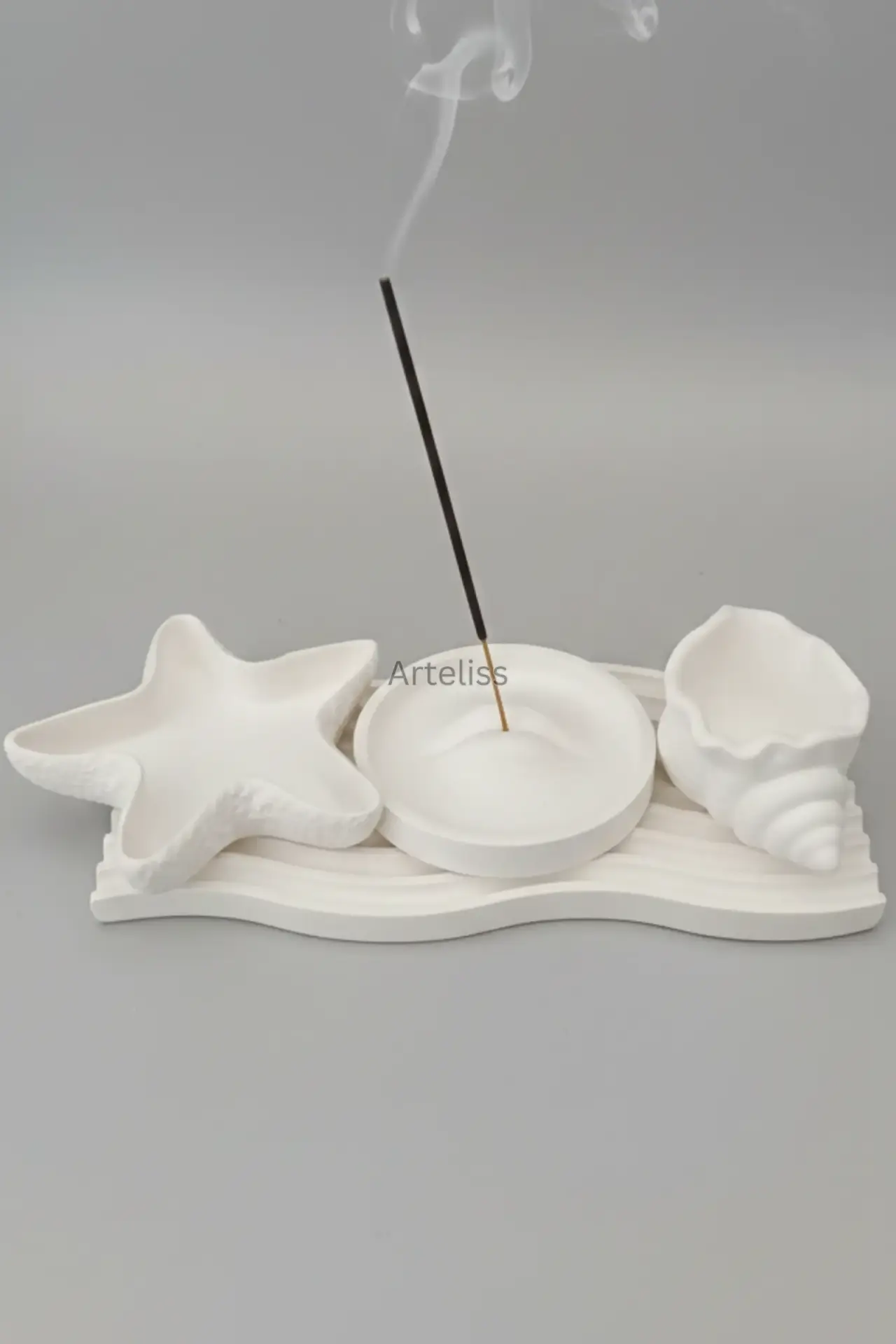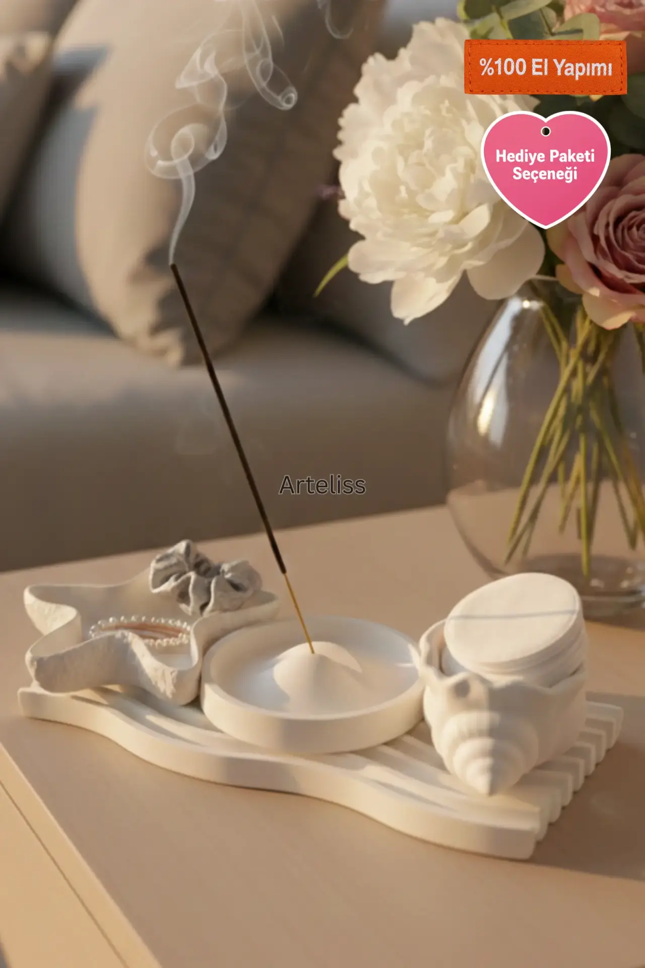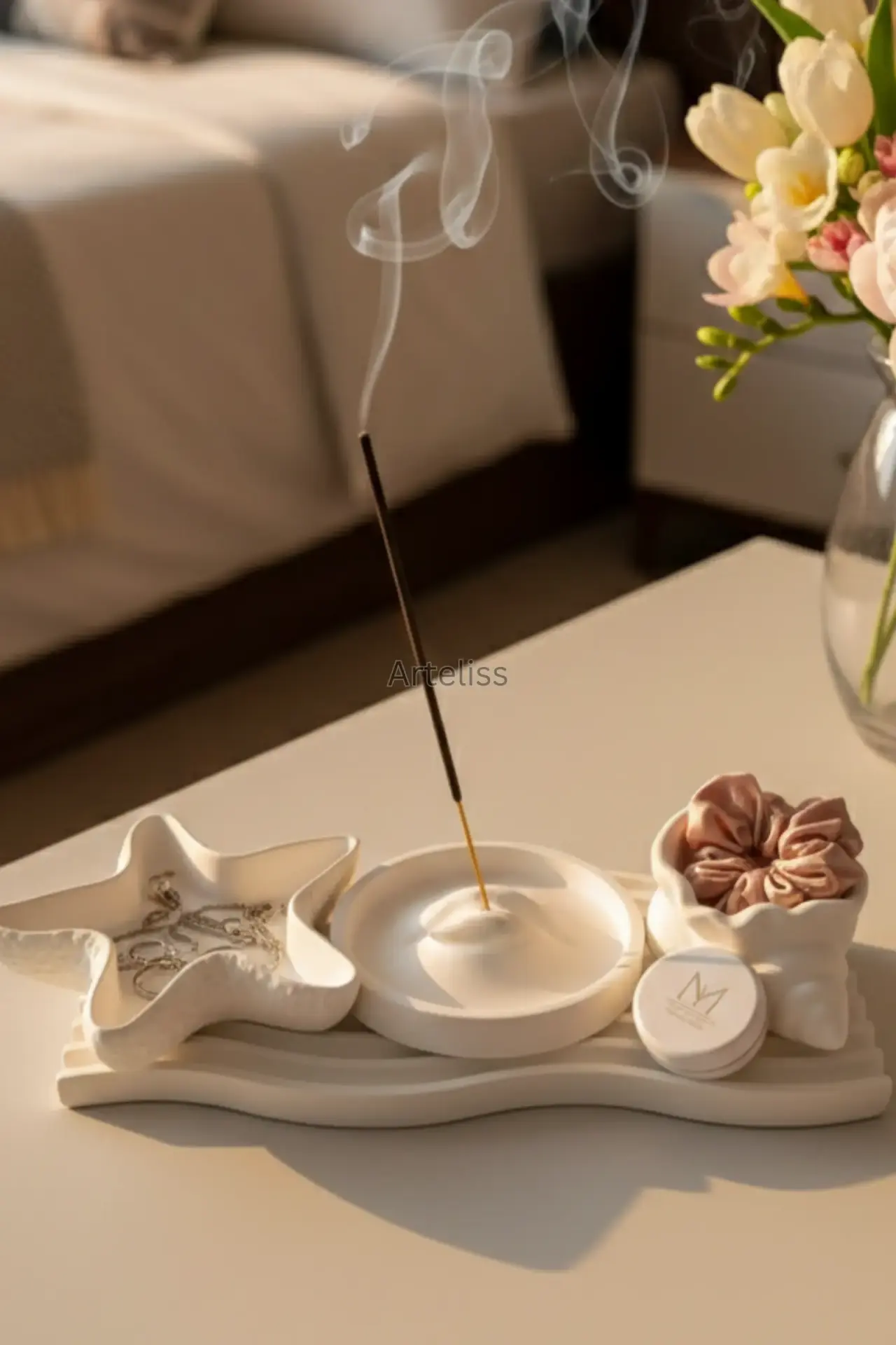 Arteliss® Oceanic Modern Ev Dekorasyon Seti; deniz yıldızı formundaki organizeri, estetik istiridye objesi ve özgün tütsülük tasarımıyla yaşam alanlarınıza ferah bir deniz teması taşır. Dalgalı sunum tepsisi üzerinde sergilenen bu parçalarla oluşturulan modern ev dekorasyon seti, takılarınız için şık bir düzenleyici veya meditasyon köşeleriniz için huzurlu bir alan sunar.