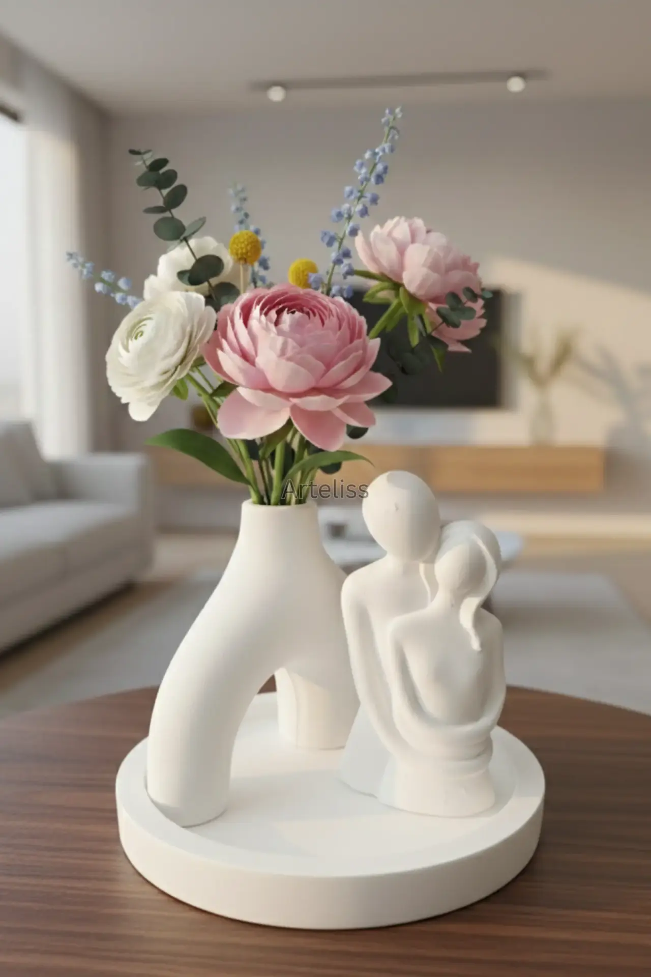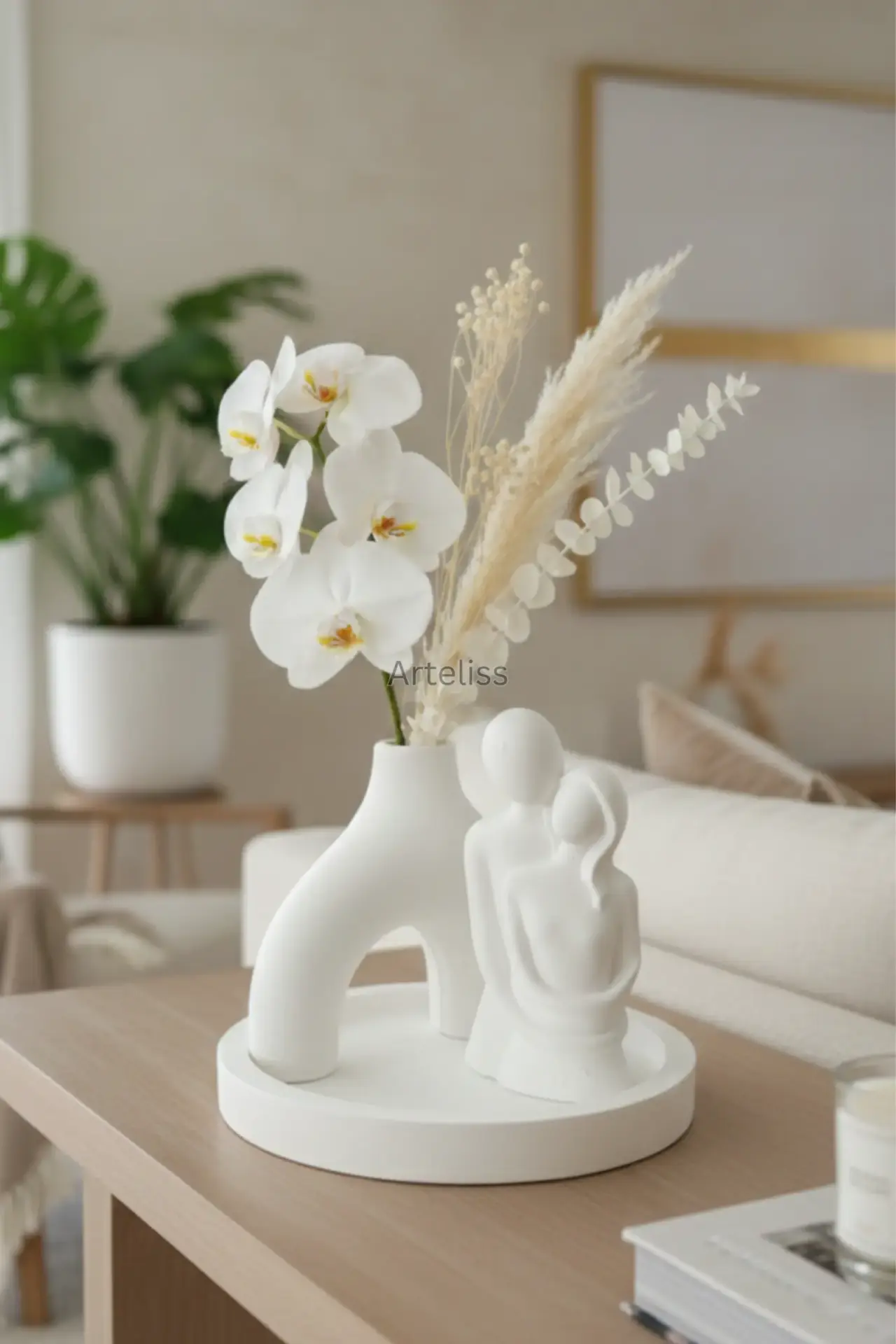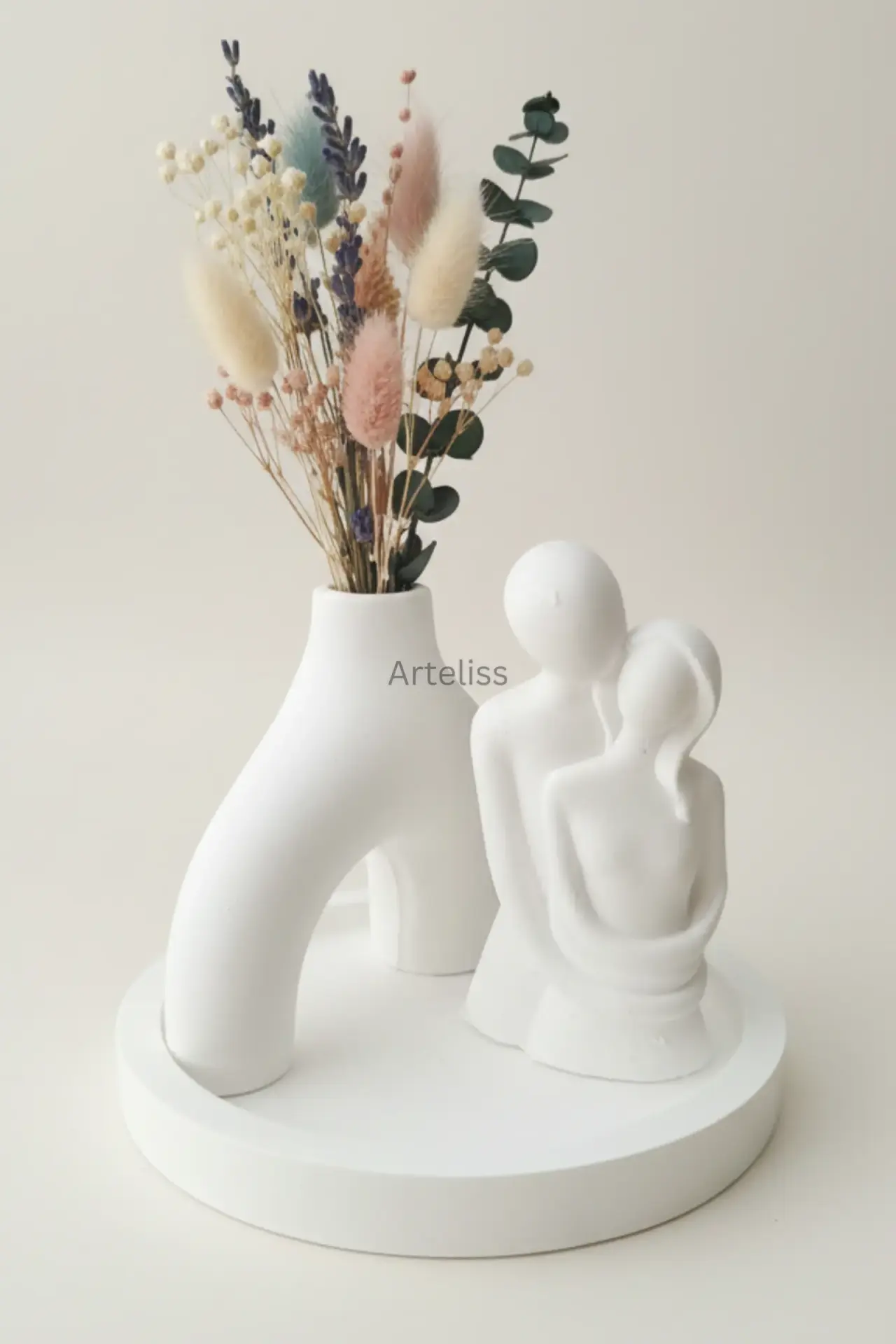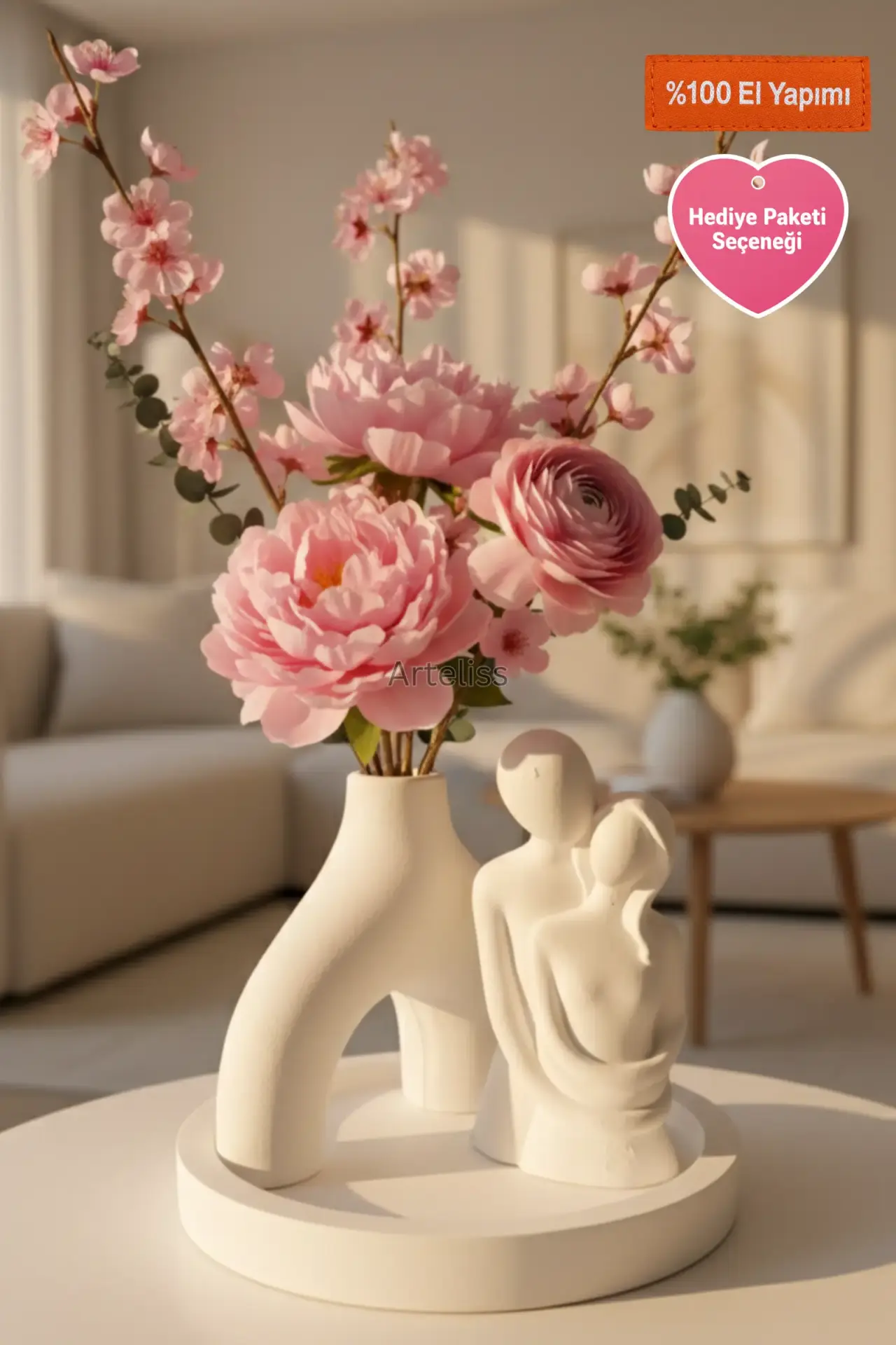 Arteliss® Pure Soul Romantik Ev Hediyesi set; heykelsi hatlara sahip Nordic kemer vazosu ve aşkın en saf halini simgeleyen sevgili figürüyle yaşam alanlarınızda dingin bir odak noktası oluşturur. Sevdiklerinize sunabileceğiniz en anlamlı romantik ev hediyesi seçeneklerinden biri olan bu tasarım; dairesel bir sunum tepsisi üzerinde sergilenerek dresuar, komodin veya çalışma masaları üzerinde modern bir ambiyans yaratır.