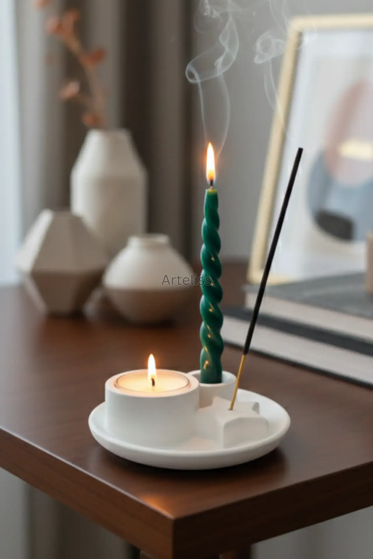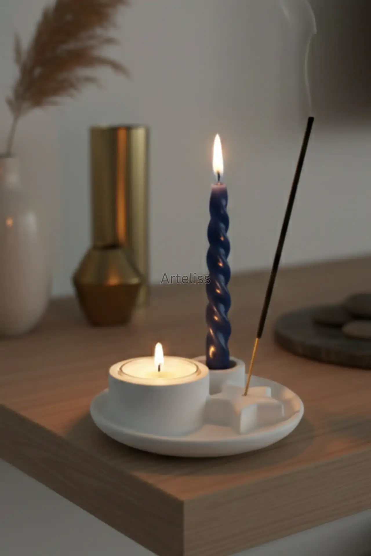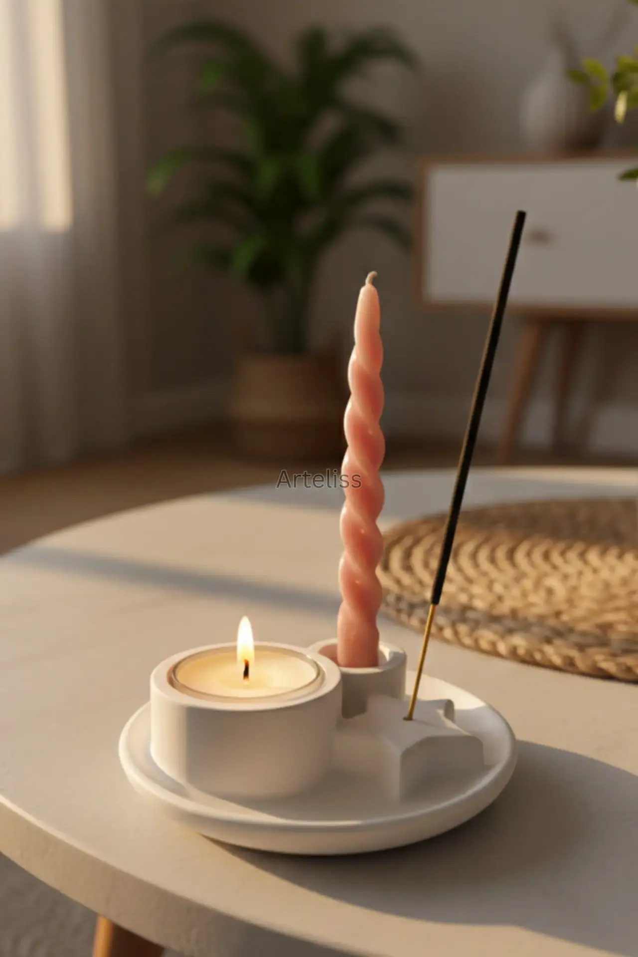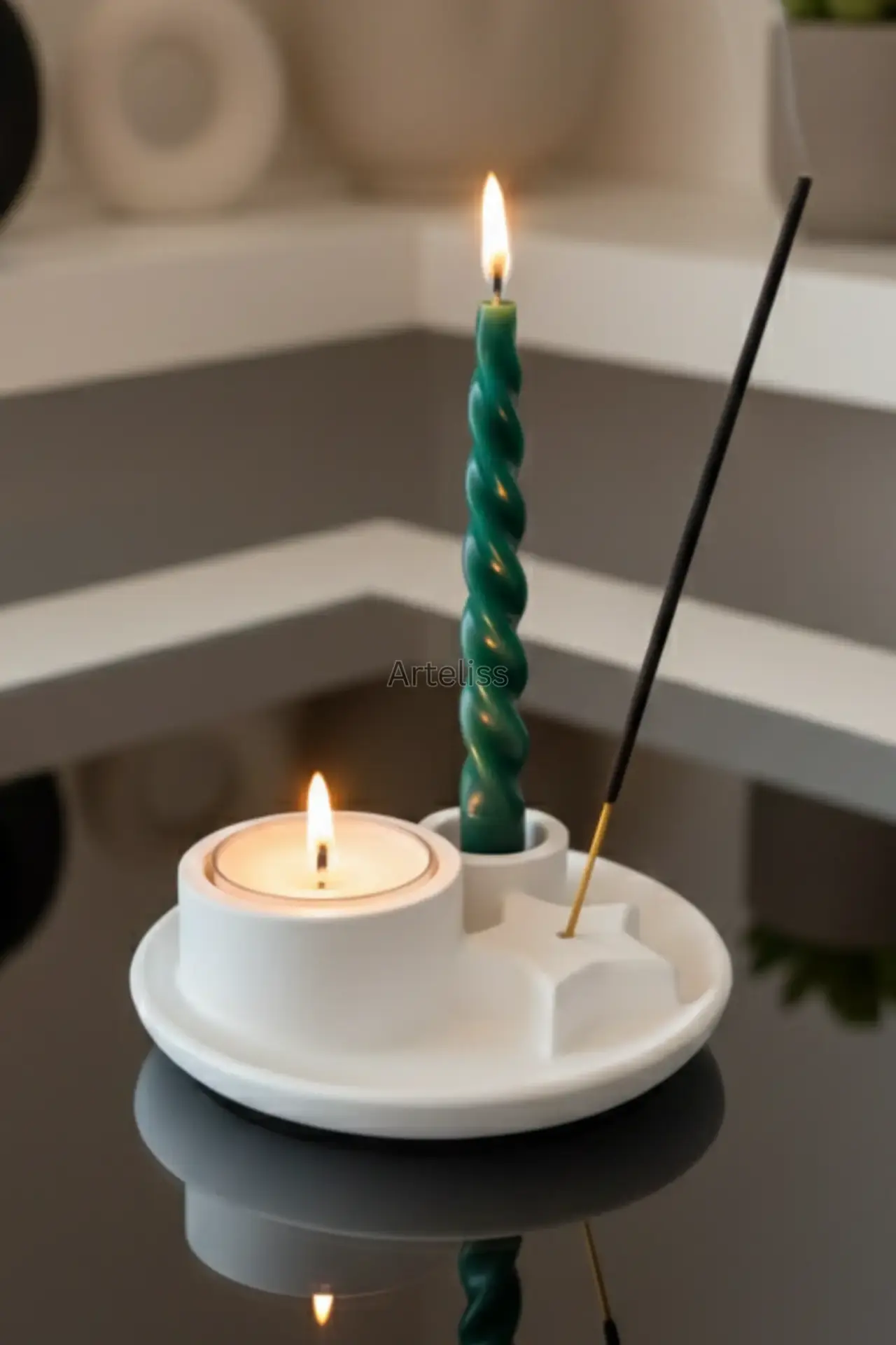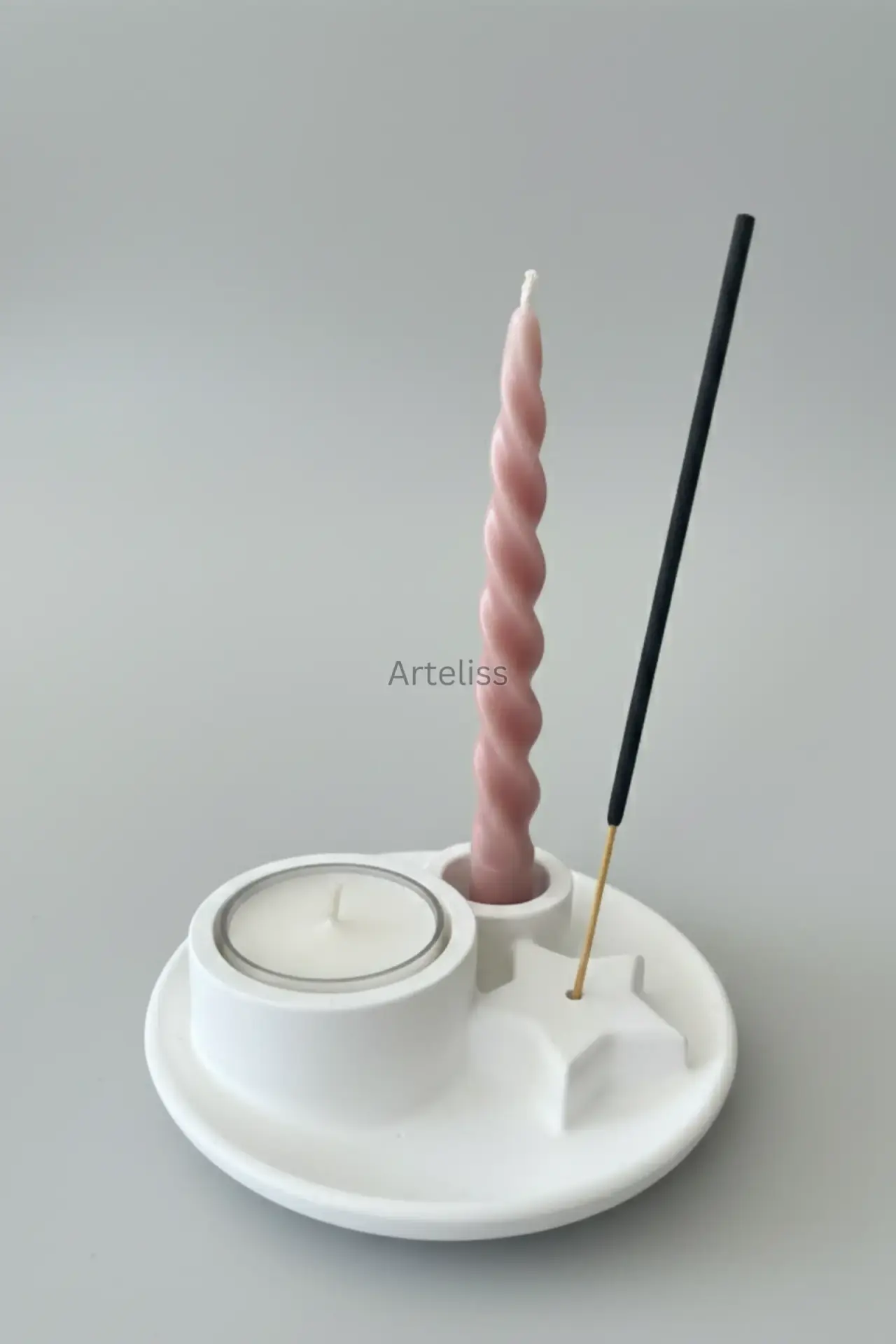 Arteliss® Ritual Star Tütsülük Şamdan Mumluk, şamdan mumluğu, tealight haznesi ve yıldız formundaki tütsü tutucuyu tek bir dairesel tablada birleştiren çok yönlü bir tasarımdır. Bu hepsi bir arada tütsülük şamdan mumluk standı, ritüel alanlarınız ve meditasyon köşeleriniz için kompakt ve estetik bir çözüm sunarak mekanın enerjisini değiştirir.