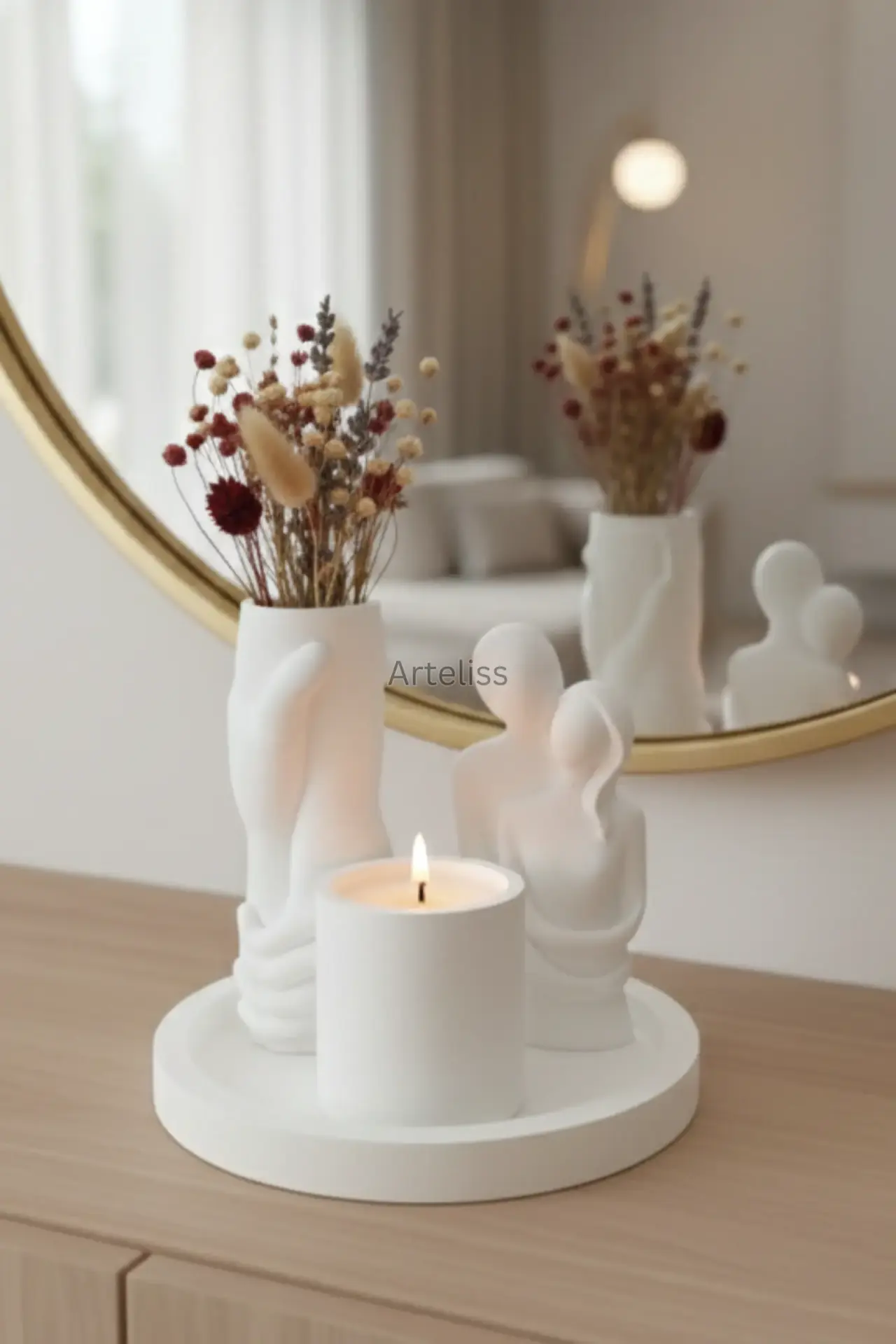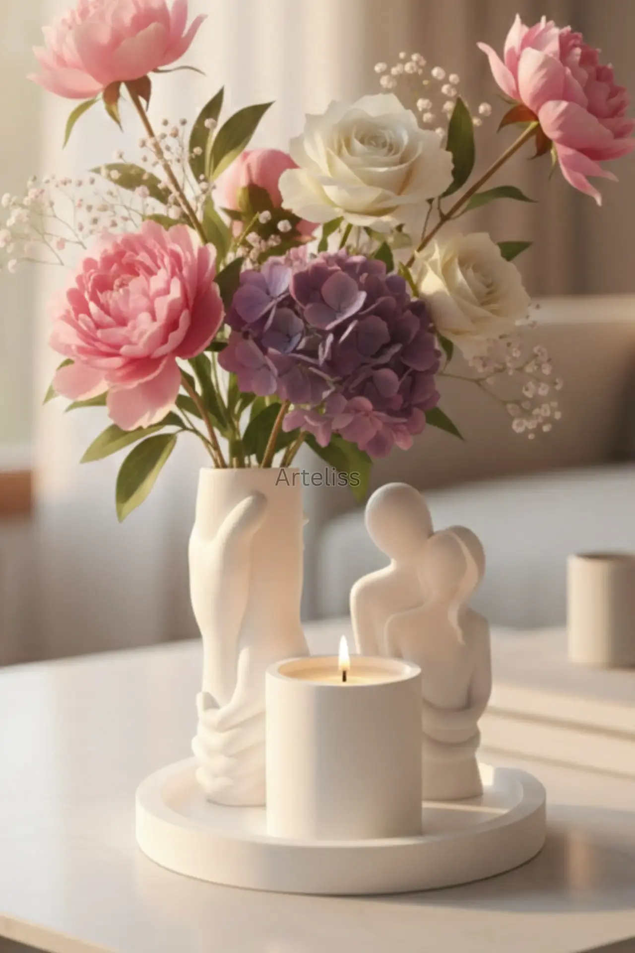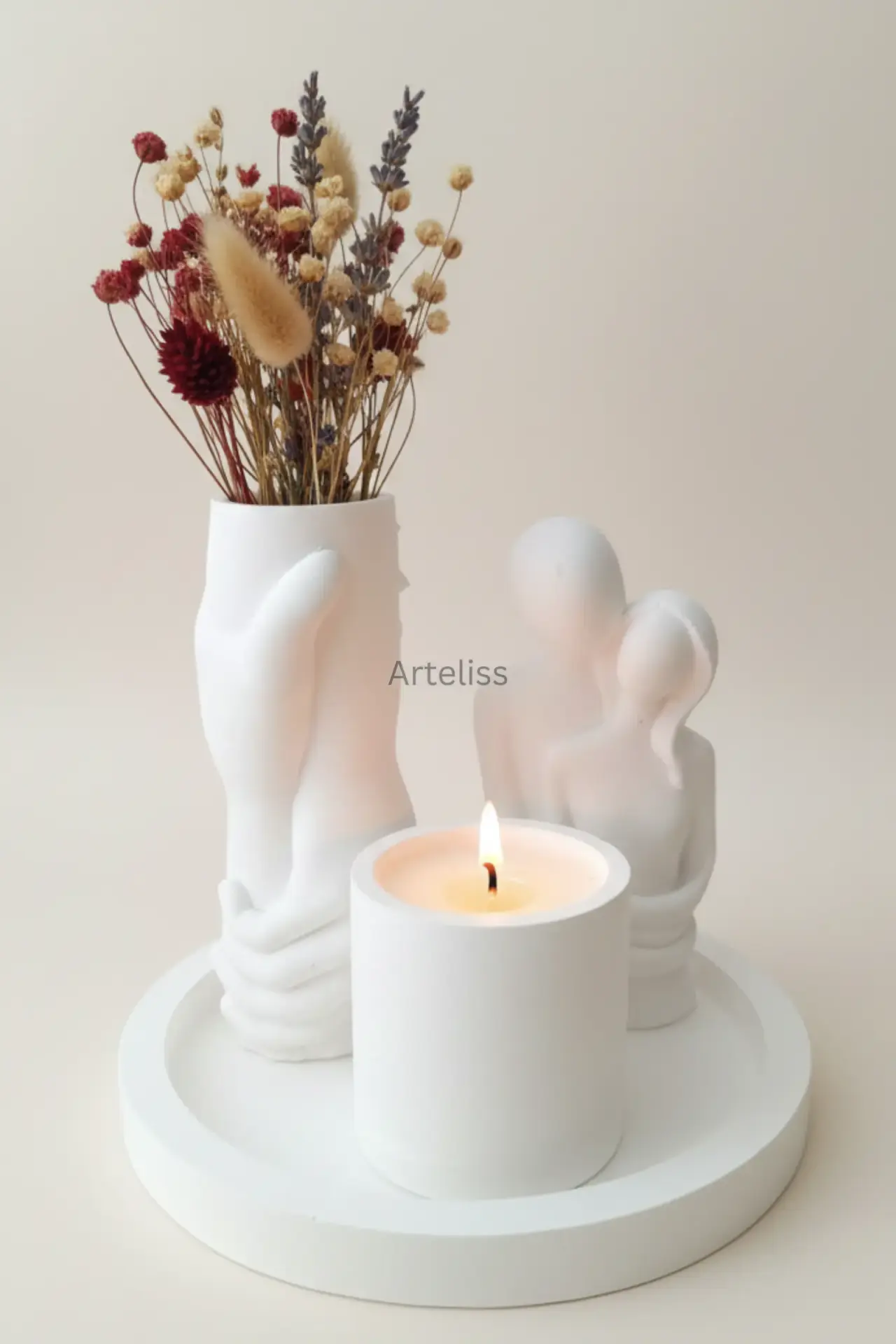 Arteliss® Serene Touch Sevgiliye Özel Hediye set; zarafeti ve duygusal derinliği bir araya getirerek yaşam alanlarınızda dingin bir köşe yaratır. Estetik bir sevgiliye özel hediye arayanlar için tasarlanan bu setin odak noktası olan el formundaki vazo, doğallığı ve şefkati simgelerken; sarılan sevgili figürü bu romantik atmosferi tamamlar.