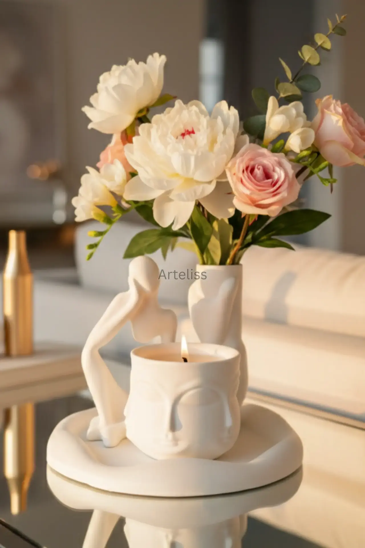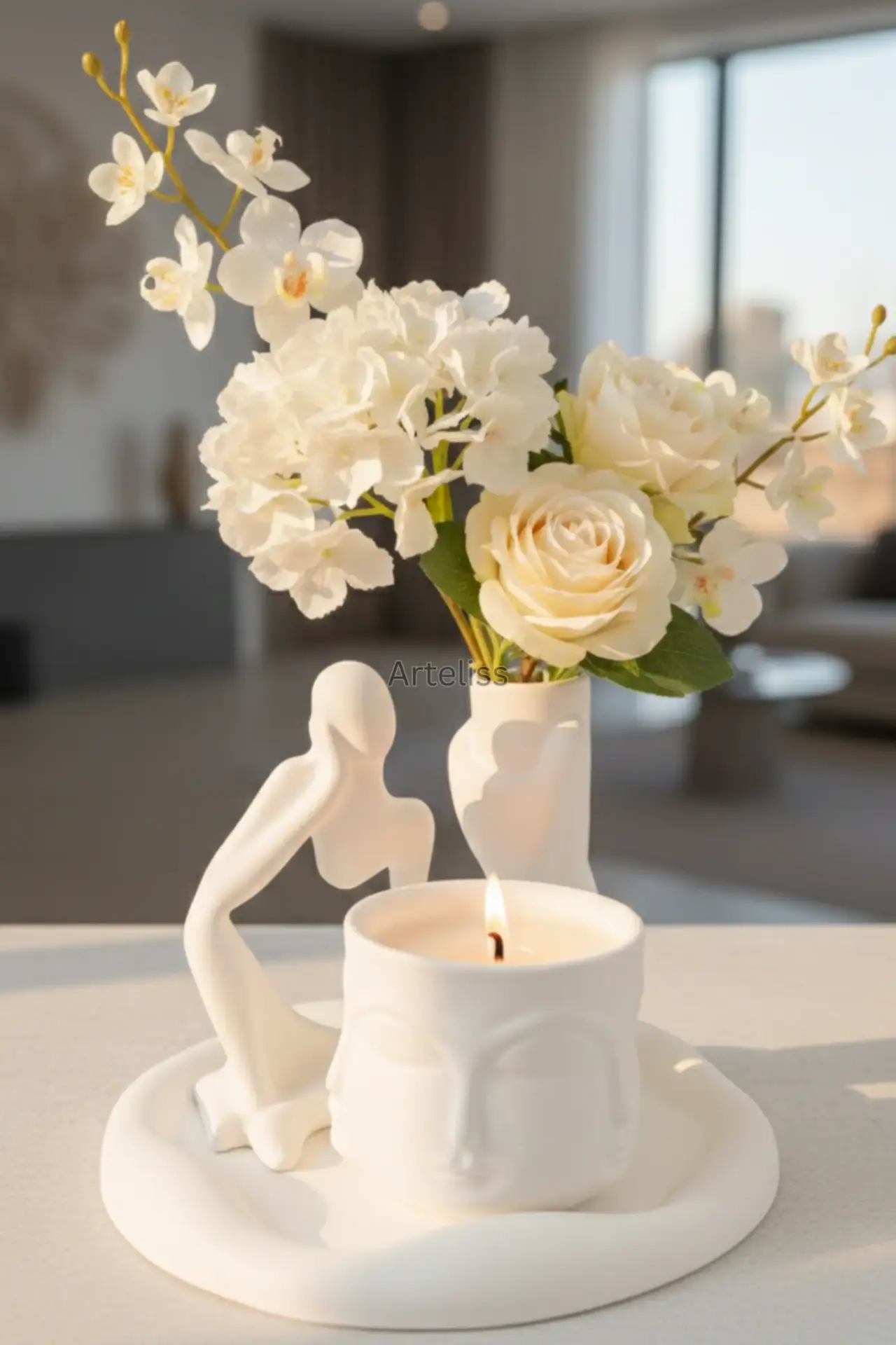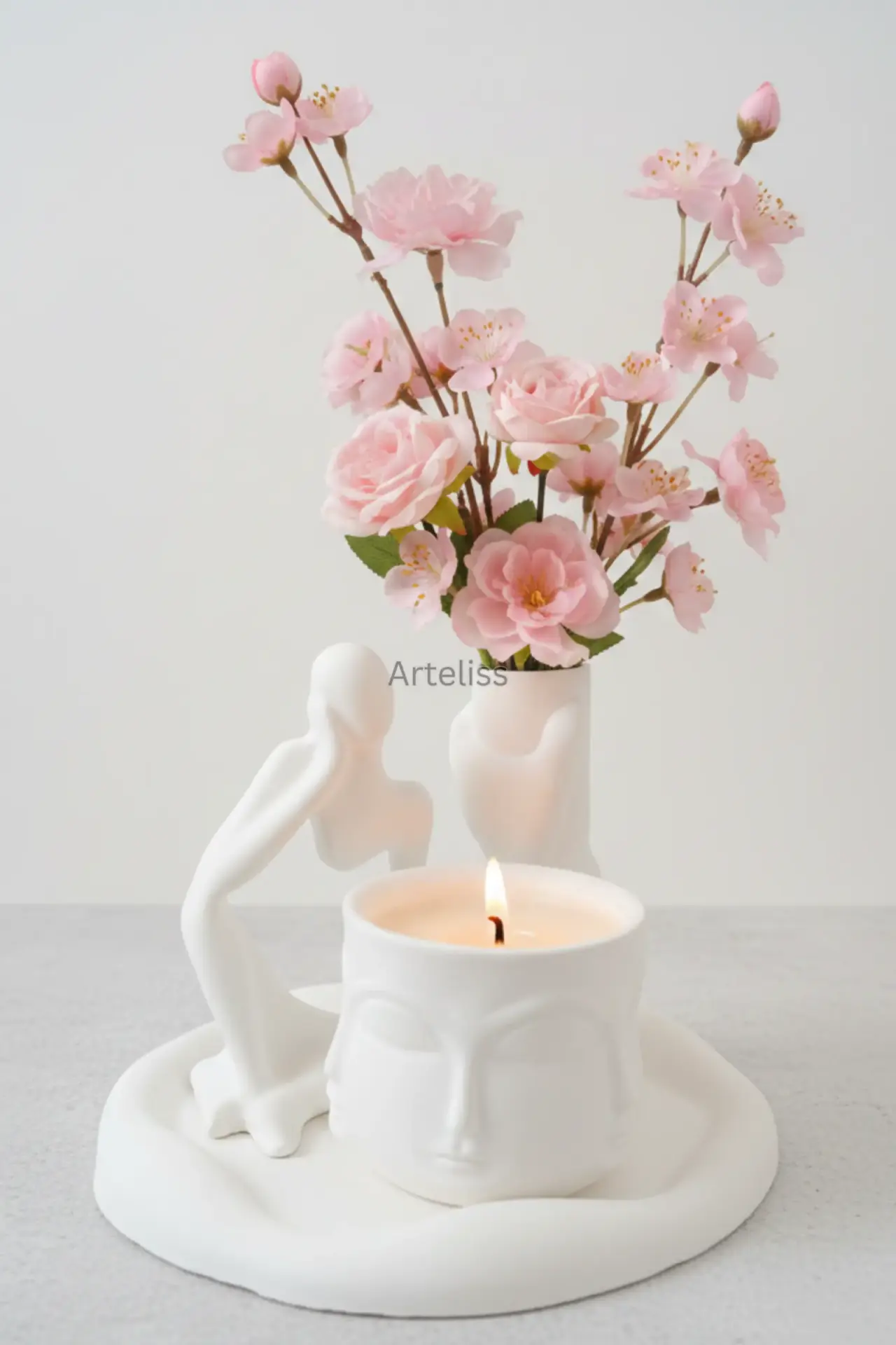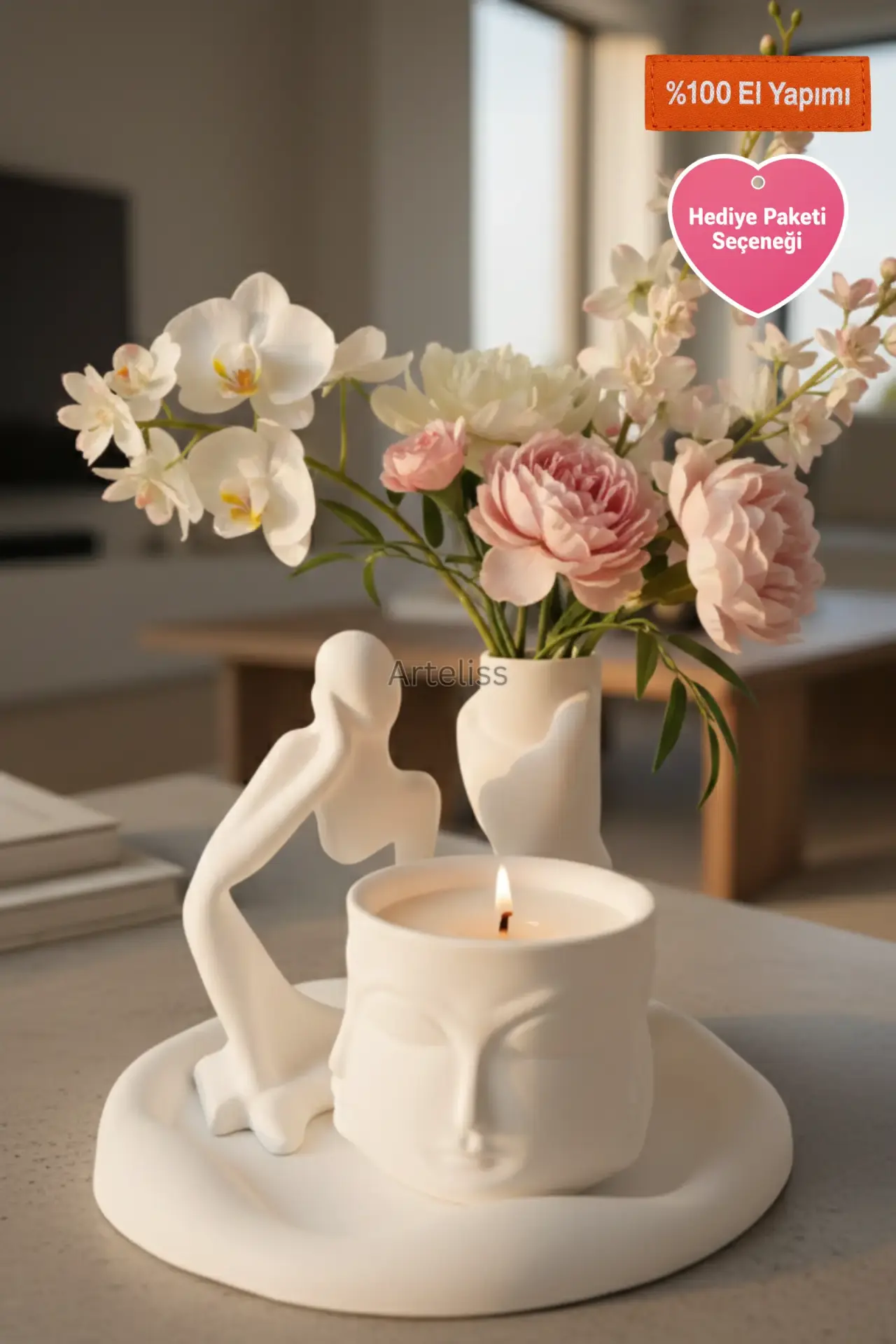 Arteliss® Serenity Modern Ev Dekorasyon Seti, modern estetiği spiritüel bir dinginlikle harmanlıyor. Gardenya kokulu Buddha mum, el formlu vazo, düşünen insan objesi ve bohem sunum tablasından oluşan bu modern ev dekorasyon seti, evinizde huzurlu bir odak noktası yaratmak için tasarlandı.