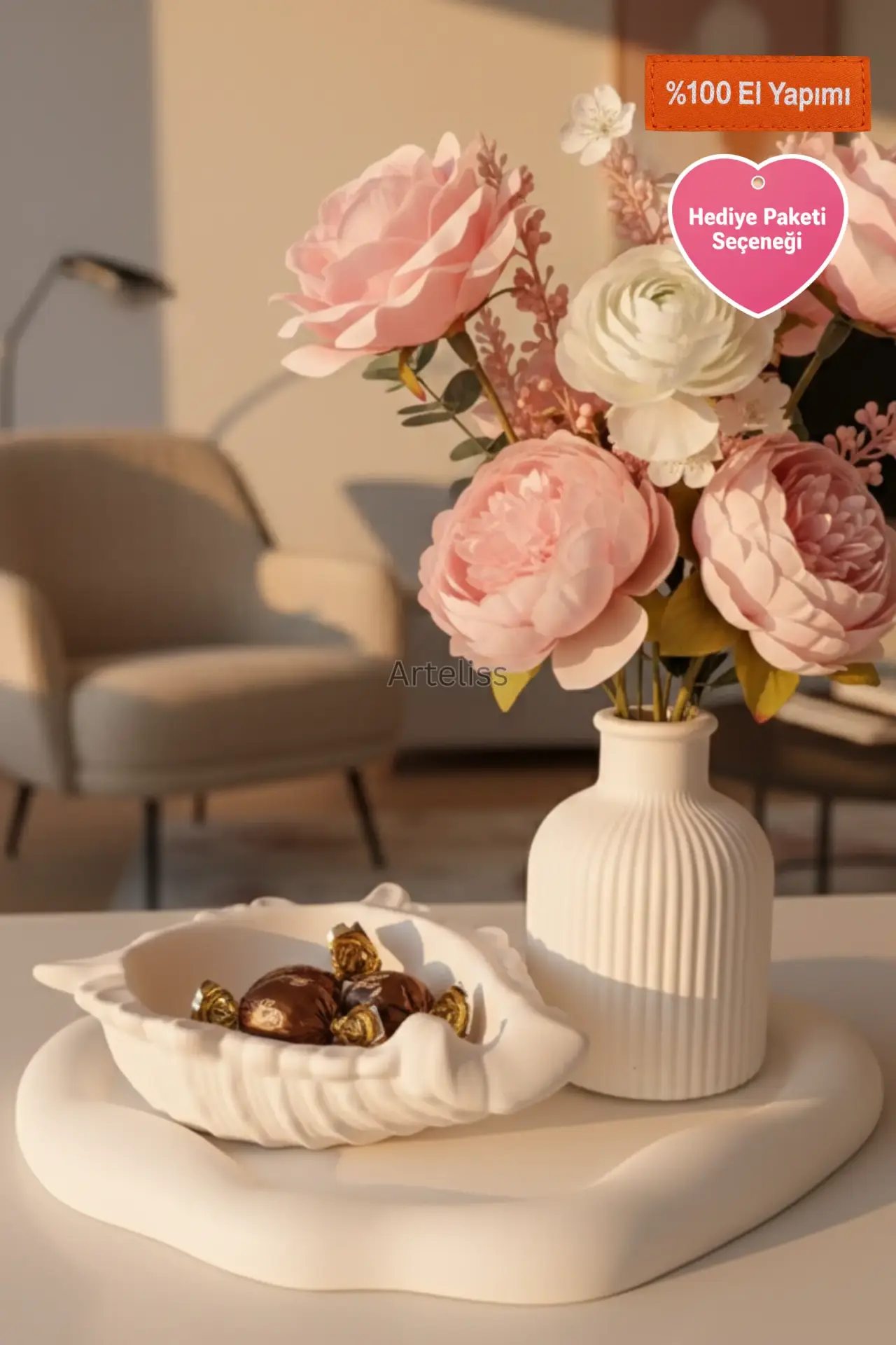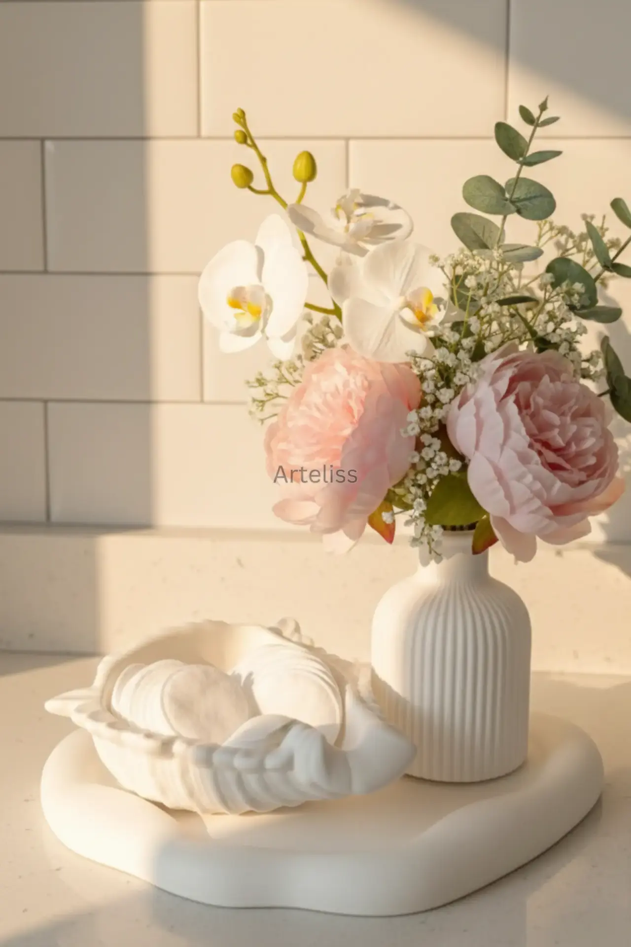 Arteliss® Shell Harmony Coastal Ev Dekorasyonu set; doğanın organik formlarını minimalist bir tasarımla yaşam alanlarınıza taşır. Ferah bir coastal ev dekorasyonu stili arayanlar için hazırlanan bu koleksiyon; dikey dokulu silindir vazo, istiridye formlu obje ve amorf yapılı sunum tepsisinden oluşur. Parçaların dalgalı bir form üzerinde birleşmesi, evinize modern ve huzurlu bir sahil esintisi katar.
