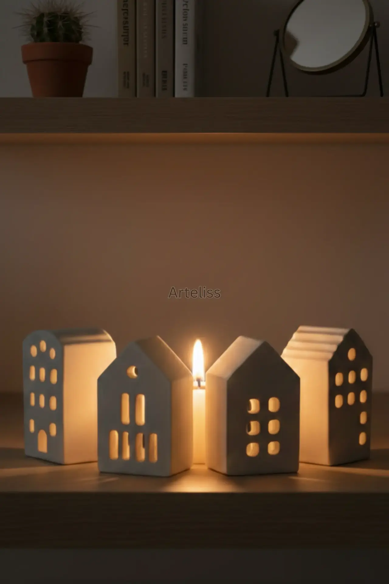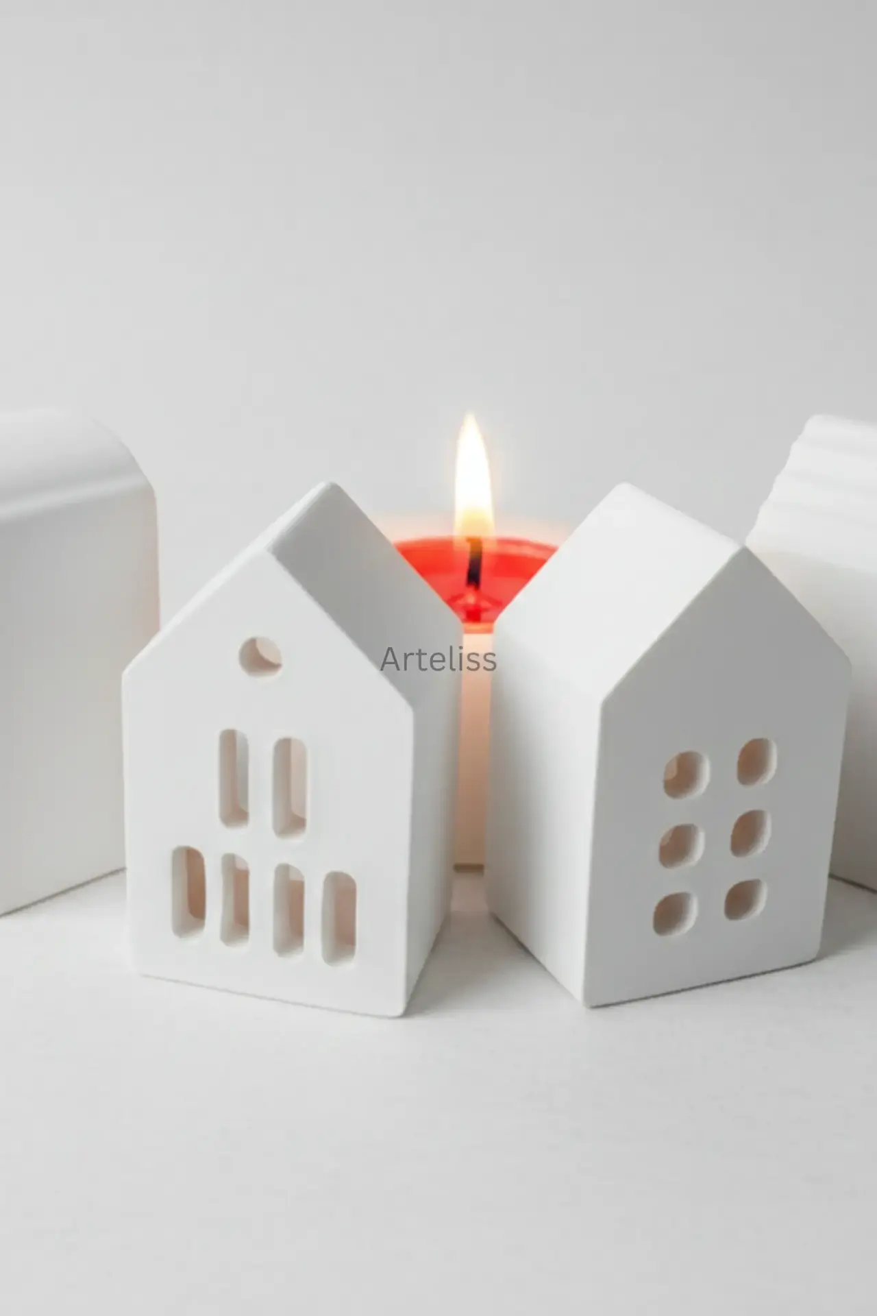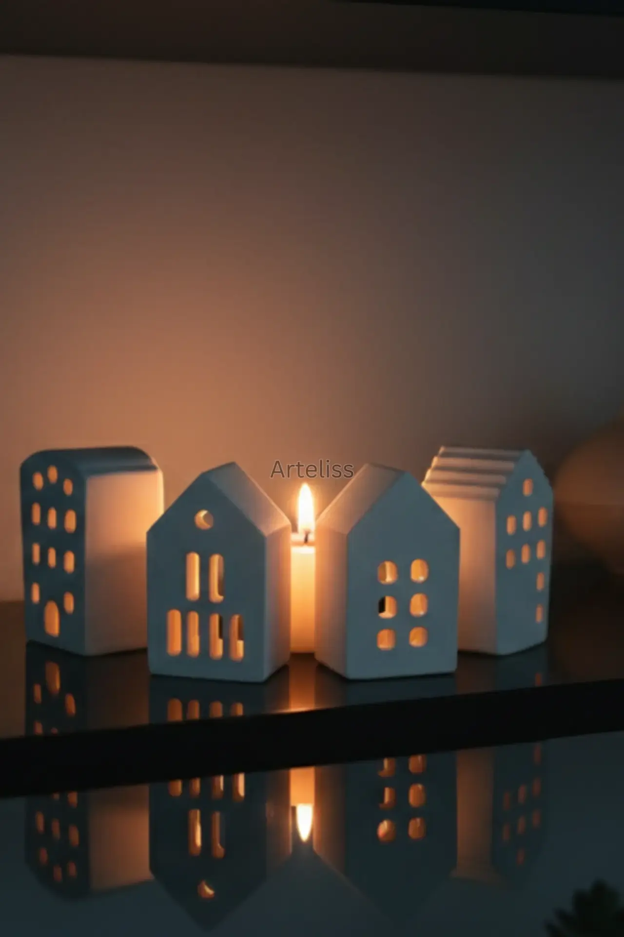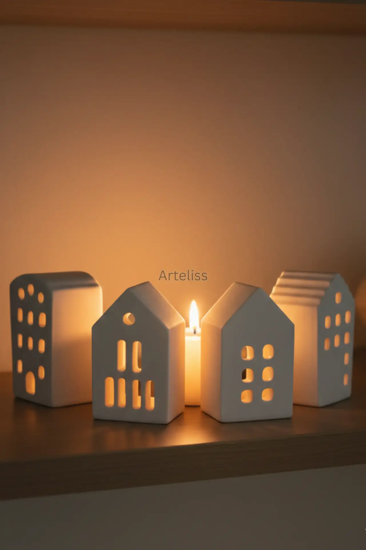 Arteliss® Silent Night Dekoratif Mumluk Seti, minimalizmin huzur veren etkisini dört farklı mimari tasarıma sahip ışık eviyle yaşam alanlarınıza taşır. Evinizde masalsı bir köy ambiyansı yaratmak için tasarlanan bu dekoratif mumluk seti, her bir evin pencere detaylarından süzülen yumuşak ışıkla akşamlarınıza dinginlik katar.