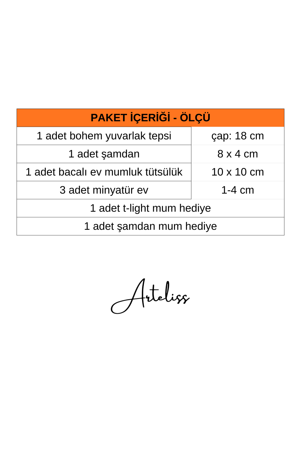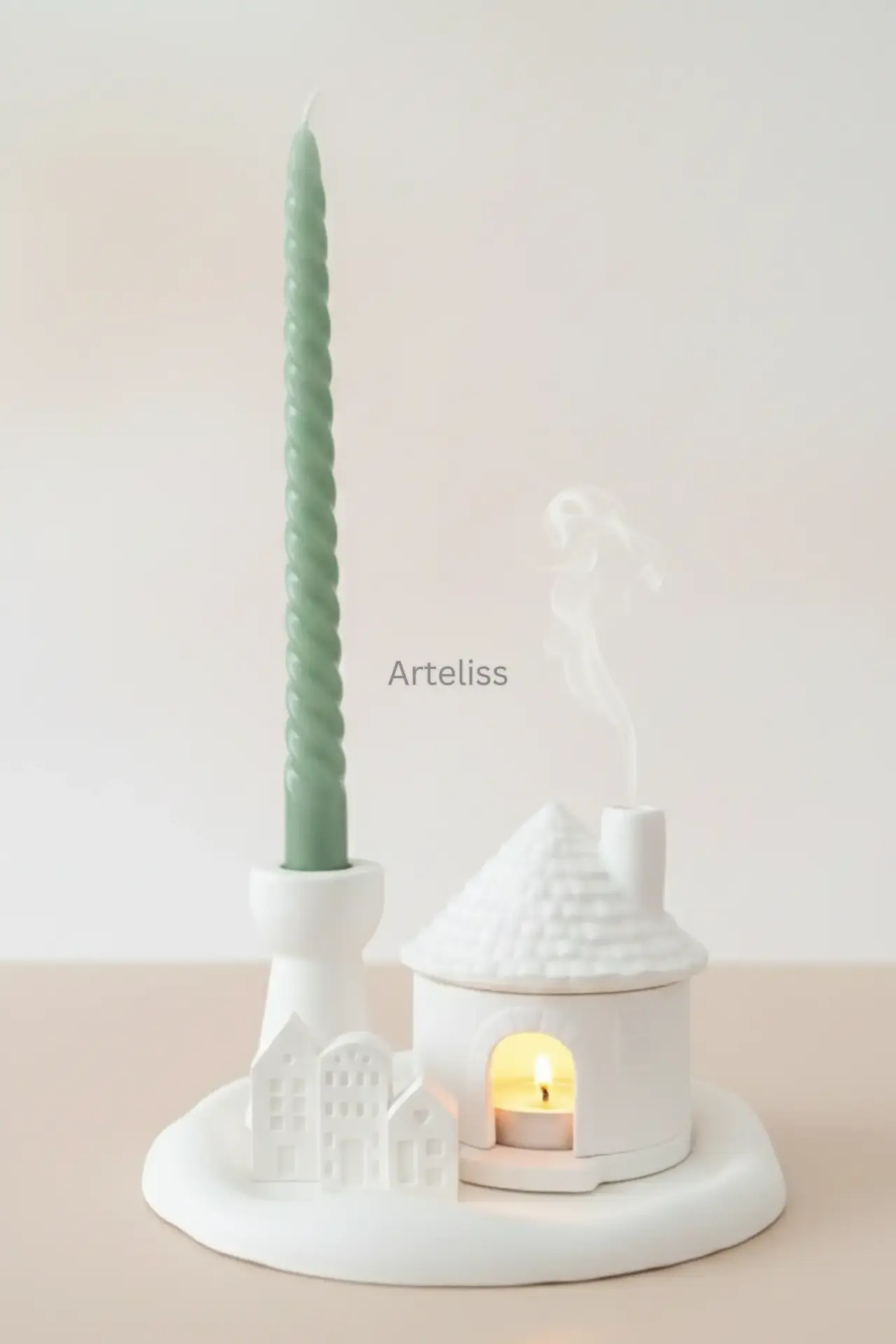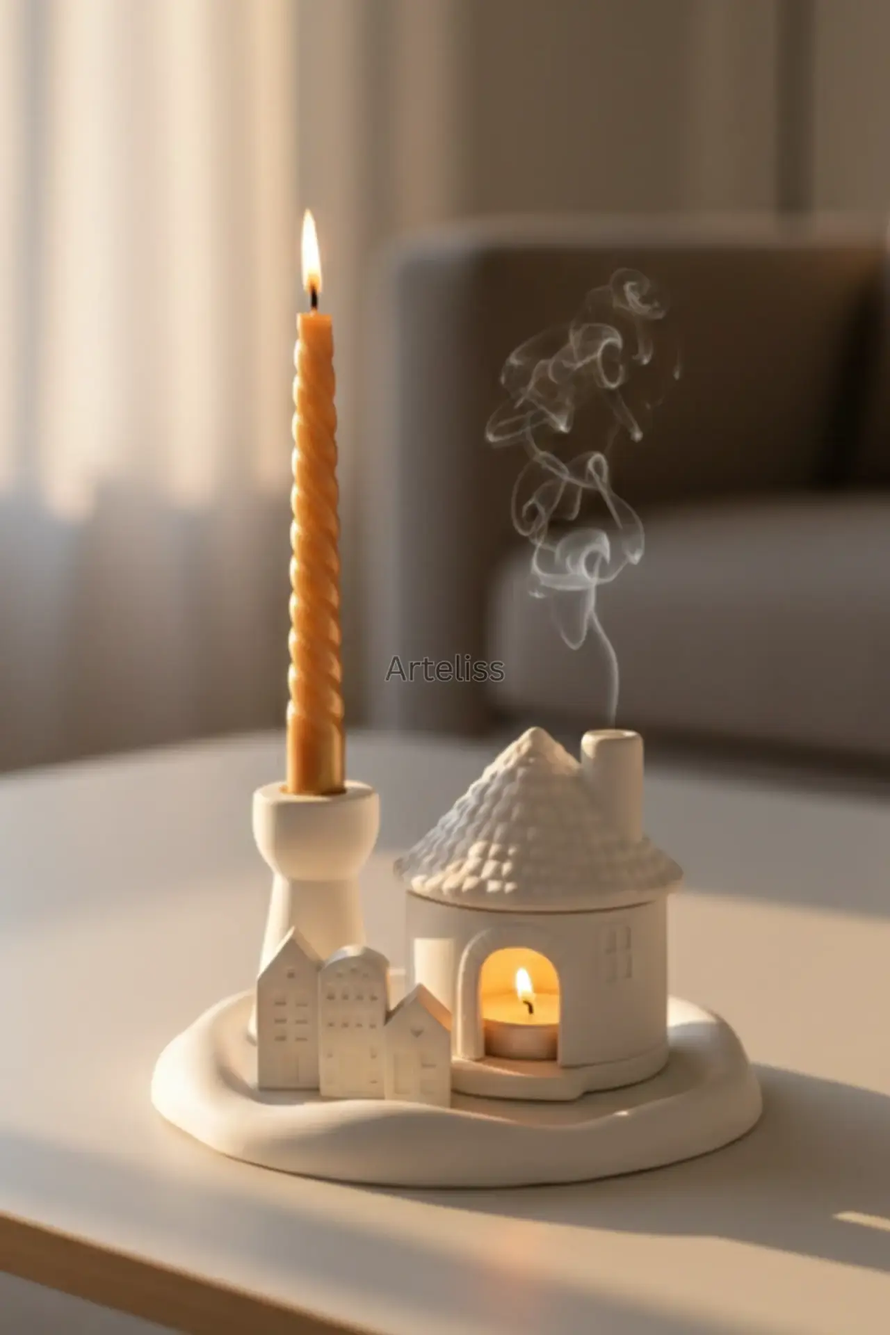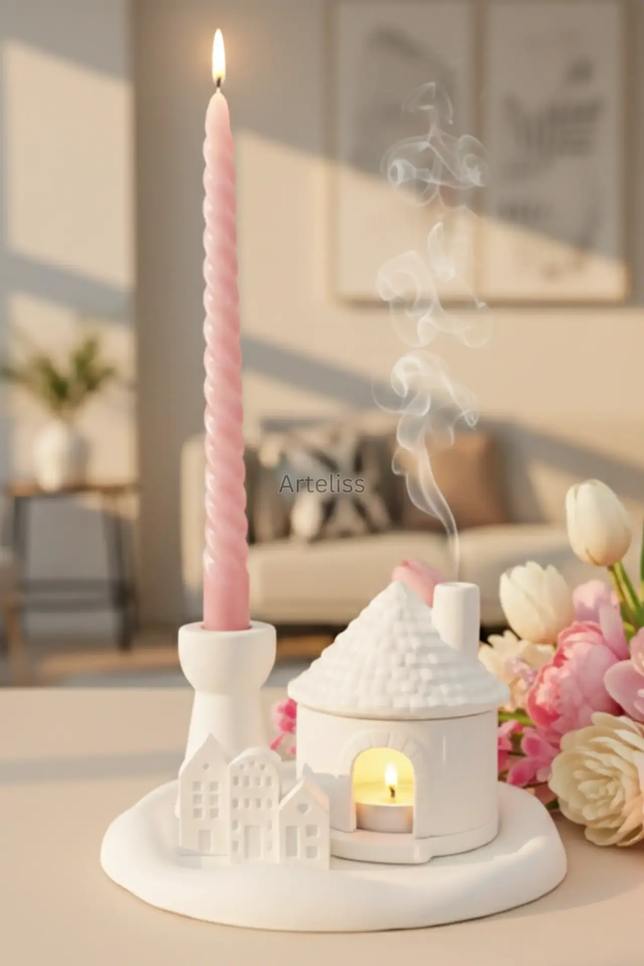 Arteliss® Smoky Cottage Dekoratif Tütsülük Mumluk Seti; bacalı özel tasarım ev mumluğu ve minyatür köy figürlerini amorf bir sunum tablası üzerinde bir araya getirerek yaşam alanlarınızda masalsı bir dekor alanı oluşturur. Şamdan mumluğu ve tealight haznesi sayesinde hem şık bir aydınlatma hem de işlevsel bir dekoratif tütsülük olarak kullanılabilen bu set, dresuar ve raflarınızda sıcak bir İskandinav kasabası ambiyansı sergiler.