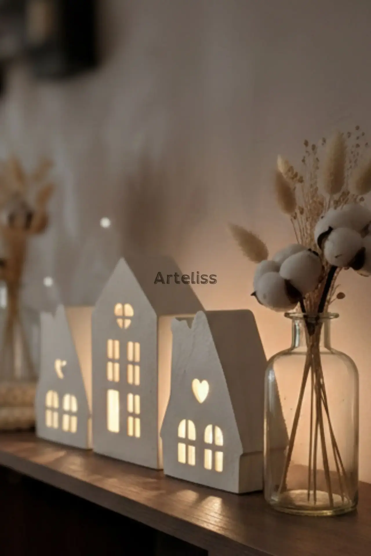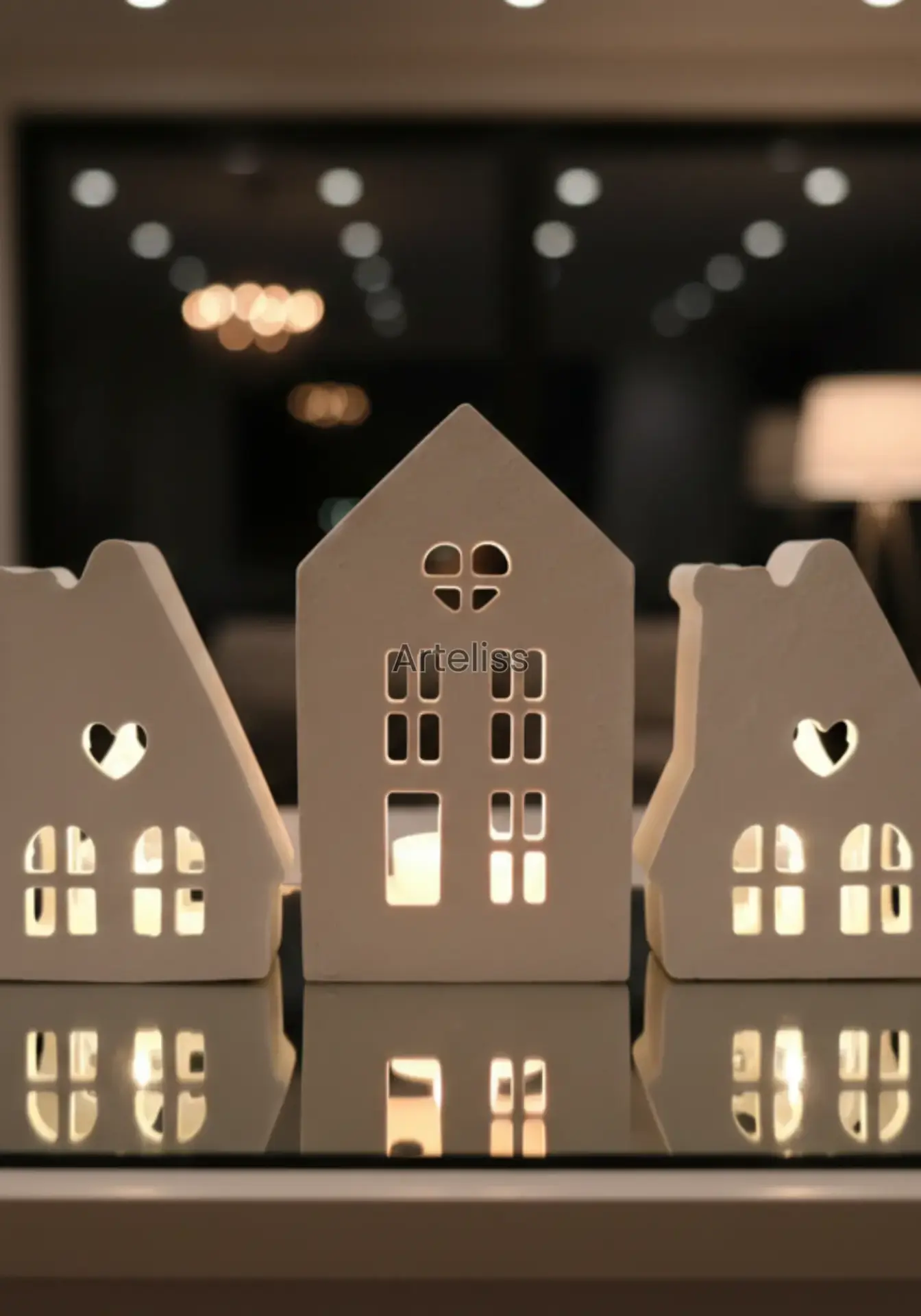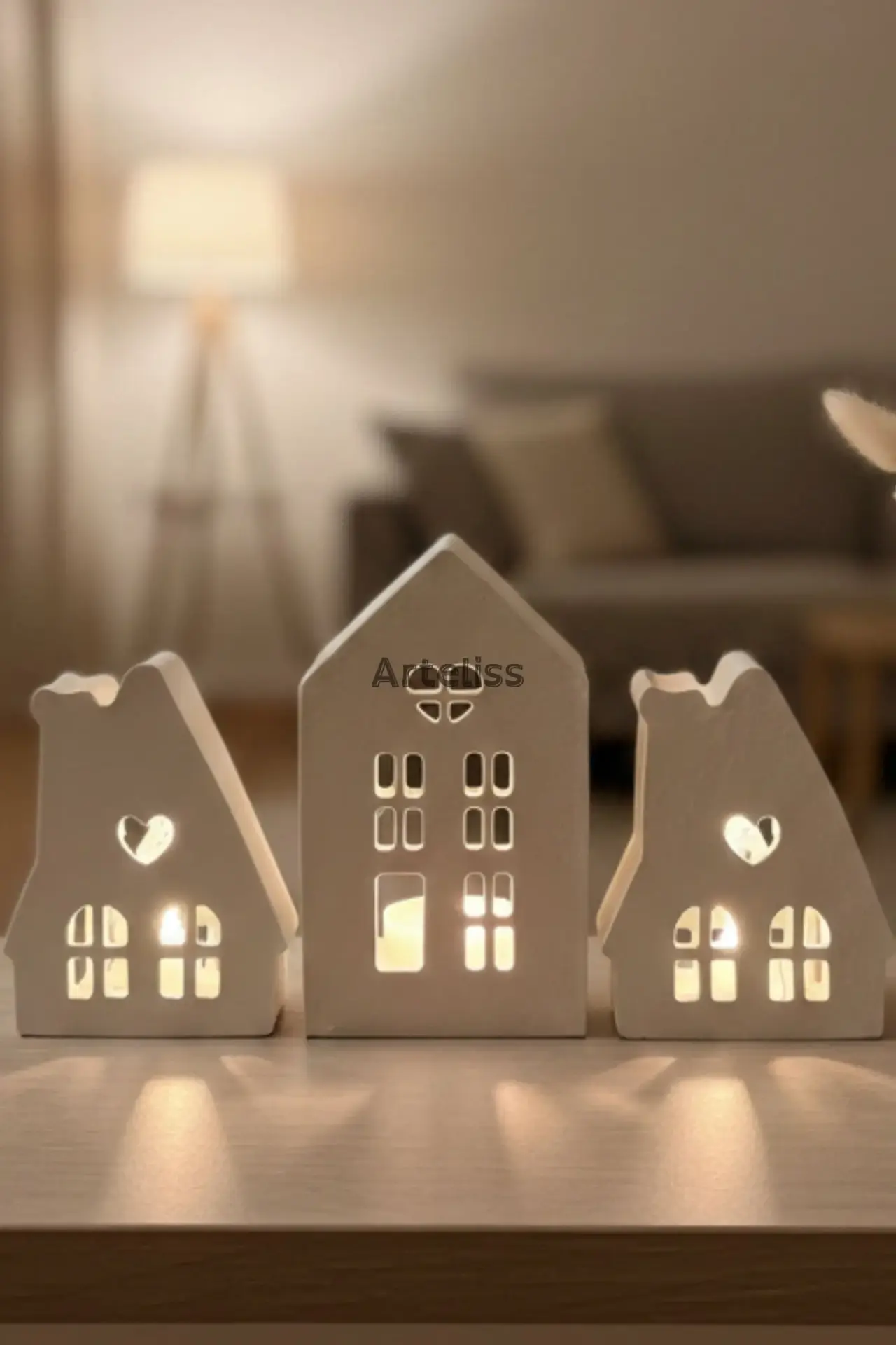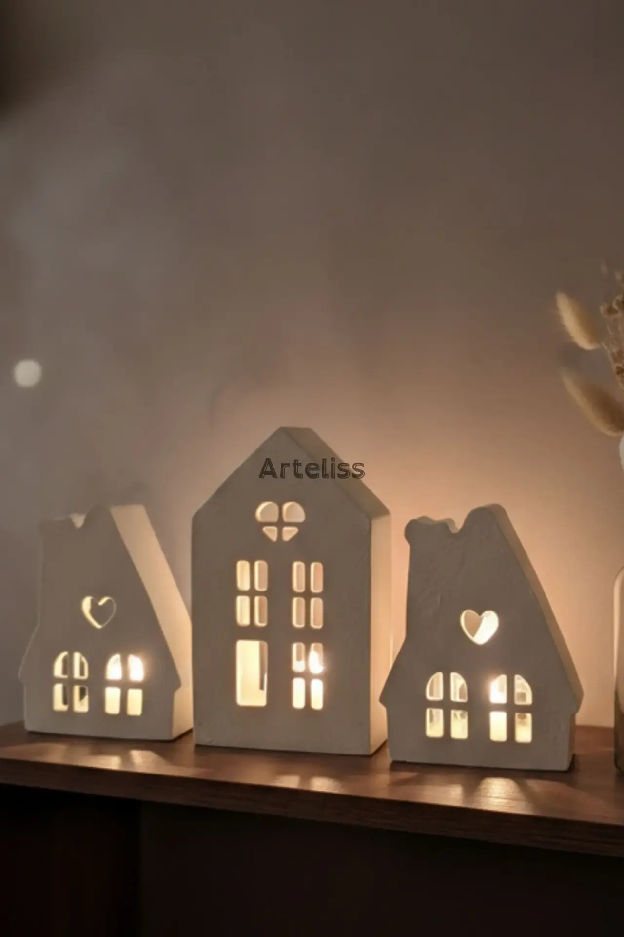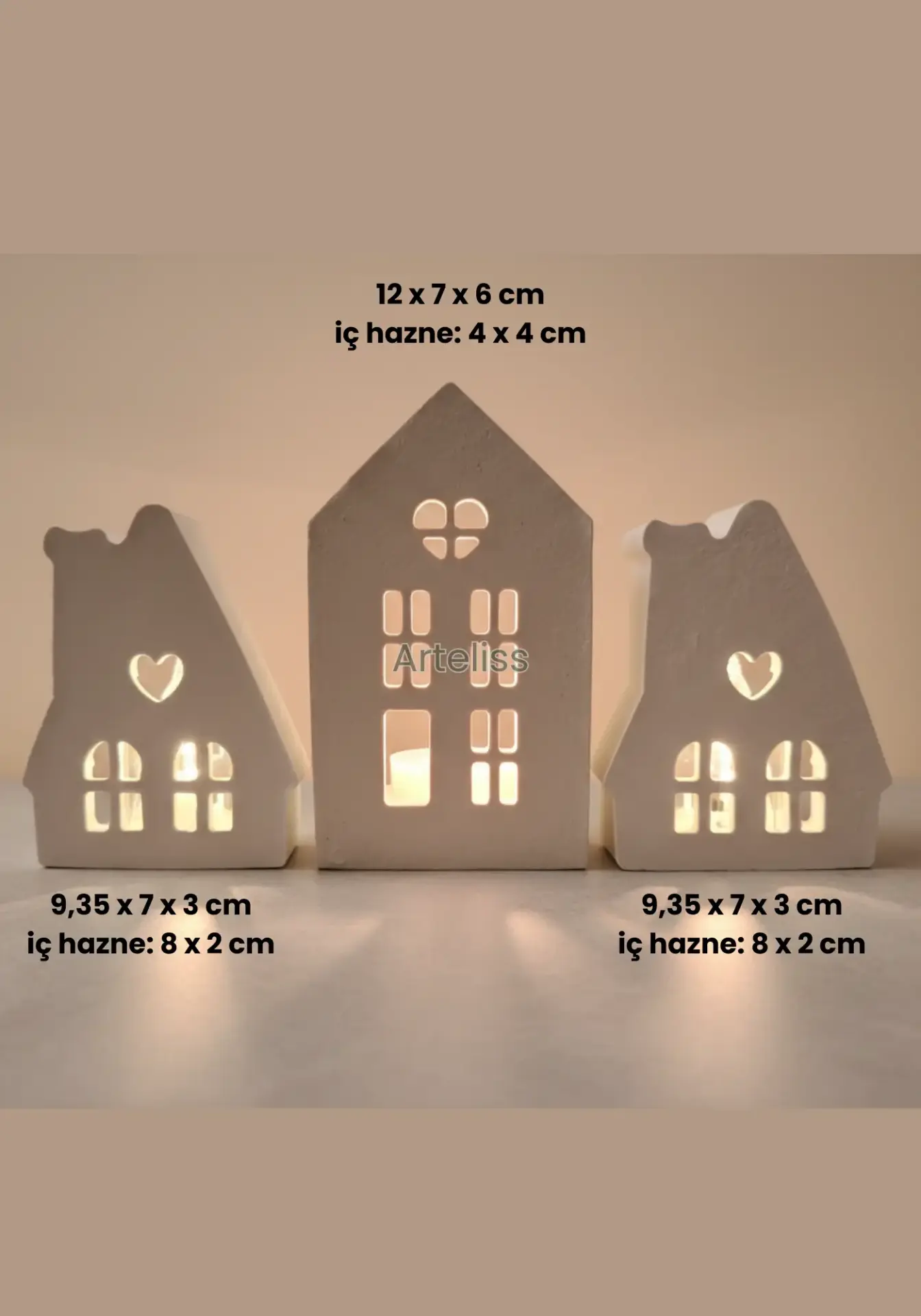 İçerisine yerleştirilen mum veya LED ışıklar sayesinde pencerelerinden süzülen yumuşak aydınlatma, bu şık ışıkevleri tasarımını dresuar, kitaplık veya TV ünitesi üzerinde sakinleştirici bir "gece şehri" siluetine dönüştürür. Gündüzleri heykelsi birer obje olarak estetik bir duruş sergileyen ışıkevleri, akşam saatlerinde ise yaşam alanlarınıza derinlik ve huzur katan bir ışık kaynağına dönüşür. Şehrin dinamizmini minimalist bir sükunetle buluşturan bu ışıkevleri koleksiyonu, sunum alanlarınızda modern mimarinin en zarif halini temsil eder. El işçiliğinin pürüzsüz kalitesini yansıtan bu üçlü ışıkevleri seti, yaşam alanlarında sadeliği ve sanatsal aydınlatmayı bir arada arayanlar için idealdir.