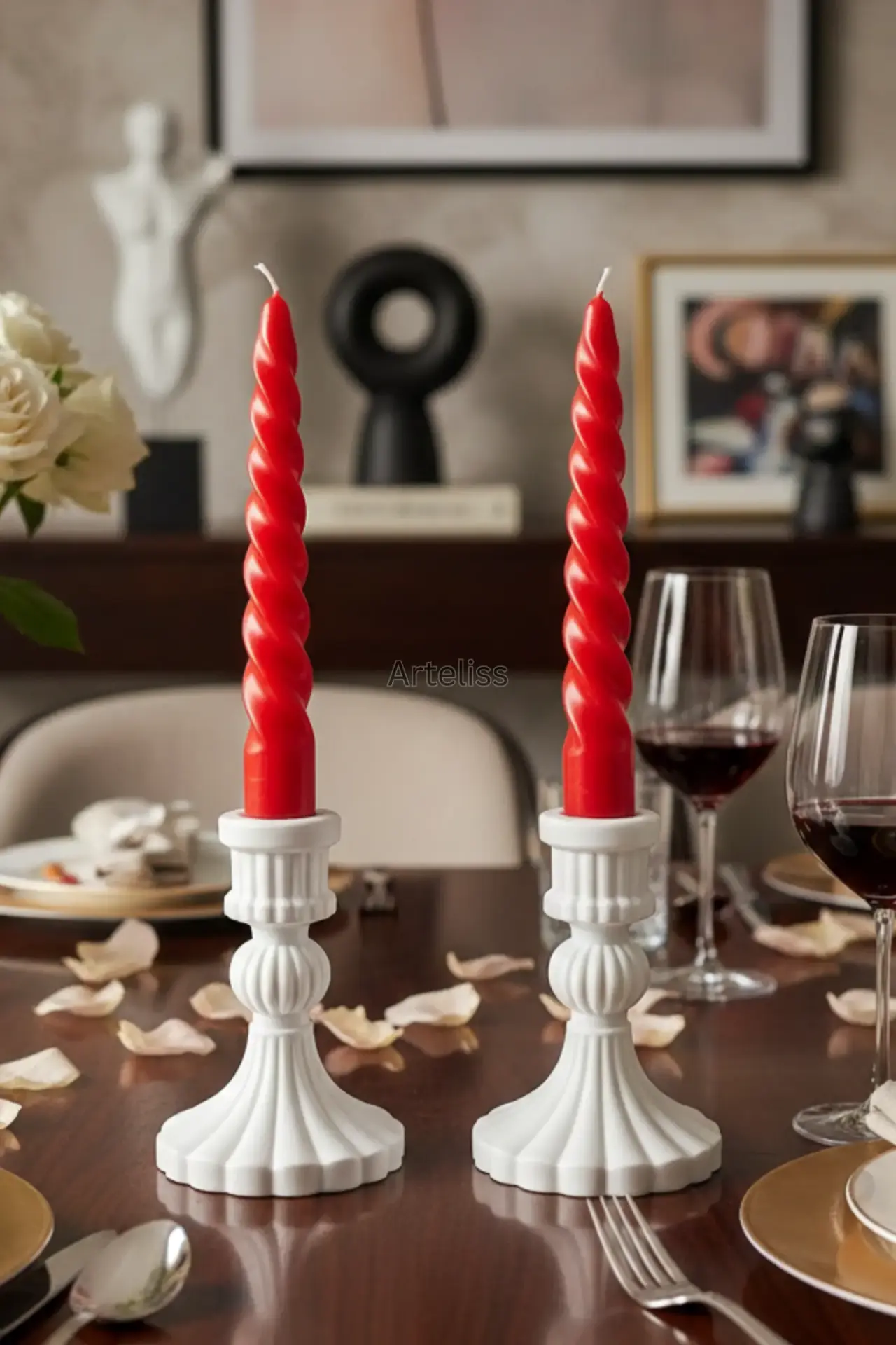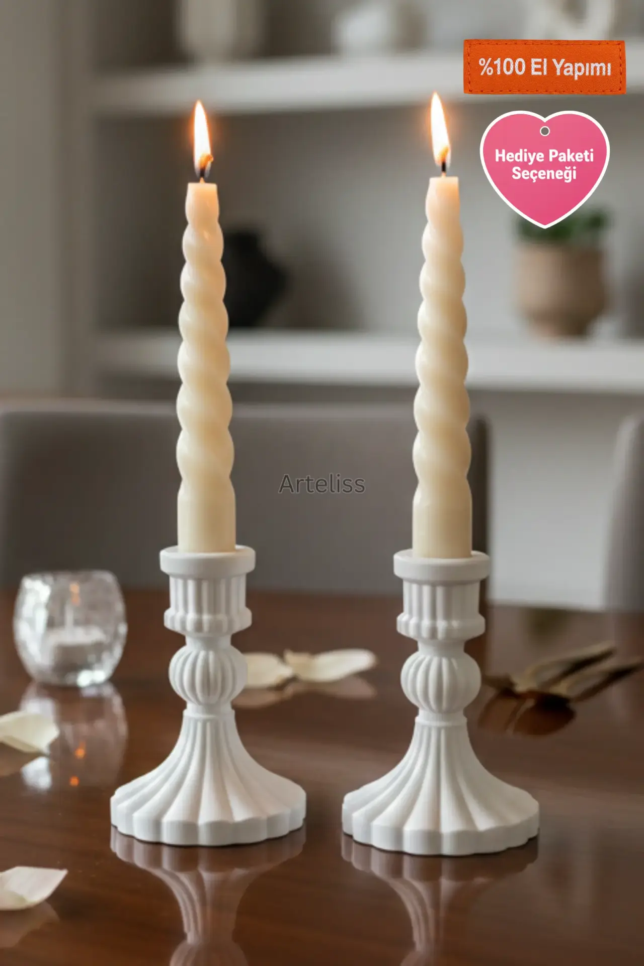 Arteliss® Vintage Royal koleksiyonu, klasik Avrupa mimarisinden ilham alan zarif hatlarıyla yemek masaları ve şömine üstlerinde asil bir aydınlatma odağı oluşturmak için tasarlanmıştır. Bu ikili vintage mumluk seti, dresuar dekorasyonlarınızda ve özel davet sofralarınızda zamansız bir estetik sergileyerek yaşam alanınıza nostaljik bir dokunuş katar.