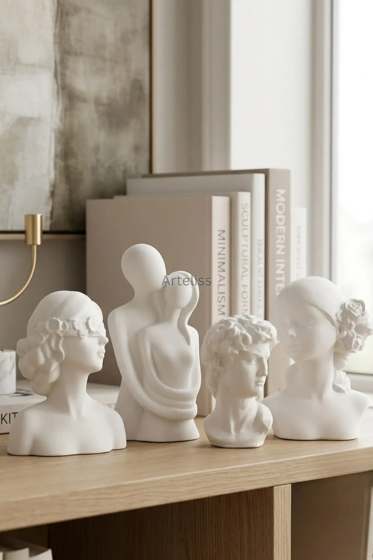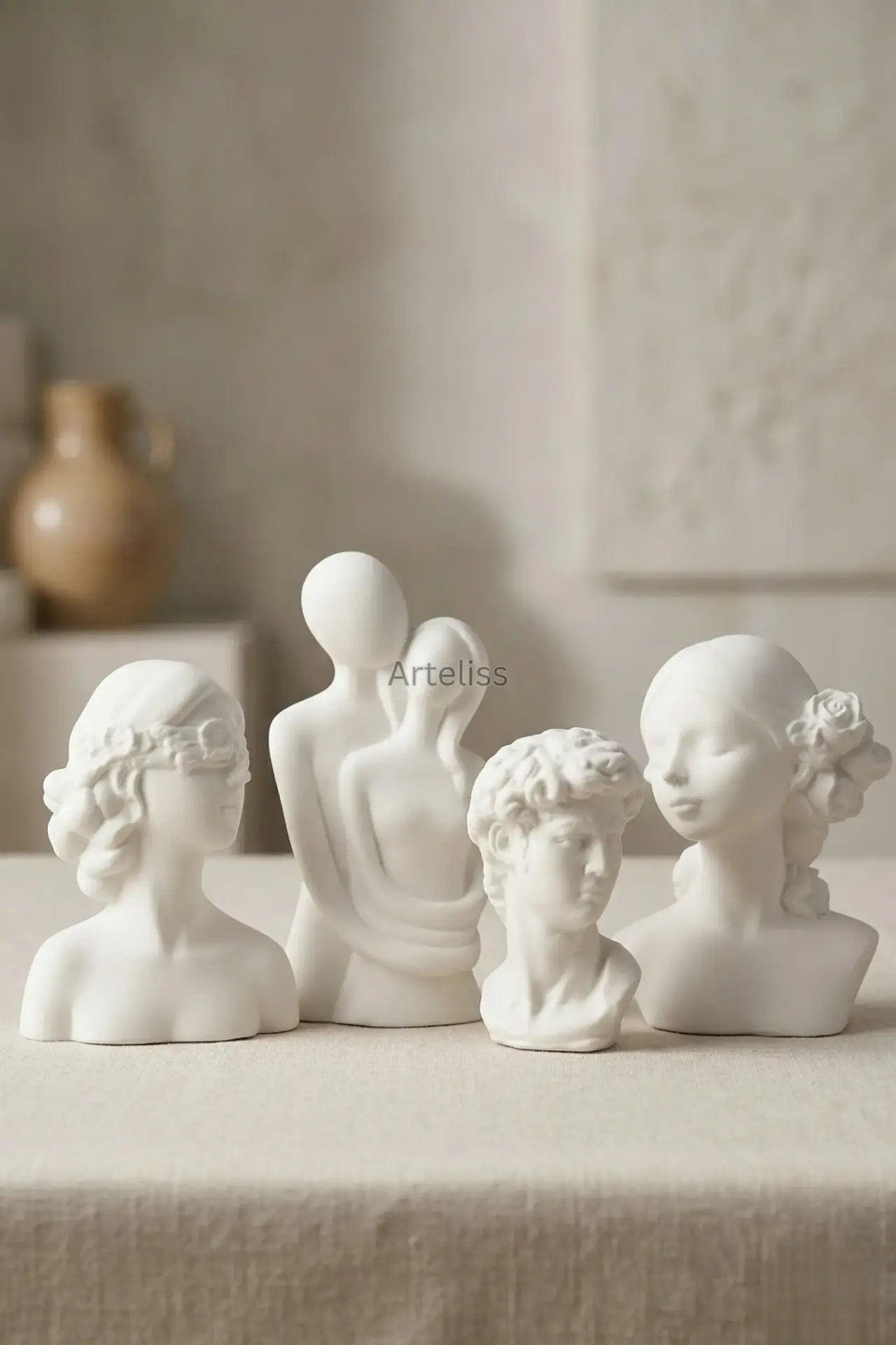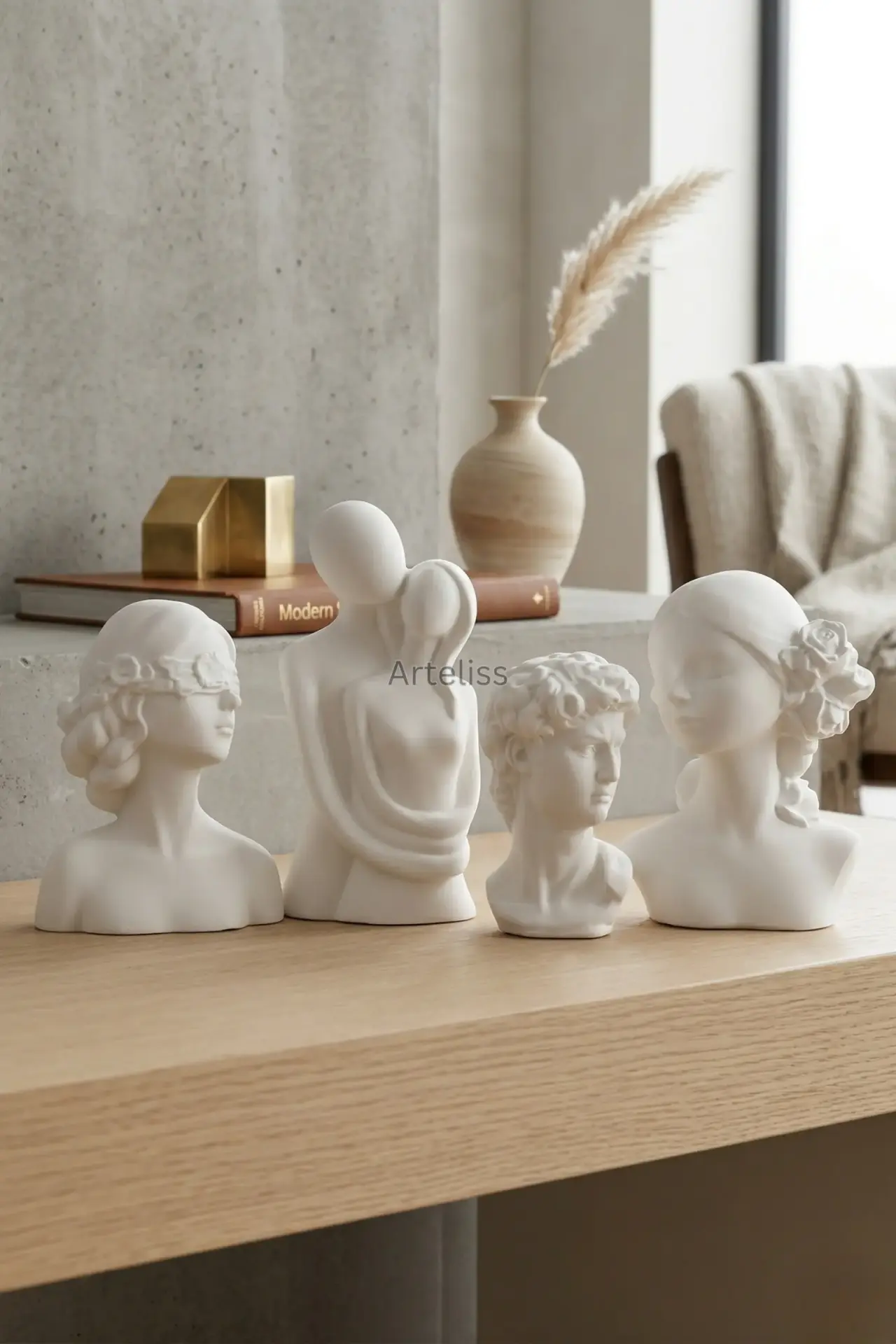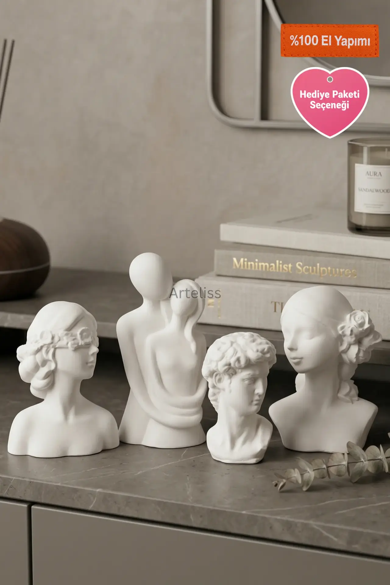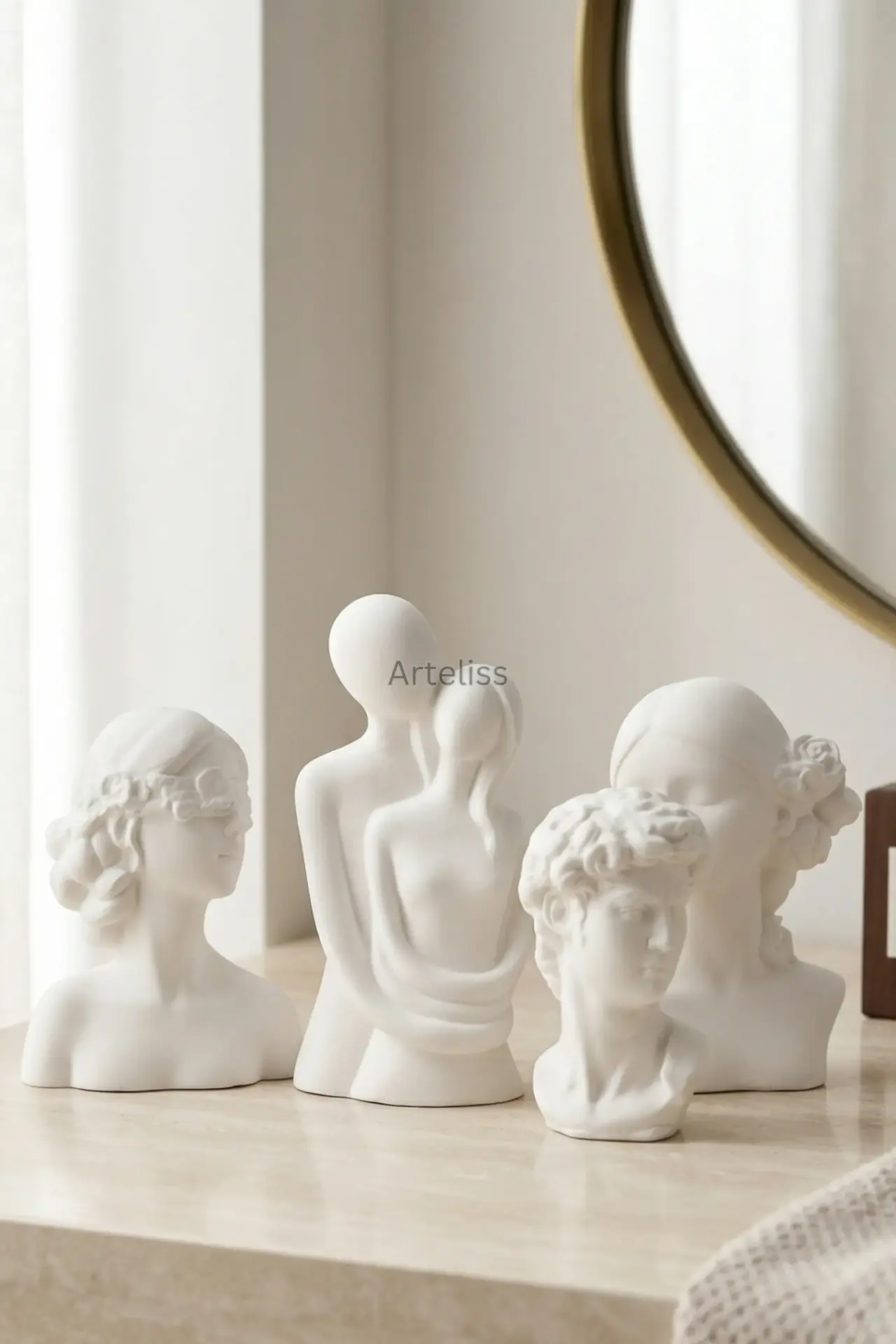 Arteliss® White Era koleksiyonu, klasik sanatın asaletini ve modern minimalizmin yalınlığını yaşam alanlarınıza taşır. Evinizde bir sanat galerisi atmosferi yaratmak için bir araya getirilen bu Dekoratif Biblo Seti; David büstü, romantik aşıklar figürü ve iki farklı kadın büstünden oluşan dört seçkin parçayı içerir. Mat beyazın saflığını taşıyan bu parçalar, dresuar, kitaplık veya çalışma masalarında sanatsal bir duruş sergiler.